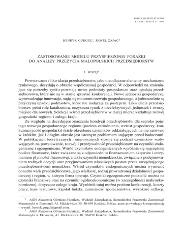 PRZEGLĄD STATYSTYCZNY R. LXIII – ZESZYT 4 – 2016 HENRYK GURGUL1, PAWEŁ ZAJĄC2 ZASTOSOWANIE MODELU PRZYSPIESZONEJ PORAŻKI DO ANALIZY PRZEŻYCIA MAŁOPOLSKICH PRZEDSIĘBIORSTW 1. WSTĘP Powstawanie i likwidacja przedsiębiorstw, jako nieodłączne elementy mechanizmu rynkowego, decydują o obrazie współczesnej gospodarki. W odpowiedzi na zmieniające się potrzeby rynku powstają nowe podmioty gospodarcze oraz upadają przedsiębiorstwa, które nie są w stanie sprostać konkurencji. Nowe jednostki gospodarcze, wprowadzając innowacje, stają się motorem rozwoju gospodarczego, a jednocześnie są przyczyną upadku podmiotów, które nie nadążają za postępem. Likwidacja przedsiębiorstw pełni rolę katalizatora, oczyszcza rynek z nieefektywnych jednostek i tworzy miejsce dla nowych. Selekcja wśród przedsiębiorstw w dużej mierze kształtuje rozwój gospodarki regionu i całego kraju. Ze względu na decydujące znaczenie kondycji przedsiębiorstw dla szeroko pojętego rozwoju gospodarczego regionu (poziom zatrudnienia, wzrost gospodarczy, konkurencyjność gospodarki) ścisłe określenie czynników oddziałujących na nie zarówno w krótkim, jak i długim okresie jest istotnym problemem stojącym przed badaczami. W publikacjach teoretycznych i empirycznych stosuje się podział czynników wpływających na powstawanie, rozwój i przeżywalność przedsiębiorstw na czynniki endogeniczne i egzogeniczne. Wśród czynników endogenicznych wyróżnia się najczęściej bodźce finansowe, które związane są z odpowiednim finansowaniem aktywów i utrzymaniem płynności finansowej, a także czynniki menedżerskie, związane z podejmowaniem trafnych decyzji oraz przyjmowaniem właściwych postaw przez zarządzającego przedsiębiorstwem menedżera. Wśród czynników endogenicznych można wymienić ponadto wiek przedsiębiorstwa, jego wielkość, rodzaj prowadzonej działalności gospodarczej i region, w którym firma operuje. Czynniki egzogeniczne podzielić można na czynniki branżowe oraz na czynniki ogólnoekonomiczne (w szczególności makroekonomiczne), dotyczące całego kraju. Wyróżnić tutaj można poziom konkurencji, koszty pracy, kurs walutowy, kapitał ludzki, zamożność społeczeństwa, wysokość inflacji, 1 AGH Akademia Górniczo-Hutnicza, Wydział Zarządzania, Samodzielna Pracownia Zastosowań Matematyki w Ekonomii, Al. Mickiewicza 30, 30-059 Kraków, Polska, autor prowadzący korespondencję – e-mail: [email protected]. 2 AGH Akademia Górniczo-Hutnicza, Wydział Zarządzania, Samodzielna Pracownia Zastosowań Matematyki w Ekonomii, Al. Mickiewicza 30, 30-059 Kraków, Polska. 392 Henryk Gurgul, Paweł Zając dostępność kredytów, poziom biurokracji, stabilność przepisów, wysokość podatków, postęp technologiczny. Nie bez znaczenia pozostaje również pomoc finansowa ze środków Funduszy Europejskich oraz pomoc instytucji wspierania biznesu w regionie. W rzeczywistości często zdarza się, że czynniki zewnętrzne stymulują te wewnętrzne, w równej mierze dotyczy to zarówno rozwoju jak i upadłości przedsiębiorstw. Tematyką demografii przedsiębiorstw w Polsce zajmowały się m.in. Ptak-Chmielewska (2010) i Markowicz (2012). W swoich badaniach korzystały one z narzędzi analizy czasu trwania, w tym z tablic trwania, estymatora Kaplana-Meiera, modelu Coxa oraz modeli logitowych. Z modelem logitowym pracował również Pociecha (2012), przeanalizował on zalety i ograniczenia stosowalności modelu w badaniach bankructw w Polsce. Nehrebecka, Dzik (2013) wykorzystując regresję logistyczną analizowały wpływ indywidualnych danych bilansowych oraz danych z raportu dochodów polskich spółek na prawdopodobieństwo bankructwa polskich przedsiębiorstw. Przedmiotem niniejszego artykułu jest weryfikacja wpływu szeregu czynników mierzalnych na dynamikę populacji przedsiębiorstw w Małopolsce. Wykorzystanie metod analizy przeżycia, w tym w szczególności modelu przyspieszonej porażki, pozwoli sprecyzować, w jaki sposób czynniki związane z miejscem i rodzajem rozpoczęcia działalności gospodarczej wpływają na czas jej trwania. 2. PRZEGLĄD LITERATURY Powody skłaniające ludzi do rozpoczynania działalności gospodarczej mogą być bardzo zróżnicowane. Według van Praag (1996) decyzja o założeniu firmy jest pochodną chęci i możliwości. Opisując „chęci” wskazuje ona bardziej szczegółowo na indywidualne preferencje uzależnione od posiadanych cech charakteru przedsiębiorcy. Chęci zależą również w znacznej mierze od występowania opcji alternatywnych i ich atrakcyjności w oczach potencjalnego przedsiębiorcy. Mówiąc o „możliwościach”, badaczka wskazuje na czynniki mikroekonomiczne, np. dostępność kapitału początkowego, i makroekonomiczne, związane z ogólną koniunkturą gospodarczą. W sposób naturalny koniunkturę gospodarczą w regionie można łączyć z rynkiem pracy. Już Knight (1921) twierdził, że człowiek ma trzy wyjścia, może być bezrobotny, może zostać pracownikiem najemnym, albo może się sam zatrudnić. W związku z tym decyzja o założeniu działalności gospodarczej wynika z prostej kalkulacji zysków i strat płynących z wyboru poszczególnych ścieżek. Można zatem na czynniki rozwoju przedsiębiorczości spojrzeć w ten sposób, że determinantą decyzji o uruchomieniu własnego przedsiębiorstwa jest zmniejszenie atrakcyjności alternatyw, czyli zredukowanie świadczeń przysługujących bezrobotnym lub spadek atrakcyjności pracy na stanowisku najemnym, wynikający np. ze wzrostu konkurencji spowodowanego wzrostem bezrobocia. Decyzja o założeniu działalności gospodarczej jest silnie uzależniona od czynników geograficznych (Armington, Acs, 2002). Fritsch (1997) twierdzi, że powstanie Zastosowanie modelu przyspieszonej porażki do analizy przeżycia małopolskich przedsiębiorstw 393 nawet połowy nowych przedsiębiorstw można wyjaśnić jedynie za pomocą
