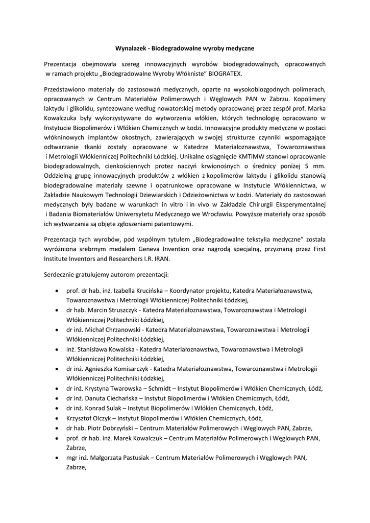 Wynalazek - Biodegradowalne wyroby medyczne Prezentacja obejmowała szereg innowacyjnych wyrobów biodegradowalnych, opracowanych w ramach projektu „Biodegradowalne Wyroby Włókniste” BIOGRATEX. Przedstawiono materiały do zastosowań medycznych, oparte na wysokobiozgodnych polimerach, opracowanych w Centrum Materiałów Polimerowych i Węglowych PAN w Zabrzu. Kopolimery laktydu i glikolidu, syntezowane według nowatorskiej metody opracowanej przez zespół prof. Marka Kowalczuka były wykorzystywane do wytworzenia włókien, których technologię opracowano w Instytucie Biopolimerów i Włókien Chemicznych w Łodzi. Innowacyjne produkty medyczne w postaci włókninowych implantów okostnych, zawierających w swojej strukturze czynniki wspomagające odtwarzanie tkanki zostały opracowane w Katedrze Materiałoznawstwa, Towaroznawstwa i Metrologii Włókienniczej Politechniki Łódzkiej. Unikalne osiągnięcie KMTiMW stanowi opracowanie biodegradowalnych, cienkościennych protez naczyń krwionośnych o średnicy poniżej 5 mm. Oddzielną grupę innowacyjnych produktów z włókien z kopolimerów laktydu i glikolidu stanowią biodegradowalne materiały szewne i opatrunkowe opracowane w Instytucie Włókiennictwa, w Zakładzie Naukowym Technologii Dziewiarskich i Odzieżownictwa w Łodzi. Materiały do zastosowań medycznych były badane w warunkach in vitro i in vivo w Zakładzie Chirurgii Eksperymentalnej i Badania Biomateriałów Uniwersytetu Medycznego we Wrocławiu. Powyższe materiały oraz sposób ich wytwarzania są objęte zgłoszeniami patentowymi. Prezentacja tych wyrobów, pod wspólnym tytułem „Biodegradowalne tekstylia medyczne” została wyróżniona srebrnym medalem Geneva Invention oraz nagrodą specjalną, przyznaną przez First Institute Inventors and Researchers I.R. IRAN. Serdecznie gratulujemy autorom prezentacji: prof. dr hab. inż. Izabella Krucińska – Koordynator projektu, Katedra Materiałoznawstwa, Towaroznawstwa i Metrologii Włókienniczej Politechniki Łódzkiej, dr hab. Marcin Struszczyk - Katedra Materiałoznawstwa, Towaroznawstwa i Metrologii Włókienniczej Politechniki Łódzkiej, dr inż. Michał Chrzanowski - Katedra Materiałoznawstwa, Towaroznawstwa i Metrologii Włókienniczej Politechniki Łódzkiej, inż. Stanisława Kowalska - Katedra Materiałoznawstwa, Towaroznawstwa i Metrologii Włókienniczej Politechniki Łódzkiej, dr inż. Agnieszka Komisarczyk - Katedra Materiałoznawstwa, Towaroznawstwa i Metrologii Włókienniczej Politechniki Łódzkiej, dr inż. Krystyna Twarowska – Schmidt – Instytut Biopolimerów i Włókien Chemicznych, Łódź, dr inż. Danuta Ciechańska – Instytut Biopolimerów i Włókien Chemicznych, Łódź, dr inż. Konrad Sulak – Instytut Biopolimerów i Włókien Chemicznych, Łódź, Krzysztof Olczyk – Instytut Biopolimerów i Włókien Chemicznych, Łódź, dr hab. Piotr Dobrzyński – Centrum Materiałów Polimerowych i Węglowych PAN, Zabrze, prof. dr hab. inż. Marek Kowalczuk – Centrum Materiałów Polimerowych i Węglowych PAN, Zabrze, mgr inż. Małgorzata Pastusiak – Centrum Materiałów Polimerowych i Węglowych PAN, Zabrze, mgr inż. Michał Sobota – Centrum Materiałów Polimerowych i Węglowych PAN, Zabrze, dr Elżbieta Mielicka - Zakład Naukowy Technologii Dziewiarskich i Odzieżownictwa, Instytut Włókiennictwa, Łódź, dr Anna Pinar - Zakład Naukowy Technologii Dziewiarskich i Odzieżownictwa, Instytut Włókiennictwa, Łódź, dr Bogusława Żywicka - Zakład Chirurgii Eksperymentalnej i Badania Biomateriałów Uniwersytetu Medycznego we Wrocławiu mgr inż. Olga Chrzanowska - Katedra Materiałoznawstwa, Towaroznawstwa i Metrologii Włókienniczej Politechniki Łódzkiej,