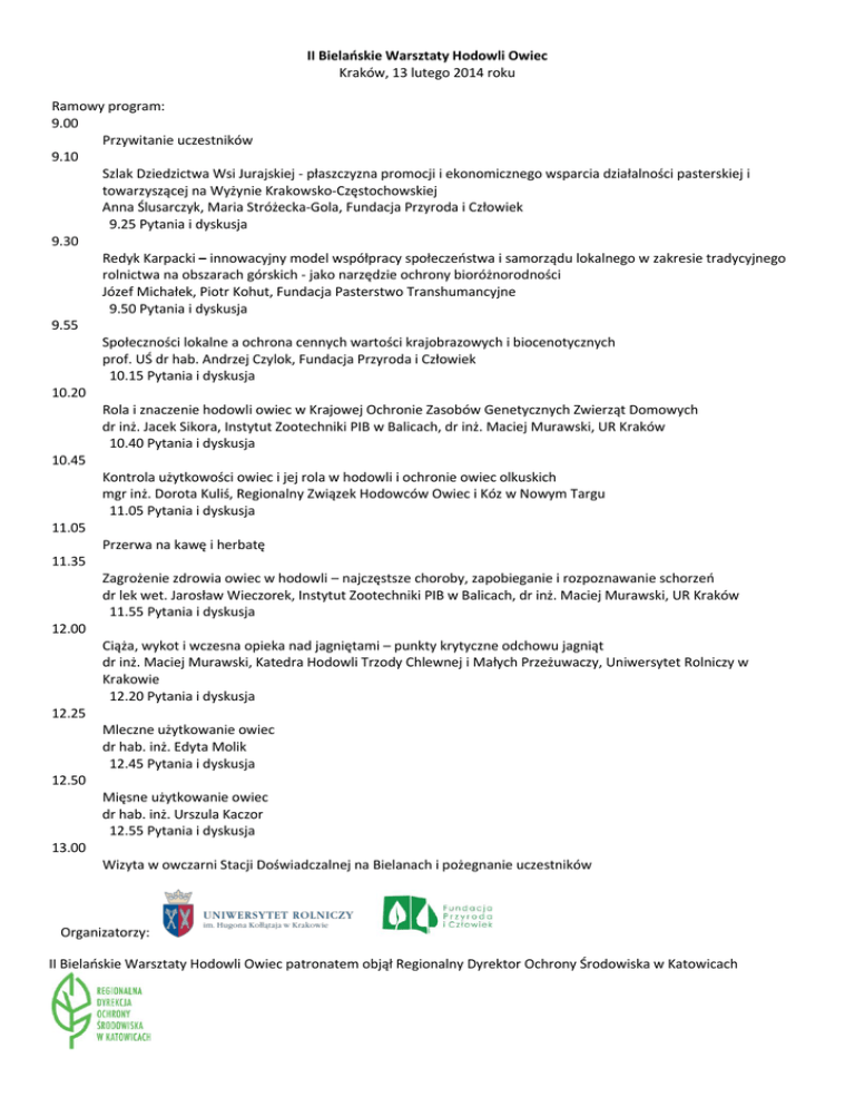 II Bielańskie Warsztaty Hodowli Owiec Kraków, 13 lutego 2014 roku Ramowy program: 9.00 Przywitanie uczestników 9.10 Szlak Dziedzictwa Wsi Jurajskiej - płaszczyzna promocji i ekonomicznego wsparcia działalności pasterskiej i towarzyszącej na Wyżynie Krakowsko-Częstochowskiej Anna Ślusarczyk, Maria Stróżecka-Gola, Fundacja Przyroda i Człowiek 9.25 Pytania i dyskusja 9.30 Redyk Karpacki – innowacyjny model współpracy społeczeństwa i samorządu lokalnego w zakresie tradycyjnego rolnictwa na obszarach górskich - jako narzędzie ochrony bioróżnorodności Józef Michałek, Piotr Kohut, Fundacja Pasterstwo Transhumancyjne 9.50 Pytania i dyskusja 9.55 Społeczności lokalne a ochrona cennych wartości krajobrazowych i biocenotycznych prof. UŚ dr hab. Andrzej Czylok, Fundacja Przyroda i Człowiek 10.15 Pytania i dyskusja 10.20 Rola i znaczenie hodowli owiec w Krajowej Ochronie Zasobów Genetycznych Zwierząt Domowych dr inż. Jacek Sikora, Instytut Zootechniki PIB w Balicach, dr inż. Maciej Murawski, UR Kraków 10.40 Pytania i dyskusja 10.45 Kontrola użytkowości owiec i jej rola w hodowli i ochronie owiec olkuskich mgr inż. Dorota Kuliś, Regionalny Związek Hodowców Owiec i Kóz w Nowym Targu 11.05 Pytania i dyskusja 11.05 Przerwa na kawę i herbatę 11.35 Zagrożenie zdrowia owiec w hodowli – najczęstsze choroby, zapobieganie i rozpoznawanie schorzeń dr lek wet. Jarosław Wieczorek, Instytut Zootechniki PIB w Balicach, dr inż. Maciej Murawski, UR Kraków 11.55 Pytania i dyskusja 12.00 Ciąża, wykot i wczesna opieka nad jagniętami – punkty krytyczne odchowu jagniąt dr inż. Maciej Murawski, Katedra Hodowli Trzody Chlewnej i Małych Przeżuwaczy, Uniwersytet Rolniczy w Krakowie 12.20 Pytania i dyskusja 12.25 Mleczne użytkowanie owiec dr hab. inż. Edyta Molik 12.45 Pytania i dyskusja 12.50 Mięsne użytkowanie owiec dr hab. inż. Urszula Kaczor 12.55 Pytania i dyskusja 13.00 Wizyta w owczarni Stacji Doświadczalnej na Bielanach i pożegnanie uczestników Organizatorzy: II Bielańskie Warsztaty Hodowli Owiec patronatem objął Regionalny Dyrektor Ochrony Środowiska w Katowicach