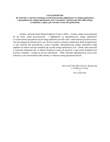 UZASADNIENIE do uchwały w sprawie ustalenia zasad ponoszenia odpłatności za usługi opiekuńcze i specjalistyczne usługi opiekuńcze oraz warunków częściowego lub całkowitego zwolnienia z opłat, jak również trybu ich pobierania Zmiana uchwały Rady Miasta Podkowa Leśna z 2004 r. wynika z faktu wprowadzenia do jej treści zasad przyznawania i odpłatności za specjalistyczne usługi opiekuńcze (z wyłączeniem specjalistycznych usług opiekuńczych dla osób z zaburzeniami psychicznymi). Ten typ usług przewidziany jest w art. 50 ust.4 ustawy o pomocy społecznej. Brak uregulowania w tym zakresie był przeszkodą w pracy Ośrodka. Specjalistyczne usługi opiekuńcze będą odpłatne na takich samych zasadach jak zwykłe usługi opiekuńcze (§ 6 – tabela, taka sama jak w uchwale uchylanej) tak, że Miasto Podkowa Leśna nie poniesie z tego tytułu dodatkowych kosztów. Ponadto, z uwagi na rok jej uchwalenia – 2004, należało zaproponować nową treść uchwały, a nie wprowadzać tylko zmiany w zakresie usług specjalistycznych. Kierownik Ośrodka Pomocy Społecznej w Podkowie Leśnej /-/ Ewa Zalewska