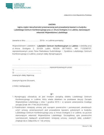 Załącznik nr 4 do Regulaminu Przetargu UMOWA najmu części nieruchomości przeznaczonej pod prowadzenie kawiarni w budynku Lubelskiego Centrum Konferencyjnego przy ul. Artura Grottgera 2 w Lublinie, stanowiącym własność Województwa Lubelskiego zawarta w dniu …........................... 2016 r. w Lublinie pomiędzy: Województwem Lubelskim - Lubelskim Centrum Konferencyjnym w Lublinie z siedzibą przy ul. Artura Grottgera 2, 20-029 Lublin, REGON: 061743021, NIP: 7123290737, reprezentowanym przez Pana Radosława Dudzińskiego – Dyrektora Lubelskiego Centrum Konferencyjnego w Lublinie, zwanym dalej Wynajmującym, a …...........................................................….............................................................................................…............ ...............................................…................................reprezentowaną/ym przez: 1) ……………………… - ……………………….., 2) ……………………… - ………………………..., zwaną/ym dalej Najemcą, zwanymi łącznie Stronami, o treści następującej: §1 1. Wynajmujący oświadcza, że jest trwałym zarządcą obiektu Lubelskiego Centrum Konferencyjnego w Lublinie, który włada obiektem na podstawie decyzji Zarządu Województwa Lubelskiego z dnia 1 grudnia 2015 r. w sprawie ustanowienia trwałego zarządu [znak: MI-I.7740.29.2015.NAU]. 2. Przedmiotem niniejszej umowy jest wynajem powierzchni i pomieszczeń, określonych w § 2 umowy, przeznaczonych pod prowadzenie kawiarni, położonych w budynku Lubelskiego Centrum Konferencyjnego przy ul. Artura Grottgera 2 w Lublinie, na gruncie stanowiącym własność Województwa Lubelskiego. Szczegółowy opis powierzchni i pomieszczeń, będących przedmiotem niniejszej umowy, zwanych dalej „Lokalem”, znajduje się w Załączniku nr 1 do umowy. Strona 1 z 15 Załącznik nr 4 do Regulaminu Przetargu 3. Lokal będzie wykorzystywany przez Najemcę do celów gospodarczych, odpowiadających charakterowi i rozmiarowi prowadzonej przez Najemcę działalności, tj. pod prowadzenie w nim kawiarni. Najemca jest zobowiązany do uzyskania na swój koszt wszelkich wymaganych prawem koncesji i zezwoleń niezbędnych do prowadzenia w przedmiocie najmu działalności gospodarczej określonej w niniejszym paragrafie. 4. Strony zgodnie ustalają, że w każdym roku obowiązywania umowy, wyłączeniu z wynajmu może podlegać powierzchnia 107 m2 Lokalu kawiarni i/lub zajmowana przez Najemcę całość lub część patio, tj. maksymalnie 99,3 m2 patio, – tzw. powierzchnia czasowo wyłączana z wynajmu. Ilość dni wyłączenia nie może przekroczyć w danym roku 5. Jako dzień kwalifikuje się każdą rozpoczętą godzinę wyłączenia powierzchni w danej dobie, przypadającą na godziny otwarcia kawiarni. Wyłączenie następuje w terminie wskazanym przez Wynajmującego, za co najmniej 15-dniowym uprzedzeniem. Wynajmujący poinformuje Najemcę o wyłączeniu przedmiotowej powierzchni z wynajmu w drodze email na adres: ………………………… lub pisemnie. 5. W przypadku określonym w ust. 2, Najemca ma obowiązek usunąć się z powierzchni wyłączanej z wynajmu w terminie i na czas wskazany przez Wynajmującego, tj. w szczególności opróżnić powierzchnię z rzeczy i osób, reprezentujących jego prawa. §2 Wynajmujący oddaje Najemcy do używania Lokal, tj.: - powierzchnię kawiarnianą położoną na 1 kondygnacji nadziemnej (parter), stanowiącą integralną część atrium LCK; - pomieszczenia socjalne i magazyn pomocniczy dla kawiarni położone na poziomie -1 - patio niezadaszone znajdujące się na poziomie 1 (parter) [opcja]. §3 1. Niniejsza umowa zostaje zawarta na okres 10 lat, liczonych od dnia jej zawarcia. 2. Po upływie terminu, o którym mowa w ust. 1, Najemca zobowiązuje się do zwrotu na rzecz Wynajmującego Lokalu w stanie niepogorszonym, ponad zużycie lokalu będące następstwem jego prawidłowego używania. 3. Najpóźniej w dniu zawarcia umowy, Najemca wpłaci tytułem zabezpieczenia należytego wykonania umowy na rachunek bankowy Wynajmującego kwotę kaucji w wysokości 3krotności miesięcznego czynszu najmu (brutto), określonego w § 5 ust. 1 pkt 2, tj. kwotę …………. PLN (słownie: ………………….. złotych). Kaucja będzie zdeponowana na oprocentowanym rachunku bankowym Wynajmującego. 4. Kaucja zabezpiecza roszczenia Wynajmującego w tym roszczenia akcesoryjne, jakie mogą powstać w związku lub przy okazji wykonania, niewykonania lub nienależytego Strona 2 z 15 Załącznik nr 4 do Regulaminu Przetargu wykonania umowy przez Najemcę, w tym roszczenia o zapłatę czynszu najmu, opłat określonych w § 5 ust. 7-9, kar umownych, odszkodowań, a także wynagrodzenia za bezumowne korzystanie z przedmiotu najmu. 5. Wynajmujący uprawniony jest do zaspokojenia się z powyższej kwoty kaucji w dowolnym momencie, w razie opóźnienia się Najemcy z zapłatą któregokolwiek z roszczeń Wynajmującego, zabezpieczanych przez kaucję, chociażby o jeden dzień. Podstawą pokrycia roszczeń Wynajmującego z kaucji jest wystawienie przez Wynajmującego noty obciążeniowej. 6. W przypadku zaspokojenia roszczeń Wynajmującego z kaucji, z całej jej kwoty bądź jej części, Najemca zobowiązany jest do uzupełnienia kwoty kaucji do wysokości określonej w ust. 3 w terminie 7 (słownie: siedmiu) dni od dnia doręczenia mu wystawionej przez Wynajmującego noty obciążeniowej, o której mowa w ust. 5. 7. Kwota kaucji, zostanie zwrócona Najemcy na wskazany przez niego rachunek bankowy nie później niż w terminie 45 dni od dnia zwrotu Lokalu, po uprzednim odliczeniu przez Wynajmującego wszelkich kwot, do pobrania których Wynajmujący jest uprawniony zgodnie z niniejszą Umową, pod warunkiem otrzymania przez Wynajmującego pełnej dokumentacji (faktur, rachunków, not obciążeniowych itp.), pozwalających na rozliczenie Najemcy z tytułu Umowy. §4 1.