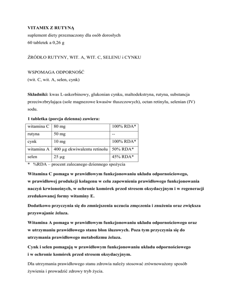 VITAMIX Z RUTYNĄ suplement diety przeznaczony dla osób dorosłych 60 tabletek a 0,26 g ŹRÓDŁO RUTYNY, WIT. A, WIT. C, SELENU i CYNKU WSPOMAGA ODPORNOŚĆ (wit. C, wit. A, selen, cynk) Składniki: kwas L-askorbinowy, glukonian cynku, maltodekstryna, rutyna, substancja przeciwzbrylająca (sole magnezowe kwasów tłuszczowych), octan retinylu, selenian (IV) sodu. 1 tabletka (porcja dzienna) zawiera: witamina C 80 mg 100% RDA* rutyna 50 mg -- cynk 10 mg 100% RDA* witamina A 400 µg ekwiwalentu retinolu 50% RDA* selen 25 µg 45% RDA* * %RDA – procent zalecanego dziennego spożycia Witamina C pomaga w prawidłowym funkcjonowaniu układu odpornościowego, w prawidłowej produkcji kolagenu w celu zapewnienia prawidłowego funkcjonowania naczyń krwionośnych, w ochronie komórek przed stresem oksydacyjnym i w regeneracji zredukowanej formy witaminy E. Dodatkowo przyczynia się do zmniejszenia uczucia zmęczenia i znużenia oraz zwiększa przyswajanie żelaza. Witamina A pomaga w prawidłowym funkcjonowaniu układu odpornościowego oraz w utrzymaniu prawidłowego stanu błon śluzowych. Poza tym przyczynia się do utrzymania prawidłowego metabolizmu żelaza. Cynk i selen pomagają w prawidłowym funkcjonowaniu układu odpornościowego i w ochronie komórek przed stresem oksydacyjnym. Dla utrzymania prawidłowego stanu zdrowia należy stosować zrównoważony sposób żywienia i prowadzić zdrowy tryb życia. Sposób użycia: zaleca się przyjmowanie 1 tabletki dziennie po posiłku, popijając wodą. Warunki przechowywania Przechowywać w sposób niedostępny dla małych dzieci, w temperaturze pokojowej. Chronić przed dostępem światła i wilgoci. Ostrzeżenia Nie przekraczać zalecanej porcji do spożycia w ciągu dnia. Suplement diety nie może być stosowany jako substytut zróżnicowanej diety. W okresie ciąży i karmienia piersią decyzję o stosowaniu powinno się konsultować z lekarzem. Najlepiej spożyć przed końcem Data minimalnej trwałości z boku opakowania Producent: Zakład Chemiczno-Farmaceutyczny „FARMAPOL” Sp. z o.o.; ul. Św. Wojciech 29; 61-749 Poznań Nr partii: /Najlepiej spożyć przed końcem: Kod kreskowy: 5907573300559