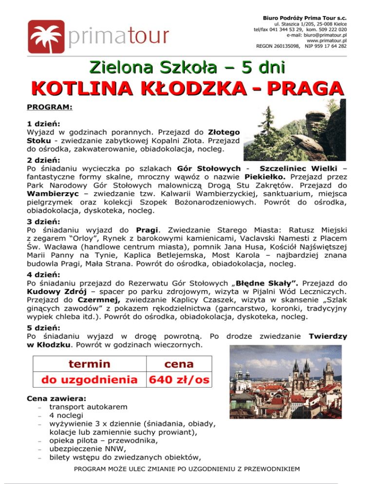 Biuro Podróży Prima Tour s.c. ul. Staszica 1/205, 25-008 Kielce tel/fax 041 344 53 29, kom. 509 222 020 e-mail: [email protected] www.primatour.pl REGON 260135098, NIP 959 17 64 282 Zielona Szkoła – 5 dni KOTLINA KŁODZKA - PRAGA PROGRAM: 1 dzień: Wyjazd w godzinach porannych. Przejazd do Złotego Stoku - zwiedzanie zabytkowej Kopalni Złota. Przejazd do ośrodka, zakwaterowanie, obiadokolacja, nocleg. 2 dzień: Po śniadaniu wycieczka po szlakach Gór Stołowych - Szczeliniec Wielki – fantastyczne formy skalne, mroczny wąwóz o nazwie Piekiełko. Przejazd przez Park Narodowy Gór Stołowych malowniczą Drogą Stu Zakrętów. Przejazd do Wambierzyc – zwiedzanie tzw. Kalwarii Wambierzyckiej, sanktuarium, miejsca pielgrzymek oraz kolekcji Szopek Bożonarodzeniowych. Powrót do ośrodka, obiadokolacja, dyskoteka, nocleg. 3 dzień: Po śniadaniu wyjazd do Pragi. Zwiedzanie Starego Miasta: Ratusz Miejski z zegarem “Orloy”, Rynek z barokowymi kamienicami, Vaclavski Namesti z Placem Św. Wacława (handlowe centrum miasta), pomnik Jana Husa, Kościół Najświętszej Marii Panny na Tynie, Kaplica Betlejemska, Most Karola – najbardziej znana budowla Pragi, Mała Strana. Powrót do ośrodka, obiadokolacja, nocleg. 4 dzień: Po śniadaniu przejazd do Rezerwatu Gór Stołowych „Błędne Skały”. Przejazd do Kudowy Zdrój – spacer po parku zdrojowym, wizyta w Pijalni Wód Leczniczych. Przejazd do Czermnej, zwiedzanie Kaplicy Czaszek, wizyta w skansenie „Szlak ginących zawodów” z pokazem rękodzielnictwa (garncarstwo, koronki, tradycyjny wypiek chleba itd.). Powrót do ośrodka, obiadokolacja, dyskoteka, nocleg. 5 dzień: Po śniadaniu wyjazd w drogę powrotną. Po w Kłodzku. Powrót w godzinach wieczornych. termin drodze zwiedzanie cena do uzgodnienia 640 zł/os Cena zawiera: − transport autokarem − 4 noclegi − wyżywienie 3 x dziennie (śniadania, obiady, kolacje lub zamiennie suchy prowiant), − opieka pilota – przewodnika, − ubezpieczenie NNW, − bilety wstępu do zwiedzanych obiektów, PROGRAM MOŻE ULEC ZMIANIE PO UZGODNIENIU Z PRZEWODNIKIEM Twierdzy