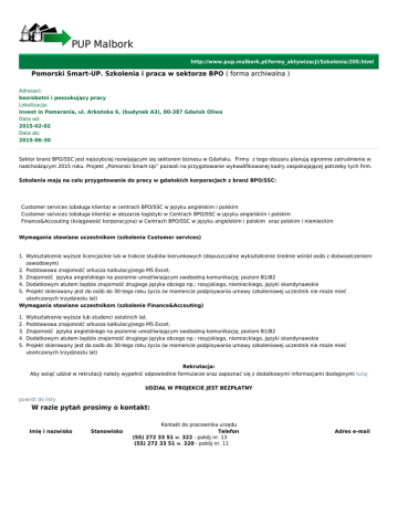 PUP Malbork http://www.pup.malbork.pl/formy_aktywizacji/Szkolenia/200.html Pomorski Smart-UP. Szkolenia i praca w sektorze BPO ( forma archiwalna ) Adresaci: bezrobotni i poszukujący pracy Lokalizacja: Invest in Pomerania, ul. Arkońska 6, (budynek A3), 80-387 Gdańsk Oliwa Data od: 2015-02-02 Data do: 2015-06-30 Sektor branż BPO/SSC jest najszybciej rozwijającym się sektorem biznesu w Gdańsku. Firmy z tego obszaru planują ogromne zatrudnienie w nadchodzącym 2015 roku. Projekt „Pomorski Smart-Up” pozwoli na przygotowanie wykwalifikowanej kadry zaspokajającej potrzeby tych firm. Szkolenia mają na celu przygotowanie do pracy w gdańskich korporacjach z branż BPO/SSC: Customer services (obsługa klienta) w centrach BPO/SSC w języku angielskim i polskim Customer services (obsługa klienta) w obszarze logistyki w Centrach BPO/SSC w języku angielskim i polskim Finance&Accouting (księgowość korporacyjna) w Centrach BPO/SSC w języku angielskim i polskim oraz polskim i niemieckim Wymagania stawiane uczestnikom (szkolenia Customer services) 1. Wykształcenie wyższe licencjackie lub w trakcie studiów kierunkowych (dopuszczalne wykształcenie średnie wśród osób z doświadczeniem zawodowym) 2. Podstawowa znajomość arkusza kalkulacyjnego MS Excel; 3. Znajomość języka angielskiego na poziomie umożliwiającym swobodną komunikację; poziom B1/B2 4. Dodatkowym atutem będzie znajomość drugiego języka obcego np.: rosyjskiego, niemieckiego, języki skandynawskie 5. Projekt skierowany jest do osób do 30-tego roku życia (w momencie podpisywania umowy szkoleniowej uczestnik nie może mieć ukończonych trzydziestu lat) Wymagania stawiane uczestnikom (szkolenie Finance&Accouting) 1. 2. 3. 4. 5. Wykształcenie wyższe lub studenci ostatnich lat. Podstawowa znajomość arkusza kalkulacyjnego MS Excel; Znajomość języka angielskiego na poziomie umożliwiającym swobodną komunikację; poziom B1/B2 Dodatkowym atutem będzie znajomość drugiego języka obcego np.: rosyjskiego, niemieckiego, języki skandynawskie Projekt skierowany jest do osób do 30-tego roku życia (w momencie podpisywania umowy szkoleniowej uczestnik nie może mieć ukończonych trzydziestu lat) Rekrutacja: Aby wziąć udział w rekrutacji należy wypełnić odpowiednie formularze oraz zapoznać się z dodatkowymi informacjami dostępnymi tutaj UDZIAŁ W PROJEKCIE JEST BEZPŁATNY powrót do listy W razie pytań prosimy o kontakt: Imię i nazwisko Stanowisko Kontakt do pracownika urzędu Telefon (55) 272 33 51 w. 322 - pokój nr. 13 (55) 272 33 51 w. 320 - pokój nr. 11 Adres e-mail