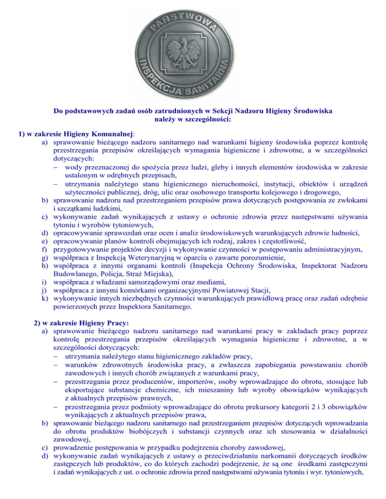 Do podstawowych zadań osób zatrudnionych w Sekcji Nadzoru Higieny Środowiska należy w szczególności: 1) w zakresie Higieny Komunalnej: a) sprawowanie bieżącego nadzoru sanitarnego nad warunkami higieny środowiska poprzez kontrolę przestrzegania przepisów określających wymagania higieniczne i zdrowotne, a w szczególności dotyczących: − wody przeznaczonej do spożycia przez ludzi, gleby i innych elementów środowiska w zakresie ustalonym w odrębnych przepisach, − utrzymania należytego stanu higienicznego nieruchomości, instytucji, obiektów i urządzeń użyteczności publicznej, dróg, ulic oraz osobowego transportu kolejowego i drogowego, b) sprawowanie nadzoru nad przestrzeganiem przepisów prawa dotyczących postępowania ze zwłokami i szczątkami ludzkimi, c) wykonywanie zadań wynikających z ustawy o ochronie zdrowia przez następstwami używania tytoniu i wyrobów tytoniowych, d) opracowywanie sprawozdań oraz ocen i analiz środowiskowych warunkujących zdrowie ludności, e) opracowywanie planów kontroli obejmujących ich rodzaj, zakres i częstotliwość, f) przygotowywanie projektów decyzji i wykonywanie czynności w postępowaniu administracyjnym, g) współpraca z Inspekcją Weterynaryjną w oparciu o zawarte porozumienie, h) współpraca z innymi organami kontroli (Inspekcja Ochrony Środowiska, Inspektorat Nadzoru Budowlanego, Policja, Straż Miejska), i) współpraca z władzami samorządowymi oraz mediami, j) współpraca z innymi komórkami organizacyjnymi Powiatowej Stacji, k) wykonywanie innych niezbędnych czynności warunkujących prawidłową pracę oraz zadań odrębnie powierzonych przez Inspektora Sanitarnego. 2) w zakresie Higieny Pracy: a) sprawowanie bieżącego nadzoru sanitarnego nad warunkami pracy w zakładach pracy poprzez kontrolę przestrzegania przepisów określających wymagania higieniczne i zdrowotne, a w szczególności dotyczących: − utrzymania należytego stanu higienicznego zakładów pracy, − warunków zdrowotnych środowiska pracy, a zwłaszcza zapobiegania powstawaniu chorób zawodowych i innych chorób związanych z warunkami pracy, − przestrzegania przez producentów, importerów, osoby wprowadzające do obrotu, stosujące lub eksportujące substancje chemiczne, ich mieszaniny lub wyroby obowiązków wynikających z aktualnych przepisów prawnych, − przestrzegania przez podmioty wprowadzające do obrotu prekursory kategorii 2 i 3 obowiązków wynikających z aktualnych przepisów prawa, b) sprawowanie bieżącego nadzoru sanitarnego nad przestrzeganiem przepisów dotyczących wprowadzania do obrotu produktów biobójczych i substancji czynnych oraz ich stosowania w działalności zawodowej, c) prowadzenie postępowania w przypadku podejrzenia choroby zawodowej, d) wykonywanie zadań wynikających z ustawy o przeciwdziałaniu narkomanii dotyczących środków zastępczych lub produktów, co do których zachodzi podejrzenie, że są one środkami zastępczymi i zadań wynikających z ust. o ochronie zdrowia przed następstwami używania tytoniu i wyr. tytoniowych, e) f) g) h) i) przygotowywanie projektów decyzji i wykonywanie czynności w postępowaniu administracyjnym, opracowywanie planów kontroli obejmujących ich rodzaj, zakres i częstotliwość, opracowywanie sprawozdań, ocen i analiz dotyczących stanu sanitarnego nadzorowanych obiektów, współpraca z Inspekcją Weterynaryjną w oparciu o zawarte porozumienie, współpraca z innymi organami kontroli (Państwowa Inspekcja Pracy, Inspekcja Ochrony Środowiska, Inspektorat Nadzoru Budowlanego, Policja, Straż Miejska), j) współpraca z władzami samorządowymi oraz mediami, k) współpraca z innymi komórkami organizacyjnymi Powiatowej Stacji, l) wykonywanie innych niezbędnych czynności warunkujących prawidłową pracę oraz zadań odrębnie powierzonych przez Inspektora Sanitarnego. 3) w zakresie Higieny Dzieci i Młodzieży: a) sprawowanie bieżącego nadzoru sanitarnego nad warunkami higieny procesów nauczania i wychowania oraz higieny wypoczynku i rekreacji poprzez kontrolę przestrzegania przepisów określających wymagania higieniczne i zdrowotne w szczególności dotyczących: − higieny pomieszczeń i wymagań w stosunku do sprzętu używanego w szkołach i innych placówkach oświatowo – wychowawczych oraz ośrodkach wypoczynku, − higieny procesów nauczania, b) wykonywanie zadań wynikających z ustawy o ochronie zdrowia przed następstwami używania tytoniu i wyrobów tytoniowych, c) przygotowywanie projektów decyzji i wykonywanie czynności w postępowaniu administracyjnym, d) opracowywanie planów kontroli obejmujących ich rodzaj, zakres i częstotliwość, e) opracowywanie sprawozdań, ocen i analiz dotyczących stanu sanitarnego nadzorowanych obiektów, f) współpraca z organami prowadzącymi nadzorowane obiekty, g) współpraca z władzami samorządowymi oraz mediami, h) współpraca z innymi organami kontroli (Kuratorium Oświaty, Inspektorat Nadzoru Budowlanego, Policja, Straż Miejska), i) współpraca z innymi komórkami organizacyjnymi Powiatowej Stacji, j) wykonywanie innych niezbędnych czynności warunkujących prawidłową pracę oraz zadań odrębnie powierzonych przez Inspektora Sanitarnego.