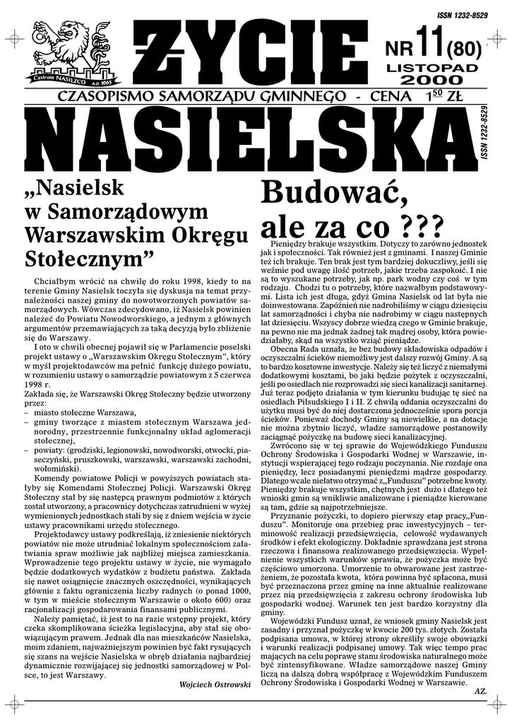 ISSN 1232−8529 ŻYCIE NASIELSKA (CZASOPISMO SAMORZĄDU GMINNEGO) „Nasielsk w Samorządowym Warszawskim Okręgu Stołecznym” Chciałbym wrócić na chwilę do roku 1998, kiedy to na terenie Gminy Nasielsk toczyła się dyskusja na temat przynależności naszej gminy do nowotworzonych powiatów samorządowych. Wówczas zdecydowano, iż Nasielsk powinien należeć do Powiatu Nowodworskiego, a jednym z głównych argumentów przemawiających za taką decyzją było zbliżenie się do Warszawy. I oto w chwili obecnej pojawił się w Parlamencie poselski projekt ustawy o „Warszawskim Okręgu Stołecznym”, który w myśl projektodawców ma pełnić funkcję dużego powiatu, w rozumieniu ustawy o samorządzie powiatowym z 5 czerwca 1998 r. Zakłada się, że Warszawski Okręg Stołeczny będzie utworzony przez: – miasto stołeczne Warszawa, – gminy tworzące z miastem stołecznym Warszawa jednorodny, przestrzennie funkcjonalny układ aglomeracji stołecznej, – powiaty: (grodziski, legionowski, nowodworski, otwocki, piaseczyński, pruszkowski, warszawski, warszawski zachodni, wołomiński). Komendy powiatowe Policji w powyższych powiatach stałyby się Komendami Stołecznej Policji. Warszawski Okręg Stołeczny stał by się następcą prawnym podmiotów z których został utworzony, a pracownicy dotychczas zatrudnieni w wyżej wymienionych jednostkach stali by się z dniem wejścia w życie ustawy pracownikami urzędu stołecznego. Projektodawcy ustawy podkreślają, iż zniesienie niektórych powiatów nie może utrudniać lokalnym społecznościom załatwiania spraw możliwie jak najbliżej miejsca zamieszkania. Wprowadzenie tego projektu ustawy w życie, nie wymagało będzie dodatkowych wydatków z budżetu państwa. Zakłada się nawet osiągnięcie znacznych oszczędności, wynikających głównie z faktu ograniczenia liczby radnych (o ponad 1000, w tym w mieście stołecznym Warszawie o około 600) oraz racjonalizacji gospodarowania finansami publicznymi. Należy pamiętać, iż jest to na razie wstępny projekt, który czeka skomplikowana ścieżka legislacyjna, aby stał się obowiązującym prawem. Jednak dla nas mieszkańców Nasielska, moim zdaniem, najważniejszym powinien być fakt rysujących się szans na wejście Nasielska w obręb działania najbardziej dynamicznie rozwijającej się jednostki samorządowej w Polsce, to jest Warszawy. Wojciech Ostrowski STR. 1 Budować, ale za co ??? Pieniędzy brakuje wszystkim. Dotyczy to zarówno jednostek jak i społeczności. Tak również jest z gminami. I naszej Gminie też ich brakuje. Ten brak jest tym bardziej dokuczliwy, jeśli się weźmie pod uwagę ilość potrzeb, jakie trzeba zaspokoić. I nie są to wyszukane potrzeby, jak np. park wodny czy coś w tym rodzaju. Chodzi tu o potrzeby, które nazwałbym podstawowymi. Lista ich jest długa, gdyż Gmina Nasielsk od lat była nie doinwestowana. Zapóźnień nie nadrobiliśmy w ciągu dziesięciu lat samorządności i chyba nie nadrobimy w ciągu następnych lat dziesięciu. Wszyscy dobrze wiedzą czego w Gminie brakuje, na pewno nie ma jednak żadnej tak mądrej osoby, która powiedziałaby, skąd na wszystko wziąć pieniądze. Obecna Rada uznała, że bez budowy składowiska odpadów i oczyszczalni ścieków niemożliwy jest dalszy rozwój Gminy. A są to bardzo kosztowne inwestycje. Należy się też liczyć z niemałymi dodatkowymi kosztami, bo jaki będzie pożytek z oczyszczalni, jeśli po osiedlach nie rozprowadzi się sieci kanalizacji sanitarnej. Już teraz podjęto działania w tym kierunku budując tę sieć na osiedlach Piłsudskiego I i II. Z chwilą oddania oczyszczalni do użytku musi być do niej dostarczona jednocześnie spora porcja ścieków. Ponieważ dochody Gminy są niewielkie, a na dotacje nie można zbytnio liczyć, władze samorządowe postanowiły zaciągnąć pożyczkę na budowę sieci kanalizacyjnej. Zwrócono się w tej sprawie do Wojewódzkiego Funduszu Ochrony Środowiska i Gospodarki Wodnej w Warszawie, instytucji wspierającej tego rodzaju poczynania. Nie rozdaje ona pieniędzy, lecz posiadanymi pieniędzmi mądrze gospodarzy. Dlatego wcale niełatwo otrzymać z,,Funduszu” potrzebne kwoty. Pieniędzy brakuje wszystkim, chętnych jest dużo i dlatego też wnioski gmin są wnikliwie analizowane i pieniądze kierowane są tam, gdzie są najpotrzebniejsze. Przyznanie pożyczki, to dopiero pierwszy etap pracy,,Funduszu”. Monitoruje ona przebieg prac inwestycyjnych – terminowość realizacji przedsięwzięcia, celowość wydawanych środków i efekt ekologiczny. Dokładnie sprawdzana jest strona rzeczowa i finansowa realizowanego przedsięwzięcia. Wypełnienie wszystkich warunków sprawia, że pożyczka może być częściowo umorzona. Umorzenie to obwarowane jest zastrzeżeniem, że pozostała kwota, która powinna być spłacona, musi być przeznaczona przez gminę na inne aktualnie realizowane przez nią przedsięwzięcia z zakresu ochrony środowiska lub gospodarki wodnej. Warunek ten jest bardzo korzystny dla gminy. Wojewódzki Fundusz uznał, że wniosek gminy Nasielsk jest zasadny i przyznał pożyczkę w kwocie 200 tys. złotych. Została podpisana umowa, w której strony określiły swoje obowiązki i warunki realizacji podpisanej umowy. Tak więc tempo prac mających na celu poprawę stanu środowiska naturalnego może być zintensyfikowane. Władze samorządowe naszej Gminy liczą na dalszą dobrą współpracę z Wojewódzkim Funduszem Ochrony Środowiska i Gospodarki Wodnej w Warszawie. AZ. ŻYCIE NASIELSKA (CZASOPISMO SAMORZĄDU GMINNEGO) Z prac Zarządu W październiku Zarząd Miejski obradował czterokrotnie. Na początku posiedzenia, które odbyło się 4.X. rozpatrzono szereg pism skierowanych przez mieszkańców i podmioty gospodarcze do tego gremium. Po dyskusji nad treścią próśb i wniosków w nich zawartych Zarząd postanowił: przesunąć SKR-owi do 1.XII. termin płatności podatku od nieruchomości za I 