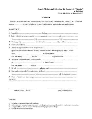 Szkoła Medyczna Policealna dla Dorosłych "Stopka" w Lublinie 20-314 Lublin, ul. Przyjaźni 12 PODANIE Proszę o przyjęcie mnie do Szkoły Medycznej Policealnej dla Dorosłych "Stopka" w Lublinie na semestr ................. w roku szkolnym 2016/17 na kierunek: higienistka stomatologiczna. KANDYDAT 1. Nazwisko: ................................................ Imiona:................................................................. 2. Data i miejsce urodzenia: dzień ............. miesiąc ....................... rok ................................... w............................................. woj. .............................................. kraj ................................ 3. Stan cywilny ............................. narodowość ......................... obywatelstwo ..................... 4. Nazwisko rodowe ................................................................................................................ 5. Adres stałego zameldowania: miejscowość ........................................................................ (podkreślić właściwe: miasto do 5 tys. mieszkańców, miasto powyżej 5 tys., wieś) ulica ...........................................................nr domu/lokalu..................... kod pocztowy ................... poczta ............................... województwo ............................. 6. Adres do korespondencji: miejscowość ............................................................................. ul. ............................................................. nr domu/lokalu.................... kod pocztowy .................. poczta .......................................................... 7. Nr tel. ............................................... , adres e-mail: .......................................................... 8. Nazwa i miejsce ukończonej szkoły średniej: .................................................................... w................................................ woj. ......................................... rok ukończenia ............. 9. Seria i Nr dowodu osobistego: ......................................................................................... 10. PESEL ............................................................................................................................... .............................................................. (miejscowość i data) ...................................................................... (podpis kandydata) Załączniki: 1. 2. 3. 4. świadectwo ukończenia szkoły średniej, zaświadczenie lekarza medycyny pracy o braku przeciwwskazań do nauki w wybranym zawodzie, 2 zdjęcia 37x52 mm, 1 zdjęcie 30x42 mm (do legitymacji szkolnej) kserokopia dowodu osobistego. ANKIETA KWALIFIKACYJNA 1 Imię i nazwisko 2 Wykształcenie, posiadany tytuł 3 Nazwy i rok ukończenia szkół: - średniej - policealnej / wyższej 4 Uzyskane końcowe oceny z przedmiotu: - biologia 5 Wybór języka obcego 6 Doświadczenie zawodowe - staż pracy - aktualne/ostatnie miejsce pracy 7 Uzasadnienie wyboru Szkoły Medycznej Policealnej dla Dorosłych "Stopka" w Lublinie 8 Źródło informacji o Szkole Medycznej Policealnej dla Dorosłych "Stopka" w Lublinie OŚWIADCZENIE Oświadczam, że zgodnie z art. 24 Ustawy z dnia 29 sierpnia 1997 roku o ochronie danych osobowych (tekst jednolity: Dz.U.2014 r. poz. 1182 z późn. zm.) zostałam (em) poinformowana(y) o tym, że: 1) Studium jest administratorem danych osobowych, które zbierane są w celu spełnienia wymagań prawa oświatowego w związku z rekrutacją do szkoły i realizacją procesu dydaktycznego; 2) przewidywanymi odbiorcami danych osobowych będą: nauczyciele i inni upoważnieni pracownicy szkoły oraz SSP"Stopka", a także inne podmioty prowadzące bazy danych szkół; 3) uczeń ma prawo dostępu do treści swoich danych osobowych oraz ich poprawiania; 4) uczeń ma obowiązek podania danych osobowych wynikający z przepisów prawa oświatowego. .............................................................. (miejscowość i data) ...................................................................... (podpis kandydata)
