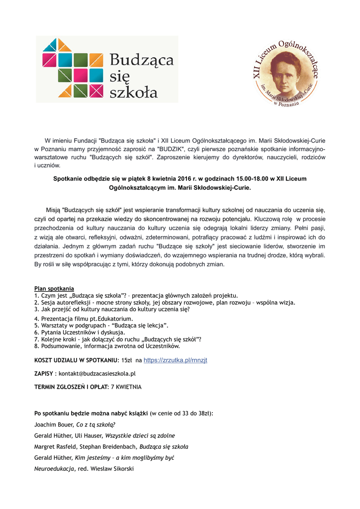 W imieniu Fundacji "Budząca się szkoła" i XII Liceum Ogólnokształcącego im. Marii Skłodowskiej-Curie w Poznaniu mamy przyjemność zaprosić na "BUDZIK", czyli pierwsze poznańskie spotkanie informacyjnowarsztatowe ruchu "Budzących się szkół". Zaproszenie kierujemy do dyrektorów, nauczycieli, rodziców i uczniów. Spotkanie odbędzie się w piątek 8 kwietnia 2016 r. w godzinach 15.00-18.00 w XII Liceum Ogólnokształcącym im. Marii Skłodowskiej-Curie. Misją "Budzących się szkół" jest wspieranie transformacji kultury szkolnej od nauczania do uczenia się, czyli od opartej na przekazie wiedzy do skoncentrowanej na rozwoju potencjału. Kluczową rolę w procesie przechodzenia od kultury nauczania do kultury uczenia się odegrają lokalni liderzy zmiany. Pełni pasji, z wizją ale otwarci, refleksyjni, odważni, zdeterminowani, potrafiący pracować z ludźmi i inspirować ich do działania. Jednym z głównym zadań ruchu "Budzące się szkoły" jest sieciowanie liderów, stworzenie im przestrzeni do spotkań i wymiany doświadczeń, do wzajemnego wspierania na trudnej drodze, którą wybrali. By rośli w siłę współpracując z tymi, którzy dokonują podobnych zmian. Plan spotkania 1. Czym jest „Budząca się szkoła”? – prezentacja głównych założeń projektu. 2. Sesja autorefleksji - mocne strony szkoły, jej obszary rozwojowe, plan rozwoju – wspólna wizja. 3. Jak przejść od kultury nauczania do kultury uczenia się? 4. Prezentacja filmu pt.Edukatorium. 5. Warsztaty w podgrupach - “Budząca się lekcja”. 6. Pytania Uczestników i dyskusja. 7. Kolejne kroki - jak dołączyć do ruchu „Budzących się szkół”? 8. Podsumowanie, informacja zwrotna od Uczestników. KOSZT UDZIAŁU W SPOTKANIU: 15zł na https://zrzutka.pl/rnnzjt ZAPISY : [email protected] TERMIN ZGŁOSZEŃ I OPŁAT: 7 KWIETNIA Po spotkaniu będzie można nabyć książki (w cenie od 33 do 38zł): Joachim Bouer, Co z tą szkołą? Gerald Hüther, Uli Hauser, Wszystkie dzieci są zdolne Margret Rasfeld, Stephan Breidenbach, Budząca się szkoła Gerald Hüther, Kim jesteśmy – a kim moglibyśmy być Neuroedukacja, red. Wiesław Sikorski