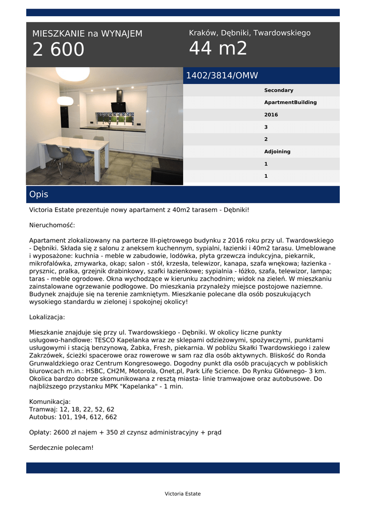 MIESZKANIE na WYNAJEM 2 600 Kraków, Dębniki, Twardowskiego 44 m2 1402/3814/OMW Secondary ApartmentBuilding 2016 3 2 Adjoining 1 1 Opis Victoria Estate prezentuje nowy apartament z 40m2 tarasem - Dębniki! Nieruchomość: Apartament zlokalizowany na parterze III-piętrowego budynku z 2016 roku przy ul. Twardowskiego - Dębniki. Składa się z salonu z aneksem kuchennym, sypialni, łazienki i 40m2 tarasu. Umeblowane i wyposażone: kuchnia - meble w zabudowie, lodówka, płyta grzewcza indukcyjna, piekarnik, mikrofalówka, zmywarka, okap; salon - stół, krzesła, telewizor, kanapa, szafa wnękowa; łazienka prysznic, pralka, grzejnik drabinkowy, szafki łazienkowe; sypialnia - łóżko, szafa, telewizor, lampa; taras - meble ogrodowe. Okna wychodzące w kierunku zachodnim; widok na zieleń. W mieszkaniu zainstalowane ogrzewanie podłogowe. Do mieszkania przynależy miejsce postojowe naziemne. Budynek znajduje się na terenie zamkniętym. Mieszkanie polecane dla osób poszukujących wysokiego standardu w zielonej i spokojnej okolicy! Lokalizacja: Mieszkanie znajduje się przy ul. Twardowskiego - Dębniki. W okolicy liczne punkty usługowo-handlowe: TESCO Kapelanka wraz ze sklepami odzieżowymi, spożywczymi, punktami usługowymi i stacją benzynową, Żabka, Fresh, piekarnia. W pobliżu Skałki Twardowskiego i zalew Zakrzówek, ścieżki spacerowe oraz rowerowe w sam raz dla osób aktywnych. Bliskość do Ronda Grunwaldzkiego oraz Centrum Kongresowego. Dogodny punkt dla osób pracujących w pobliskich biurowcach m.in.: HSBC, CH2M, Motorola, Onet.pl, Park Life Science. Do Rynku Głównego- 3 km. Okolica bardzo dobrze skomunikowana z resztą miasta- linie tramwajowe oraz autobusowe. Do najbliższego przystanku MPK "Kapelanka" - 1 min. Komunikacja: Tramwaj: 12, 18, 22, 52, 62 Autobus: 101, 194, 612, 662 Opłaty: 2600 zł najem + 350 zł czynsz administracyjny + prąd Serdecznie polecam! Victoria Estate Małgorzata Wicha tel. +48 511 560 721 email: [email protected] Victoria Estate Powered by TCPDF (www.tcpdf.org)