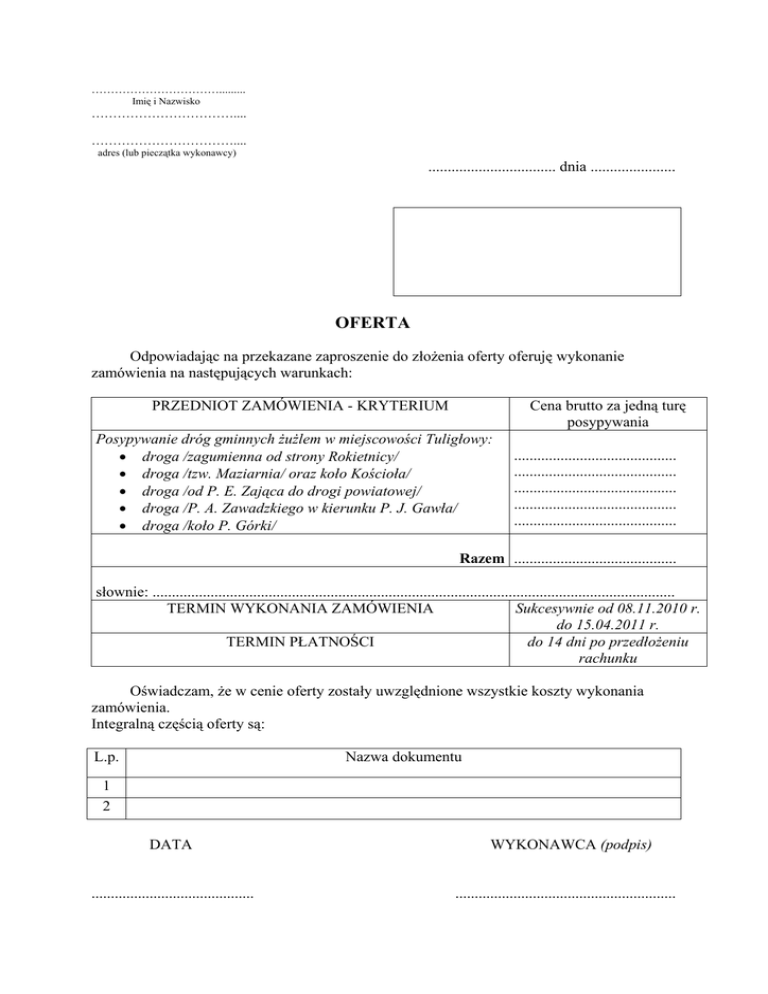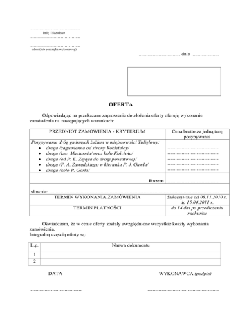 ……………………………......... Imię i Nazwisko …………………………….... …………………………….... adres (lub pieczątka wykonawcy) ................................. dnia ...................... OFERTA Odpowiadając na przekazane zaproszenie do złożenia oferty oferuję wykonanie zamówienia na następujących warunkach: PRZEDNIOT ZAMÓWIENIA - KRYTERIUM Cena brutto za jedną turę posypywania Posypywanie dróg gminnych żużlem w miejscowości Tuligłowy: • droga /zagumienna od strony Rokietnicy/ • droga /tzw. Maziarnia/ oraz koło Kościoła/ • droga /od P. E. Zająca do drogi powiatowej/ • droga /P. A. Zawadzkiego w kierunku P. J. Gawła/ • droga /koło P. Górki/ .......................................... .......................................... .......................................... .......................................... .......................................... Razem .......................................... słownie: ....................................................................................................................................... TERMIN WYKONANIA ZAMÓWIENIA Sukcesywnie od 08.11.2010 r. do 15.04.2011 r. TERMIN PŁATNOŚCI do 14 dni po przedłożeniu rachunku Oświadczam, że w cenie oferty zostały uwzględnione wszystkie koszty wykonania zamówienia. Integralną częścią oferty są: L.p. Nazwa dokumentu 1 2 DATA .......................................... WYKONAWCA (podpis) .........................................................