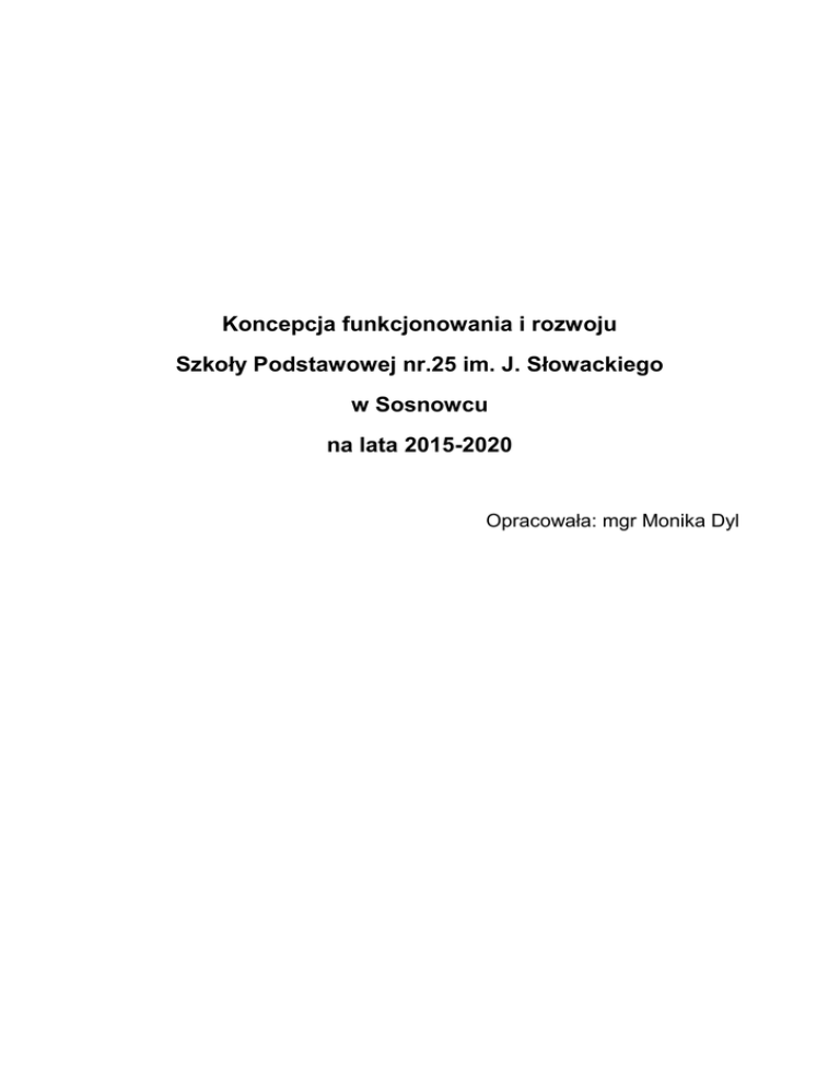 Koncepcja funkcjonowania i rozwoju Szkoły Podstawowej nr.25 im. J. Słowackiego w Sosnowcu na lata 2015-2020 Opracowała: mgr Monika Dyl Wstęp Koncepcja funkcjonowania i rozwoju szkoły, obejmuje działania w zakresie wychowania, kształcenia i opieki oraz organizację i zarządzanie. Jest ukierunkowana na spełnienie przez szkołę wymagań na coraz wyższym poziomie. W przedstawianej koncepcji funkcjonowania i rozwoju szkoły na lata 2015 – 2020, wykorzystano wieloletnie doświadczenie w pracy z dziećmi tej szkoły. Została opracowana w oparciu o najnowsze uregulowania prawne w oświacie i następujące dokumenty: - sprawozdanie z pracy i nadzoru pedagogicznego dyrektora szkoły - informację o jakości pracy szkoły po ewaluacji wewnętrznej - dokumenty wewnątrzszkolne: Statut, Program Wychowawczy, Program Profilaktyczny, Plan Nadzoru Pedagogicznego. Wszystkie moje działania podporządkowane będą sformułowanej kilka lat temu misji szkoły „ Szkoła bezpieczna i przyjazna dla ucznia, wspierająca jego wszechstronny rozwój we współpracy z domem rodzinnym i w zgodzie z naturą” Absolwent Szkoły Podstawowej nr.25 w Sosnowcu będzie: - wyposażony w wiedzę i umiejętności pozwalające na kontynuowanie nauki na kolejnym etapie edukacyjnym, - świadomy siebie i odpowiedzialny, - sprawnie zdobywał potrzebną mu wiedzę z różnych źródeł informacji, - wyposażony w wiedzę na temat otaczającego go świata i umiejętność jej wykorzystania w życiu codziennym, - kształtował swoje środowisko w sposób kreatywny, - wrażliwy na piękno i drugiego człowieka, - prawidłowo funkcjonował w społeczeństwie, komunikatywny i asertywny, - wyposażony we właściwe zachowanie i postawy zgodne z zasadami etyki, - miał poczucie przynależności do najbliższego środowiska, - przygotowany do uczestnictwa w życiu społecznym, - potrafi współpracować w grupie, - miał poczucie własnej wartości. Charakterystyka szkoły. Szkoła Podstawowa nr.25 im. Juliusza Słowackiego funkcjonuje w dzielnicy Klimontów. Jest małą szkołą. W obecnym budynku funkcjonuje od 2012 r. Szkoła posiada dobrą bazę materialną. Wewnątrz budynku znajduje się 13 sal lekcyjnych, pracownia komputerowa, stołówka, sala gimnastyczna, biblioteka, oddział przedszkolny, kompleks boisk przyszkolnych wymagających remontu. Klasy I-III dostosowane i wyposażone są do potrzeb dzieci, wydzielono miejsce do nauki i rekreacji wyposażone w dywan, zabawki i pomoce. Wszyscy nauczyciele posiadają pełne kwalifikacje do nauczanego przedmiotu, a niektórzy do kilku, mają ukończone formy doskonalenia, kursy kwalifikacyjne, studia podyplomowe. Rozwój szkoły Szkoła Podstawowa nr. 25 jest szkołą przyjazną, bezpieczną i promującą zdrowy styl życia. Jest miejscem, do którego dzieci uczęszczają bez obaw. Uwzględnia potrzeby i możliwości ucznia, rozwija jego uzdolnienia i zainteresowania. Uczniowie uczestniczą i zajmują wysokie lokaty w konkursach przedmiotowych, językowych i sportowych. Istotną dla jakości procesu dydaktycznego jest kadrowa stabilizacja. Zapewnia ona identyfikację nauczyciela ze szkołą. Kadra pedagogiczna chętnie podejmuje wyzwania, realizuje projekty edukacyjne. Realizacja projektów integruje społeczność szkolną. Równie ważnym czynnikiem podnoszącym efektywność procesów dydaktyczno-wychowawczych jest dobry klimat pracy. Utrzymanie wysokiego poziomu kształcenia, wychowania i opieki, sprzyja wdrażanie planowanych działań. I Kształcenie Nadrzędnym celem jest dążenie do wszechstronnego rozwoju ucznia, aby jak najlepiej wykorzystał własny potencjał intelektualny i potrafił dostosować się do zmieniających się realiów współczesnego świata, ucząc się przez całe życie. Aby ten cel osiągnąć procesy edukacyjne będą przebiegały w sposób planowany, były zorganizowane w sposób sprzyjający uczeniu się. Będzie kontynuowane badanie i analizowanie osiągnięć ucznia jakie funkcjonuje w naszej szkole. Dokonywanie diagnozy pracy dydaktycznej, a wynikające wnioski do dalszej pracy posłużą podniesieniu efektów kształcenia. Należy tu miedzy innymi: - test kompetencji OBUT dla klas III, - diagnozy wstępne klas IV, - badanie osiągnięć edukacyjnych z poszczególnych przedmiotów uczniów klas IV – V, - przynależność do programu edukacyjnego „Lepsza szkoła” z j. polskiego i matematyki, - próbny sprawdzian klas VI, - sprawdzian klas VI – dokonywana ilościowa i jakościowa analiza wyników. Nauczyciele będą inspirowani do realizacji projektów w ramach Europejskiego Funduszu Społecznego, motywowani do stosowania aktywnych metod nauczania, wykorzystania technologii komputerowej, do prowadzenia zajęć w taki sposób, aby zaspokoić potrzeby uczniów o różnych stylach uczenia się. Wzbogacając ofertę zajęć pozalekcyjnych będą stwarzane warunki dające uczniom możliwość odniesienia sukcesu. Pomoc pedagogiczno-psychologiczną będzie zorganizowana poprzez wprowadzenie zajęć dydaktyczno-wychowawczych, korekcyjno-kompensacyjnych, zajęć logopedycznych. Dodatkowe zajęcia wyrównawcze oraz rozwijające zdolności uczniów z uwzględnieniem oczekiwań i uzdolnień uczniów, będą zaplanowane z wykorzystaniem godzin dodatkowych puli art. 42 KN. Kadra pedagogiczna w naszej szkole jest aktywna, realizuje wiele programów, projektów. Nauczyciele wykorzystują ciekawe formy pracy np. lekcje przyrody z leśniczym, z pracownikiem Urzędu Skarbowego, z dietetykiem, spotkania z autorami książek itp. Dlatego też, jednym z celów to zachęcenie nauczycieli do wprowadzenia innowacji pedagogicznej. Będzie kontynuowana organizacja imprez i uroczystości szkolnych. Cieszą się one dużym zainteresowaniem nie tylko wśród rodziców naszych uczniów, ale i w środowisku lokalnym. Angażując rodziców w organizację imprez, włącza się ich w pozyskiwanie środków dla szkoły. Ocenianie kształtujące jest efektywnym spos