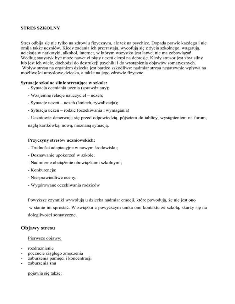 STRES SZKOLNY Stres odbija się nie tylko na zdrowiu fizycznym, ale też na psychice. Dopada prawie każdego i nie omija także uczniów. Kiedy zadania ich przerastają, wycofują się z życia szkolnego, wagarują, uciekają w narkotyki, alkohol, internet, w którym wszystko jest łatwe, nie ma zobowiązań. Według statystyk być może nawet ci piąty uczeń cierpi na depresję. Kiedy stresor jest zbyt silny lub jest ich wiele, dochodzi do destrukcji psychiki i do wystąpienia objawów somatycznych. Wpływ stresu na organizm dziecka jest bardzo szkodliwy: nadmiar stresu negatywnie wpływa na możliwości umysłowe dziecka, a także na jego zdrowie fizyczne. Sytuacje szkolne silnie stresujące w szkole: - Sytuacja oceniania ucznia (sprawdziany); - Wzajemne relacje nauczyciel – uczeń; - Sytuacje uczeń – uczeń (śmiech, rywalizacja); - Sytuacja uczeń – rodzic (oczekiwania i wymagania) - Uczniowie denerwują się przed odpowiedzią, pójściem do tablicy, wystąpieniem na forum, nagłą kartkówką, nową, nieznaną sytuacją. Przyczyny stresów uczniowskich: - Trudności adaptacyjne w nowym środowisku; - Doznawanie upokorzeń w szkole; - Nadmierne obciążenie obowiązkami szkolnymi; - Konkurencja; - Niesprawiedliwe oceny; - Wygórowane oczekiwania rodziców Powyższe czynniki wywołują u dziecka nadmiar emocji, które powodują, że nie jest ono w stanie im sprostać. W związku z powyższym unika ono kontaktu ze szkołą, skarży się na dolegliwości somatyczne. Objawy stresu Pierwsze objawy: - rozdrażnienie poczucie ciągłego zmęczenia zaburzenia pamięci i koncentracji zaburzenia snu pojawia się także: - smutek następuje stopniowa utrata wiary we własne możliwości zanika motywacja nasila się poczucie niemożności - dolegliwości somatyczne: zaburzenia ze strony układu pokarmowego min. mdłości zburzenia ze strony układu oddechowego zaburzenia układu krążenia „DOSKONAŁA MINUTKA”- ćwiczenie nie tylko na poprawę koncentracji ale też na załagodzenie poczucia stresu. to proste ćwiczenie można bez problemu wykonać codziennie. Siadamy na krześle, oddychamy głęboko i zamykamy oczy. Skupiamy się na wszystkich bodźcach, które docierają do nas z zewnątrz, a także na sygnałach płynących z ciała: zmęczeniu, głodzie, zimnie, gorącu. Uspokaja się umysł i znikają problemy, które tkwią w głowie. Przez minutę pozostajemy w pełni uważni i skoncentrowani. Kończymy głębokim oddechem i otwarciem oczu. Przydatne strony: http://www.szkolnictwo.pl/index.php?id=PU0603 http://www.perspektywy.pl/index.php?option=com_content&task=view&id=2912&Itemid=70 http://portal.abczdrowie.pl/stres-szkolny http://zdrowie.gazeta.pl/Zdrowie/1,105806,14461430,Jak_pomoc_dziecku_przetrwac_szkolny_st res_.html Materiały zostały opracowane przez zespół pedagogów i psychologów szkolnych powiatu wodzisławskiego