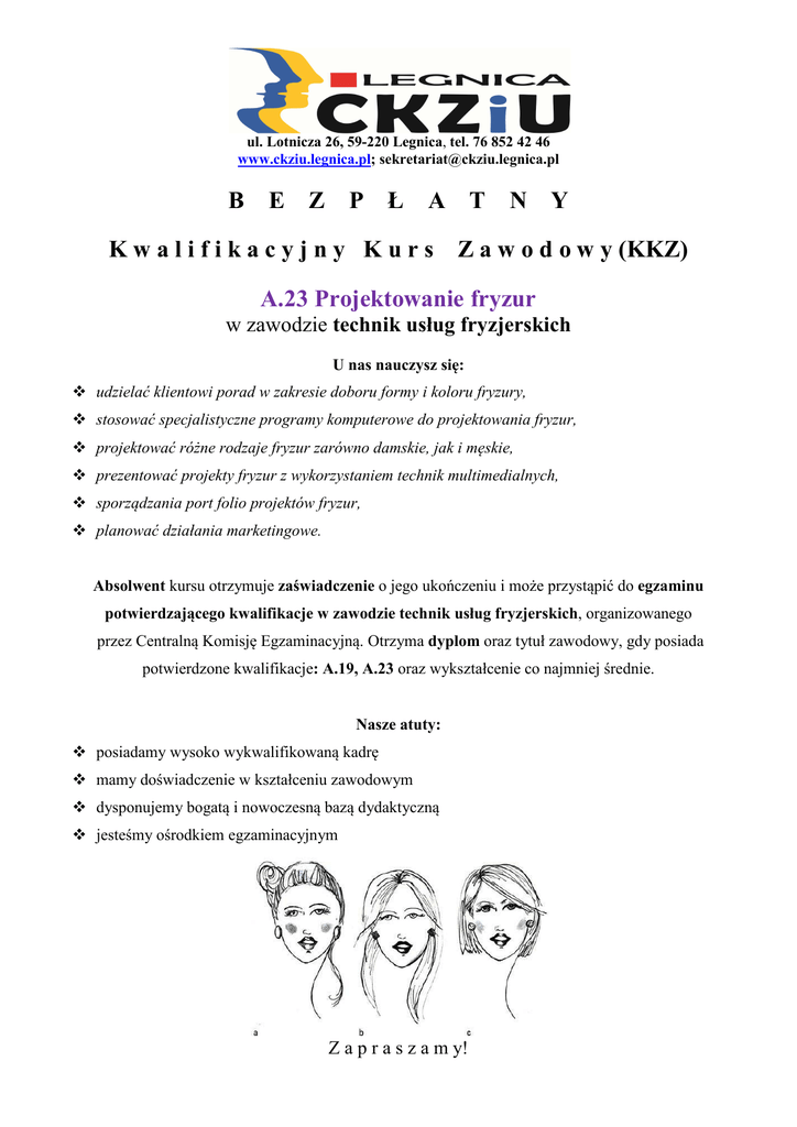 ul. Lotnicza 26, 59-220 Legnica, tel. 76 852 42 46 www.ckziu.legnica.pl; [email protected] B E Z P Ł A T Kwalifikacyjny Kurs N Y Z a w o d o w y (KKZ) A.23 Projektowanie fryzur w zawodzie technik usług fryzjerskich U nas nauczysz się: udzielać klientowi porad w zakresie doboru formy i koloru fryzury, stosować specjalistyczne programy komputerowe do projektowania fryzur, projektować różne rodzaje fryzur zarówno damskie, jak i męskie, prezentować projekty fryzur z wykorzystaniem technik multimedialnych, sporządzania port folio projektów fryzur, planować działania marketingowe. Absolwent kursu otrzymuje zaświadczenie o jego ukończeniu i może przystąpić do egzaminu potwierdzającego kwalifikacje w zawodzie technik usług fryzjerskich, organizowanego przez Centralną Komisję Egzaminacyjną. Otrzyma dyplom oraz tytuł zawodowy, gdy posiada potwierdzone kwalifikacje: A.19, A.23 oraz wykształcenie co najmniej średnie. Nasze atuty: posiadamy wysoko wykwalifikowaną kadrę mamy doświadczenie w kształceniu zawodowym dysponujemy bogatą i nowoczesną bazą dydaktyczną jesteśmy ośrodkiem egzaminacyjnym Z a p r a s z a m y!