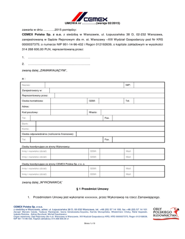 UMOWA nr …………..(wersja 02/2015) zawarta w dniu ………..2015 pomiędzy: CEMEX Polska Sp. z o.o. z siedzibą w Warszawie, ul. Łopuszańska 38 D, 02-232 Warszawa, zarejestrowaną w Sądzie Rejonowym dla m. st. Warszawy –XIII Wydział Gospodarczy pod Nr KRS 0000037375; o numerze NIP 951-14-96-432 i Regon 012192639, o kapitale zakładowym w wysokości 314 268 600,00 PLN, reprezentowaną przez: 1. …………………………………………………… 2. …………………………………………………… zwaną dalej „ZAMAWIAJĄCYM”, a: NIP: Nazwa: Zarejestrowany w: Reprezentowany przez: Osoba kontaktowa: GSM: Tel. Adres: Kod pocztowy: Miasto: Tel. Fax. Bank: Konto: Osoba odpowiedzialna (rozliczenia finansowe): Tel. Fax. Osoby koordynujące ze strony Wykonawcy: Imię i nazwisko (dział): GSM: Mail: Imię i nazwisko (dział): GSM: Mail: Imię i nazwisko (dział): GSM: Mail: Imię i nazwisko (dział): GSM: Mail: Osoby koordynujące ze strony CEMEX Polska Sp. z o. o. zwaną dalej „WYKONAWCĄ” § 1 Przedmiot Umowy 1. Przedmiotem Umowy jest wykonanie xxxxxxxx, przez Wykonawcę na rzecz Zamawiającego. CEMEX Polska Sp. z o.o. z siedzibą w Warszawie, adres: ul. Łopuszańska 38 D, 02-232 Warszawa, tel. +48 (22) 57 14 100, fax +48 (22) 57 14 101 Zarząd: Marcelo Catala, Tadeusz Radzięciak, Iwona Górakowska-Szyszka, Kamila Skorupińska, Włodzimierz Chołuj, Rafał Gajewski, Izabela Rokicka, Adrian Burchard, Michał Daszkiewicz; Organ rejestrowy: Sąd Rejonowy dla m.st. Warszawy w Warszawie, XIII Wydział Gospodarczy KRS, KRS 0000037375, Regon 012192639, NIP 951-14-96-432, Kapitał zakładowy 314 268 600,00 zł Strona 1 z 10 2. Szczegółowy zakres realizacji przedmiotu Umowy określony jest w Załączniku nr 1 do umowy - Specyfikacji technicznej, która stanowi integralną część niniejszej Umowy. 3. Wykonawca sprawdził i uwzględnił podczas wizji lokalnej warunki wykonania przedmiotu umowy i szczegółowe obmiary poszczególnych pozycji podanych w specyfikacji technicznej stanowiącej załącznik nr 1 i oświadcza, że wynagrodzenie określone w § 3, ust.1 obejmuje pełny zakres przedmiotu umowy opisany w ust. 1 niniejszego paragrafu umowy. § 2 Oświadczenia stron 1. Zamawiający oświadcza, że posiada środki finansowe na pokrycie zobowiązań wynikających z realizacji zawartej umowy. 2. Wykonawca oświadcza, że posiada pełne możliwości techniczne i organizacyjne konieczne dla zrealizowania przedmiotu umowy. § 3 Wartość umowy i warunki płatności 1. Wynagrodzenie ryczałtowe dla Wykonawcy za wykonanie przedmiotu niniejszej umowy ustala się na kwotę: xxxxxxxxxx + VAT (słownie: xxxxxxxxxxxxxxxx + VAT). 2. Termin płatności: xx dni od daty otrzymania faktury przez Zamawiającego z zastrzeżeniem ust.3. Należność za wykonany przedmiot umowy płatna będzie na podstawie faktury wystawionej przez Wykonawcę. Podstawę do wystawienia faktury stanowi protokół odbioru końcowego podpisany uprzednio, bez uwag, przez Zamawiającego. 3. Zapłata będzie dokonana przez Zamawiającego w formie przelewu na rachunek Wykonawcy wskazany na fakturze w pierwszym terminie płatności CEMEX określonym w załączniku numer 5 do niniejszej umowy następującym po upływie xx dni od daty otrzymania faktury. W przypadku dotrzymania terminu płatności opisanego w zdaniu poprzedzającym, Zamawiający nie będzie obciążony żadnymi odsetkami. Strony ustalają, że warunkiem terminowej realizacji płatności kwot faktur jest umieszczenie przez Wykonawcę na każdej fakturze numeru zamówienia lub imienia oraz nazwiska osoby kupującej z ramienia CEMEX Polska sp. z o.o. W przypadku braku na fakturze powyższych, wymaganych umową informacji Wykonawca nie będzie uprawniony do dochodzenia kar umownych lub odsetek z tytułu późniejszej płatności. Fakturę należy wysłać na adres: xxxxxxxxxxxxxxxxx Na fakturze należy umieszczać numer zamówienia xxxxxxxxxxxxxxxxxxxx. 4. Wykonawca gwarantuje, że na przedmiocie umowy nie jest ustanowiony zastaw lub jakiekolwiek inne zabezpieczenie lub uprawnienie strony trzeciej ograniczające jego dysponowanie przez CEMEX Polska Sp. z o.o. z siedzibą w Warszawie, adres: ul. Łopuszańska 38 D, 02-232 Warszawa, tel. +48 (22) 57 14 100, fax +48 (22) 57 14 101 Zarząd: Marcelo Catala, Tadeusz Radzięciak, Iwona Górakowska-Szyszka, Kamila Skorupińska, Włodzimierz Chołuj, Rafał Gajewski, Izabela Rokicka, Adrian Burchard, Michał Daszkiewicz; Organ rejestrowy: Sąd Rejonowy dla m.st. Warszawy w Warszawie, XIII Wydział Gospodarczy KRS, KRS 0000037375, Regon 012192639, NIP 951-14-96-432, Kapitał zakładowy 314 268 600,00 zł Strona 2 z 10 Zamawiającego, jak również przedmiot umowy nie narusza praw do patentu, wzoru użytkowego, znaku towarowego lub jakichkolwiek praw własności intelektualnej strony trzeciej. § 4 Warunki dostaw 1. Wszelkie dostawy będą realizowane na bazie DDP xxxxxxxxxxxxxx zgodnie z Incoterms 2010. 2. Miejsce dostaw i realizacji zadania: Cemex Polska Sp z o.o., xxxxxxxxxx, xxxxxxxxxxx, xxxxxxxxxx § 5 Termin realizacji 1. Terminy rozpoczęcia i zakończenia realizacji przedmiotu Umowy ustala się wg Harmonogramu realizacji prac, który stanowi załącznik nr 2 do niniejszej Umowy. 2. Wcześniejsze zakończenie realizacji przedmiotu umowy jest dozwolone pod warunkiem uzyskania pisemnego potwierdzenia przez Zamawiającego. 3. Po wykonaniu robót Wykonawca zgłasza Zamawiającemu gotowość do odbioru przedmiotu umowy, który zostanie dokonany przez Zamawiającego w terminie 3 dni roboczych od zgłoszenia. § 6 Gwarancje 1. Wykonawca oświadcza i gwarantuje wykonanie przedmiotu umowy zgodnie z warunkami umowy i załączoną specyfikacją techniczną, polskimi przepisami oraz obowiązującymi normami. 2. Wykonawca udziela xx miesięcznej gwarancji na wykonany przedmiot umowy licząc od daty podpisania bez uwag protokołu odbioru przez Zamawiającego. 3. Gwarancja obejmuje: ………………………
