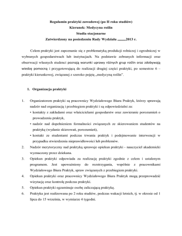 Regulamin praktyki zawodowej (po II roku studiów) Kierunek: Medycyna roślin Studia stacjonarne Zatwierdzony na posiedzeniu Rady Wydziału ,,,,,,,,,2013 r. Celem praktyki jest zapoznanie się z problematyką produkcji rolniczej i ogrodniczej w wybranych gospodarstwach lub instytucjach. Na podstawie zebranych informacji oraz obserwacji własnych studenci poznają warunki uprawy różnych grup roślin oraz zdobywają wiedzę pomocną i przygotowującą do realizacji drugiej części praktyki, po semestrze 6 – praktyki kierunkowej, związanej z szeroko pojętą „medycyną roślin”. 1. Organizacja praktyki 1. Organizatorem praktyki są pracownicy Wydziałowego Biura Praktyk, którzy sprawują nadzór nad organizacją i przebiegiem praktyki i są odpowiedzialni za: • kontakty z zakładami oraz właścicielami gospodarstw oraz zawieranie porozumień o prowadzeniu praktyk, • nadzór nad dopełnieniem formalności związanych ze skierowaniem studentów na praktykę (wydanie skierowań, porozumień), • kontakt ze studentami podczas trwania praktyk i podejmowanie interwencji w przypadku stwierdzenia nieprawidłowości lub problemów. 2. Nadzór merytoryczny nad praktyką sprawuje opiekun praktyki - nauczyciel akademicki wyznaczony przez dziekana. 3. Opiekun praktyki odpowiada za realizację praktyki zgodnie z celem i ustalonym programem. Jest upoważniony do rozstrzygania, wspólnie z pracownikami Wydziałowego Biura Praktyk, spraw związanych z przebiegiem praktyki. 4. Opiekun praktyki oraz pracownicy Wydziałowego Biura Praktyk mogą przeprowadzić wizytację oraz kontrolę podczas praktyki. 5. Opiekun praktyki egzaminuje osobę zaliczającą praktykę. 6. Praktyka jest realizowana po 2 roku studiów, podczas wakacji letnich, tj. w okresie od 1 lipca do 15 września, w wymiarze 4 tygodni. W czasie trwania praktyki studentów obowiązuje taki sam czas pracy jak wszystkich pracowników w instytucji przyjmującej na praktykę, jednak nie mniej niż 6 godzin dziennie. 7. Miejscem praktyki są: dla polowej produkcji są stacje doświadczalne Uniwersytetu Przyrodniczego we Wrocławiu: Swojec lub Pawłowice, a dla produkcji ogrodniczej Piastów (warzywnictwo) lub Samotwór (sadownictwo). W razie koniecznośc praktyka może odbyć się w jednostce o jednym kierunku produkcji, a za zgodą dziekana w innych jednostkach np. miejskie zakłady zieleni, ogrody botaniczne, arboreta itp. Praktyka może być zrealizowana również poza granicami Polski. W przypadkach szczególnych decyzję o możliwości realizacji praktyki w miejscu zaproponowanym przez studenta podejmuje merytoryczny opiekun praktyki w porozumieniu z Wydziałowym 8. Biurem Praktyk. W ustalonym terminie, przed rozpoczęciem praktyki, student powinien uzyskać z jednostki, w której ma odbywać praktykę (np. z właściwego Urzędu Gminy oraz z gospodarstwa rolnego), oświadczenia zawierającego zgodę na odbycie praktyki oraz zapewnienie, że program praktyki może być zrealizowany. 9. Pracownicy Wydziałowego Biura Praktyk w porozumieniu z merytorycznym opiekunem praktyki, organizują zebrania ze studentami, na których zostają przedstawione zasady odbywania praktyki, szczegółowy merytoryczny program praktyki oraz zasady zaliczenia praktyki. 10. Skierowanie na praktykę studenci otrzymują indywidualnie w Wydziałowym Biurze Praktyk. 11. Pracownicy Wydziałowego Biura Praktyk sporządzają listy zawartych porozumień i dostarczają je opiekunowi merytorycznemu - do 15 sierpnia każdego roku. 12. Dziekan w porozumieniu z opiekunem merytorycznym praktyk może zwolnić studenta z obowiązku odbywania praktyki, lub jej części, w przypadku odbycia wcześniej praktyki o podobnym charakterze, lub wykonywania przez niego pracy zarobkowej, jeżeli jej charakter spełnia wymagania programu praktyki. Może to być również praca za granica, jednakże musi ona być realizowana na zasadach umowy między uczelnią a instytucją przyjmującą Zaliczenie praktyki odbywa się wówczas na podstawie wykazania się przez studenta wiedzą w zakresie obowiązującego programu praktyki. Student zwolniony z praktyki lub jej części ma obowiązek poinformować o tym Wydziałowe Biuro Praktyk w terminie do 1 lipca danego roku. II. Obowiązki studentów: 1. Student zgłasza się na praktykę ze skierowaniem (na podstawie podpisanego porozumienia między uczelnią a przyjmującym na praktykę) w dniu rozpoczęcia praktyki i z aktualnym ubezpieczeniem od następstw nieszczęśliwych wypadków na czas praktyki. 2. Warunkiem uzyskania skierowania na praktykę jest dostarczenie do Biura Praktyk oświadczenia o aktualnym ubezpieczeniu od NNW, oświadczenia o uczestnictwie w szkoleniu BHP oraz w razie potrzeby uaktualnionych wyników badań Medycyny Pracy. 3. Student odbywający praktykę zobowiązany jest do podporządkowania się zaleceniom kierownictwa urzędu, zakładu lub gospodarstwa rolnego, oraz do ścisłego przestrzegania obowiązujących przepisów. Student, który nie przestrzega przepisów dyscypliny pracy lub warunków zawartych w umowie (porozumieniu o realizacji praktyki studenckiej), zostaje odwołany z miejsca praktyki. 4. W czasie całego okresu trwania praktyki student zobowiązany jest do wykonywania prac zleconych przez zakładowego kierownika praktyki wyznaczonego przez przyjmującego na praktykę oraz do realizacji programu praktyki. 5. Student ma obowiązek prowadzić dziennik praktyk, w którym dokumentowany jest jej przebieg, oraz sporządzać notatki z uwzględnieniem celów wynikających z programu praktyki. 6. W wyniku praktyki student sporządza kompleksowe opracowania - według schematu merytorycznego załączonego do programu praktyki. 7. Każda nieobecność na praktyce powinna być usprawiedliwiona i odnotowana w dzienniczku praktyk. Usprawiedliwiona nieobecność na praktyce nie może przekraczać 3 dni podczas trwania praktyki. Dłuższe nieobecności z przyczyn losowych po uzgodnieniu z Wydziałowym Biurem Praktyk podl