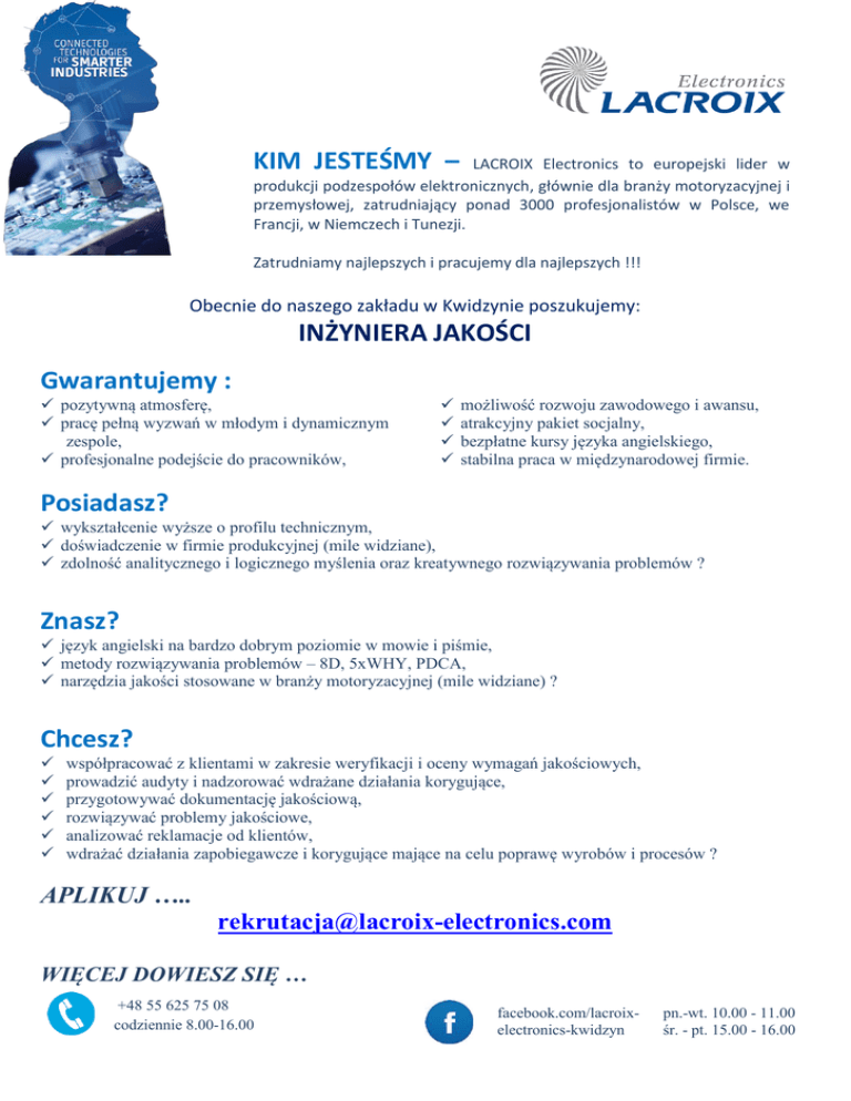 KIM JESTEŚMY – LACROIX Electronics to europejski lider w produkcji podzespołów elektronicznych, głównie dla branży motoryzacyjnej i przemysłowej, zatrudniający ponad 3000 profesjonalistów w Polsce, we Francji, w Niemczech i Tunezji. Zatrudniamy najlepszych i pracujemy dla najlepszych !!! Obecnie do naszego zakładu w Kwidzynie poszukujemy: INŻYNIERA JAKOŚCI Gwarantujemy : pozytywną atmosferę, pracę pełną wyzwań w młodym i dynamicznym zespole, profesjonalne podejście do pracowników, możliwość rozwoju zawodowego i awansu, atrakcyjny pakiet socjalny, bezpłatne kursy języka angielskiego, stabilna praca w międzynarodowej firmie. Posiadasz? wykształcenie wyższe o profilu technicznym, doświadczenie w firmie produkcyjnej (mile widziane), zdolność analitycznego i logicznego myślenia oraz kreatywnego rozwiązywania problemów ? Znasz? język angielski na bardzo dobrym poziomie w mowie i piśmie, metody rozwiązywania problemów – 8D, 5xWHY, PDCA, narzędzia jakości stosowane w branży motoryzacyjnej (mile widziane) ? Chcesz? współpracować z klientami w zakresie weryfikacji i oceny wymagań jakościowych, prowadzić audyty i nadzorować wdrażane działania korygujące, przygotowywać dokumentację jakościową, rozwiązywać problemy jakościowe, analizować reklamacje od klientów, wdrażać działania zapobiegawcze i korygujące mające na celu poprawę wyrobów i procesów ? APLIKUJ ….. [email protected] WIĘCEJ DOWIESZ SIĘ … +48 55 625 75 08 codziennie 8.00-16.00 facebook.com/lacroixelectronics-kwidzyn pn.-wt. 10.00 - 11.00 śr. - pt. 15.00 - 16.00