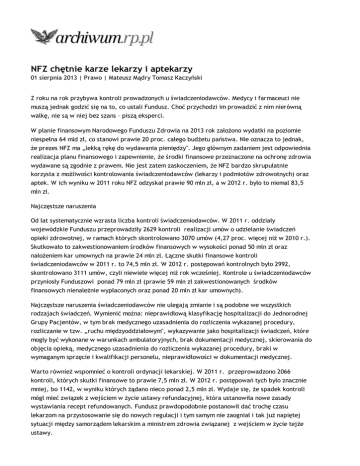 NFZ chętnie karze lekarzy i aptekarzy 01 sierpnia 2013 | Prawo | Mateusz Mądry Tomasz Kaczyński Z roku na rok przybywa kontroli prowadzonych u świadczeniodawców. Medycy i farmaceuci nie muszą jednak godzić się na to, co ustali Fundusz. Choć przychodzi im prowadzić z nim nierówną walkę, nie są w niej bez szans – piszą eksperci. W planie finansowym Narodowego Funduszu Zdrowia na 2013 rok założono wydatki na poziomie niespełna 64 mld zł, co stanowi prawie 20 proc. całego budżetu państwa. Nie oznacza to jednak, że prezes NFZ ma „lekką rękę do wydawania pieniędzy". Jego głównym zadaniem jest odpowiednia realizacja planu finansowego i zapewnienie, że środki finansowe przeznaczone na ochronę zdrowia wydawane są zgodnie z prawem. Nie jest zatem zaskoczeniem, że NFZ bardzo skrupulatnie korzysta z możliwości kontrolowania świadczeniodawców (lekarzy i podmiotów zdrowotnych) oraz aptek. W ich wyniku w 2011 roku NFZ odzyskał prawie 90 mln zł, a w 2012 r. było to niemal 83,5 mln zł. Najczęstsze naruszenia Od lat systematycznie wzrasta liczba kontroli świadczeniodawców. W 2011 r. oddziały wojewódzkie Funduszu przeprowadziły 2629 kontroli realizacji umów o udzielanie świadczeń opieki zdrowotnej, w ramach których skontrolowano 3070 umów (4,27 proc. więcej niż w 2010 r.). Skutkowało to zakwestionowaniem środków finansowych w wysokości ponad 50 mln zł oraz nałożeniem kar umownych na prawie 24 mln zł. Łączne skutki finansowe kontroli świadczeniodawców w 2011 r. to 74,5 mln zł. W 2012 r. postępowań kontrolnych było 2992, skontrolowano 3111 umów, czyli niewiele więcej niż rok wcześniej. Kontrole u świadczeniodawców przyniosły Funduszowi ponad 79 mln zł (prawie 59 mln zł zakwestionowanych środków finansowych nienależnie wypłaconych oraz ponad 20 mln zł kar umownych). Najczęstsze naruszenia świadczeniodawców nie ulegają zmianie i są podobne we wszystkich rodzajach świadczeń. Wymienić można: nieprawidłową klasyfikację hospitalizacji do Jednorodnej Grupy Pacjentów, w tym brak medycznego uzasadnienia do rozliczenia wykazanej procedury, rozliczanie w tzw. „ruchu międzyoddziałowym", wykazywanie jako hospitalizacji świadczeń, które mogły być wykonane w warunkach ambulatoryjnych, brak dokumentacji medycznej, skierowania do objęcia opieką, medycznego uzasadnienia do rozliczenia wykazanej procedury, braki w wymaganym sprzęcie i kwalifikacji personelu, nieprawidłowości w dokumentacji medycznej. Warto również wspomnieć o kontroli ordynacji lekarskiej. W 2011 r. przeprowadzono 2066 kontroli, których skutki finansowe to prawie 7,5 mln zł. W 2012 r. postępowań tych było znacznie mniej, bo 1142, w wyniku których żądano nieco ponad 2,5 mln zł. Wydaje się, że spadek kontroli mógł mieć związek z wejściem w życie ustawy refundacyjnej, która ustanowiła nowe zasady wystawiania recept refundowanych. Fundusz prawdopodobnie postanowił dać trochę czasu lekarzom na przystosowanie się do nowych regulacji i tym samym nie zaogniał i tak już napiętej sytuacji między samorządem lekarskim a ministrem zdrowia związanej z wejściem w życie tejże ustawy. Jeśli chodzi o apteki, w 2011 r. przeprowadzono 1696 postępowań kontrolnych, w wyniku których zakwestionowano refundację na ponad 7,5 mln zł. Najaktywniejszy w tym zakresie, podobnie zresztą jak w przypadku kontroli świadczeniodawców, był Mazowiecki Oddział Funduszu, który przeprowadził aż 733 kontrole. W 2012 r. w Mazowieckim Oddziale liczba kontroli spadła do 155. Łącznie w 2012 r. postępowań kontrolnych w całym kraju było 1076, czyli blisko 36,56 proc. mniej. Zakwestionowana kwota refundacji wyniosła 1,62 mln zł. Nałożono kary umowne w wysokości 32, 89 tys. zł. Powodem takiej różnicy w ilości kontroli może być zmiana podstawy prawnej. Z początkiem 2012 roku weszła w życie wspomniana już ustawa refundacyjna, która wyposażyła prezesa NFZ w nowe uprawnienia i uregulowała kwestie kontroli aptek. Natomiast dopiero w sierpniu prezes NFZ wydał zarządzenie regulujące kontrolę w aptekach w oparciu o nowe przepisy. Niezależnie jednak od zmiany stanu prawnego takie same pozostają błędy stwierdzane przez NFZ. Można je podzielić na błędy wynikające z braku odpowiedniego sprawdzenia recepty i błędy przy wydawaniu leku. Te pierwsze to w istocie sytuacje, w których błąd popełnia lekarz, a farmaceuta realizuje błędnie wystawioną receptę, w szczególności mowa tu o niepełnych danych uprawnionego lub wystawiającego receptę i brak podpisu lub pieczątki na recepcie. W drugim przypadku najczęstszymi naruszeniami są: wydanie leku niezgodnie z ordynacją lekarską, wydanie leku w ilości przekraczającej trzymiesięczne stosowanie, wydanie leku niezgodnie z uprawnieniami dodatkowymi pacjenta i realizacja recepty po upływie terminu ważności. Zastrzeżenia i zażalenia Stwierdzenie w wystąpieniu pokontrolnym naruszeń i żądanie zwrotu nienależnie przekazanych środków finansowych oraz nałożenie kar umownych nie musi automatycznie oznaczać obowiązku zapłaty określonych kwot na rzecz NFZ. Należy pamiętać o możliwości wniesienia zastrzeżeń do wystąpień pokontrolnych oraz zażaleń na czynności dyrektorów oddziałów wojewódzkich. W odniesieniu do samych świadczeniodawców tylko w roku 2011 w przypadku 117 postępowań kontrolnych zmieniono kwoty określone w wystąpieniach pokontrolnych na łączną wartość ponad 9 mln zł. Utrwalone orzecznictwo wskazuje, że w zakresie wystąpień pokontrolnych dyrektor OW NFZ nie jest organem administracyjnym, ponieważ prawa i obowiązki kontrolowanych podmiotów wynikają z umowy – stosunku cywilnoprawnego. Oznacza to, że kwestie kar umownych i obowiązku zwrotu nienależnie przekazanych środków finansowych nie leżą we właściwości sądów administracyjnych (zob. postanowienie Naczelnego Sądu Administracyjnego, sygn. II GSK 120