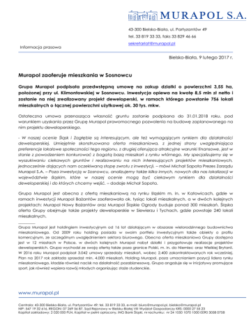 43-300 Bielsko-Biała, ul. Partyzantów 49 tel. 33 819 33 33, faks 33 829 46 66 Informacja prasowa [email protected] Bielsko-Biała, 9 lutego 2017 r. Murapol zaoferuje mieszkania w Sosnowcu Grupa Murapol podpisała przedwstępną umowę na zakup działki o powierzchni 3,55 ha, położonej przy ul. Klimontowskiej w Sosnowcu. Inwestycja opiewa na kwotę 8,5 mln zł netto i zostanie na niej zrealizowany projekt deweloperski, w ramach którego powstanie 756 lokali mieszkalnych o łącznej powierzchni użytkowej ok. 30 tys. mkw. Ostateczna umowa przenosząca własność gruntu zostanie podpisana do 31.01.2018 roku, pod warunkiem uzyskania przez Grupę Murapol prawomocnego pozwolenia na budowę zaplanowanego na nim projektu deweloperskiego. - W naszej ocenie Śląsk i Zagłębie są interesującym, ale też wymagającym rynkiem dla działalności deweloperskiej. Umiejętnie skonstruowana oferta mieszkaniowa, z jednej strony uwzględniająca preferencje lokalowe społeczności tego regionu, z drugiej oferująca atrakcyjne warunki finansowe, jest w stanie z powodzeniem konkurować z bogatą bazą mieszkań z rynku wtórnego. My specjalizujemy się w wyszukiwaniu ciekawych gruntów i realizowaniu na nich interesujących projektów mieszkaniowych, jednocześnie dających nam oczekiwaną stopę zwrotu z inwestycji. – mówi Michał Sapota Prezes Zarządu Murapol S.A. – Poza inwestycją w Sosnowcu, analizujemy także kilka innych, nowych dla nas lokalizacji w województwie śląskim, które w naszej ocenie mogą być ciekawym rynkiem dla działalności deweloperskiej i do których chcemy wejść. – dodaje Michał Sapota. Grupa Murapol jest obecna z ofertą mieszkaniową na rynku śląskim m. in. w Katowicach, gdzie w ramach inwestycji Murapol Bażantów zaoferowała ok. tysiąc lokali mieszkalnych, a w dwóch kolejnych projektach: Murapol Nowy Bażantów oraz Murapol Śląskie Ogrody buduje ponad 300 mieszkań. Śląska oferta Grupy obejmuje także projekty deweloperskie w Siewierzu i Tychach, gdzie powstaje 240 lokali mieszkalnych. ________ Grupa Murapol jest holdingiem inwestycyjnym od 16 lat działającym w obszarze wielorodzinnego budownictwa mieszkaniowego. Od 2009 roku holding posiada w swoim portfelu inwestycyjnym także obiekty o profilu komercyjnym, ze szczególnym uwzględnieniem sektora biurowego. Obecna oferta mieszkaniowa Grupy dostępna jest w 12 miastach w Polsce, w dwóch kolejnych Murapol nabył działki i przygotowuje realizacje projektów deweloperskich. Grupa wychodzi ze swoją ofertą także poza granice Polski, m. in. do Niemiec oraz Wielkiej Brytanii. W 2016 roku Murapol podpisał 3.042 umowy sprzedaży mieszkań, wobec 2.400 zakontraktowanych rok wcześniej. Plan na 2017 rok zakłada sprzedaż min. 4.000 mieszkań. Holding Murapol, poza umacnianiem pozycji lidera rynku mieszkaniowego, kładzie również nacisk na działalność pozabiznesową. Grupa angażuje się w inicjatywy promujące sport, jak również wspiera rozwój młodych organizując staże studenckie. www.murapol.pl Centrala: 43-300 Bielsko-Biała, ul. Partyzantów 49; tel. 33 819 33 33, e-mail: [email protected], [email protected] NIP: 547 19 32 616, REGON: 07 269 56 87, Sąd Rejonowy w Bielsku-Białej VIII Wydział Gospodarczy KRS: 0000 27 55 23 Kapitał zakładowy: 2 020 000 PLN, Kapitał w pełni opłacony, ING Bank Śląski, nr rachunku: nr 24 1050 1070 1000 0090 3058 0758 43-300 Bielsko-Biała, ul. Partyzantów 49 tel. 33 819 33 33, faks 33 829 46 66 Informacja prasowa [email protected] Kontakt: Małgorzata Gaborek | Dyrektor ds. Public Relations E: [email protected] | M: 510 896 877 www.murapol.pl Centrala: 43-300 Bielsko-Biała, ul. Partyzantów 49; tel. 33 819 33 33, e-mail: [email protected], [email protected] NIP: 547 19 32 616, REGON: 07 269 56 87, Sąd Rejonowy w Bielsku-Białej VIII Wydział Gospodarczy KRS: 0000 27 55 23 Kapitał zakładowy: 2 020 000 PLN, Kapitał w pełni opłacony, ING Bank Śląski, nr rachunku: nr 24 1050 1070 1000 0090 3058 0758
