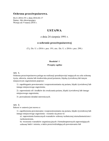 Ochrona przeciwpożarowa. Dz.U.2016.191 z dnia 2016.02.17 Status: Akt obowiązujący Wersja od: 9 marca 2016 r. USTAWA z dnia 24 sierpnia 1991 r. o ochronie przeciwpożarowej (T.j. Dz. U. z 2016 r. poz. 191; zm.: Dz. U. z 2016 r. poz. 298.) Rozdział 1 Przepisy ogólne Art. 1. Ochrona przeciwpożarowa polega na realizacji przedsięwzięć mających na celu ochronę życia, zdrowia, mienia lub środowiska przed pożarem, klęską żywiołową lub innym miejscowym zagrożeniem poprzez: 1) zapobieganie powstawaniu i rozprzestrzenianiu się pożaru, klęski żywiołowej lub innego miejscowego zagrożenia; 2) zapewnienie sił i środków do zwalczania pożaru, klęski żywiołowej lub innego miejscowego zagrożenia; 3) prowadzenie działań ratowniczych. Art. 2. Ilekroć w ustawie jest mowa o: 1) zapobieżeniu powstawaniu i rozprzestrzenianiu się pożaru, klęski żywiołowej lub innego miejscowego zagrożenia - rozumie się przez to: a) zapewnienie koniecznych warunków ochrony technicznej nieruchomościom i ruchomościom, b) tworzenie warunków organizacyjnych i formalnoprawnych zapewniających ochronę ludzi i mienia, a także przeciwdziałających powstawaniu lub minimalizujących skutki pożaru, klęski żywiołowej lub innego miejscowego zagrożenia; 2) działaniach ratowniczych - rozumie się przez to każdą czynność podjętą w celu ochrony życia, zdrowia, mienia lub środowiska, a także likwidację przyczyn powstania pożaru, wystąpienia klęski żywiołowej lub innego miejscowego zagrożenia; 3) innym miejscowym zagrożeniu - rozumie się przez to zdarzenie wynikające z rozwoju cywilizacyjnego i naturalnych praw przyrody niebędące pożarem ani klęską żywiołową, stanowiące zagrożenie dla życia, zdrowia, mienia lub środowiska, któremu zapobieżenie lub którego usunięcie skutków nie wymaga zastosowania nadzwyczajnych środków; 4) krajowym systemie ratowniczo-gaśniczym - rozumie się przez to integralną część organizacji bezpieczeństwa wewnętrznego państwa, obejmującą, w celu ratowania życia, zdrowia, mienia lub środowiska, prognozowanie, rozpoznawanie i zwalczanie pożarów, klęsk żywiołowych lub innych miejscowych zagrożeń; system ten skupia jednostki ochrony przeciwpożarowej, inne służby, inspekcje, straże, instytucje oraz podmioty, które dobrowolnie w drodze umowy cywilnoprawnej zgodziły się współdziałać w akcjach ratowniczych. Rozdział 2 Zapobieganie pożarowi, klęsce żywiołowej lub innemu miejscowemu zagrożeniu Art. 3. 1. Osoba fizyczna, osoba prawna, organizacja lub instytucja korzystające ze środowiska, budynku, obiektu lub terenu są obowiązane zabezpieczyć je przed zagrożeniem pożarowym lub innym miejscowym zagrożeniem. 2. Właściciel, zarządca lub użytkownik budynku, obiektu lub terenu, a także podmioty, o których mowa w ust. 1, ponoszą odpowiedzialność za naruszenie przepisów przeciwpożarowych, w trybie i na zasadach określonych w innych przepisach. Art. 4. 1. Właściciel budynku, obiektu budowlanego lub terenu, zapewniając ich ochronę przeciwpożarową, jest obowiązany: 1) przestrzegać przeciwpożarowych wymagań techniczno-budowlanych, instalacyjnych i technologicznych; 2) wyposażyć budynek, obiekt budowlany lub teren w wymagane urządzenia przeciwpożarowe i gaśnice; 3) zapewnić konserwację oraz naprawy urządzeń przeciwpożarowych i gaśnic w sposób gwarantujący ich sprawne i niezawodne funkcjonowanie; 4) zapewnić osobom przebywającym w budynku, obiekcie budowlanym lub na terenie, bezpieczeństwo i możliwość ewakuacji; 5) przygotować budynek, obiekt budowlany lub teren do prowadzenia akcji ratowniczej; 6) zapoznać pracowników z przepisami przeciwpożarowymi; 7) ustalić sposoby postępowania na wypadek powstania pożaru, klęski żywiołowej lub innego miejscowego zagrożenia. 1a. Odpowiedzialność za realizację obowiązków z zakresu ochrony przeciwpożarowej, o których mowa w ust. 1, stosownie do obowiązków i zadań powierzonych w odniesieniu do budynku, obiektu budowlanego lub terenu, przejmuje - w całości lub w części - ich zarządca lub użytkownik, na podstawie zawartej umowy cywilnoprawnej ustanawiającej zarząd lub użytkowanie. W przypadku gdy umowa taka nie została zawarta, odpowiedzialność za realizację obowiązków z zakresu ochrony przeciwpożarowej spoczywa na faktycznie władającym budynkiem, obiektem budowlanym lub terenem. 2. Czynności z zakresu ochrony przeciwpożarowej mogą wykonywać osoby posiadające odpowiednie kwalifikacje. 2a. Osoby wykonujące czynności z zakresu ochrony przeciwpożarowej, w tym czynności, o których mowa w ust. 1, polegające na zapobieganiu powstawaniu i rozprzestrzenianiu się pożaru, niezatrudnione w jednostkach ochrony przeciwpożarowej, o których mowa w art. 15 pkt 1a-5 i 8, powinny posiadać tytuł zawodowy inżynier pożarnictwa lub ukończone w Szkole Głównej Służby Pożarniczej studia wyższe w zakresie inżynierii bezpieczeństwa w specjalności inżynieria bezpieczeństwa pożarowego. 2b. Osoby niezatrudnione w jednostkach ochrony przeciwpożarowej, o których mowa w art. 15 pkt 1a-5 i 8, wykonujące czynności wyłącznie w zakresie wynikającym z ust. 1, powinny posiadać co najmniej wykształcenie średnie i uprawnienia inspektora ochrony przeciwpożarowej lub kwalifikacje do wykonywania zawodu technik pożarnictwa. 3. (uchylony) Art. 4a. 1. Uprawnienia inspektora ochrony przeciwpożarowej nabywa na okres 5 lat osoba, która ukończyła: 1) szkolenie inspektorów ochrony przeciwpożarowej albo 2) szkolenie aktualizujące inspektorów ochrony przeciwpożarowej - zwane dalej "szkoleniami". 2. Ukończenie szkoleń stwierdzają odpowiednio zaświadczenie o ukończeniu szkolenia inspektorów ochrony przeciwpożarowej albo zaświadczenie o ukończeniu szkolenia aktualizującego inspektorów ochrony przeciwpożarowej. 3. Okres 5 lat, na który nabywa się uprawnienia inspektora ochrony przeciwpożarowe