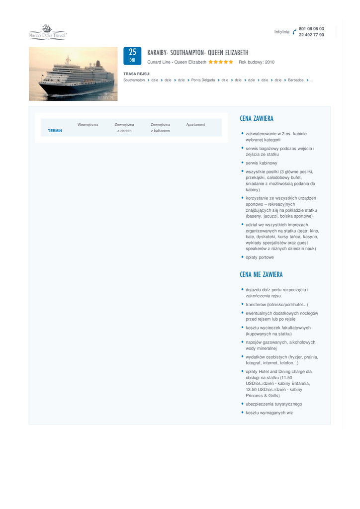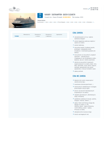 Infolinia 25 KARAIBY- SOUTHAMPTON- QUEEN ELIZABETH DNI Cunard Line - Queen Elizabeth 801 08 08 03 22 492 77 90 | Rok budowy: 2010 TRASA REJSU: Southampton Wewnętrzna TERMIN dzie dzie Zewnętrzna Zewnętrzna z oknem z balkonem dzie Ponta Delgada Apartament dzie dzie dzie dzie dzie Barbados ... CENA ZAWIERA zakwaterowanie w 2-os. kabinie wybranej kategorii serwis bagażowy podczas wejścia i zejścia ze statku serwis kabinowy wszystkie posiłki (3 główne posiłki, przekąski, całodobowy bufet, śniadanie z możliwością podania do kabiny) korzystanie ze wszystkich urządzeń sportowo – rekreacyjnych znajdujących się na pokładzie statku (baseny, jacuzzi, boiska sportowe) udział we wszystkich imprezach organizowanych na statku (teatr, kino, bale, dyskoteki, kursy tańca, kasyno, wykłady specjalistów oraz guest speakerów z różnych dziedzin nauk) opłaty portowe CENA NIE ZAWIERA dojazdu do/z portu rozpoczęcia i zakończenia rejsu transferów (lotnisko/port/hotel...) ewentualnych dodatkowych noclegów przed rejsem lub po rejsie kosztu wycieczek fakultatywnych (kupowanych na statku) napojów gazowanych, alkoholowych, wody mineralnej wydatków osobistych (fryzjer, pralnia, fotograf, internet, telefon...) opłaty Hotel and Dining charge dla obsługi na statku (11.50 USD/os./dzień - kabiny Britannia, 13.50 USD/os./dzień - kabiny Princess & Grills) ubezpieczenia turystycznego kosztu wymaganych wiz