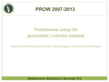 PROW 2007-2013 Podstawowe usługi dla gospodarki i ludności wiejskiej (budowa mikroinstlacji prosumenckich wykorzystujących odnawialne źródła energii) Ministerstwo Rolnictwa i Rozwoju Wsi Legislacja W dniu 24 marca 2015 r. Minister Rolnictwa i Rozwoju Wsi podpisał rozporządzenie MRiRW zmieniające rozporządzenie z dnia 1 kwietnia 2008 r. w sprawie szczegółowych warunków i trybu przyznawania oraz wypłaty pomocy finansowej w ramach działania „Podstawowe usługi dla gospodarki i ludności wiejskiej” objętego Programem Rozwoju Obszarów Wiejskich na lata 2007-2013. W dniu 25 marca 2015 r. podpisane rozporządzenie zostało skierowane do publikacji w Dzienniku Urzędowym Rozporządzenia ukazało się w Dzienniku Ustaw – 3.04.2015 r. (rozporządzenie wchodzi w życie z dniem następującym po dniu ogłoszenia) W dniu 25 marca 2015 r. MRiRW zaakceptowało wzór przygotowanego przez ARiMR Wniosku o przyznanie pomocy wraz z Instrukcją wypełniania Ministerstwo Rolnictwa i Rozwoju Wsi OZE w PROW 2007-2013 Beneficjent: gmina Stawka pomocy: 90% kosztów kwalifikowalnych operacji Maksymalna wysokość pomocy dla beneficjenta (na jedną gminę) 200 000 euro Badamy poziom pomocy de minimis w tym roku podatkowym oraz w dwóch ubiegłych Planowany termin naboru wniosków: druga połowa kwietnia 2015 r. Lista operacji: a) na poziomie województwa b) na poziomie kraju BUDŻET: 22 750 000 euro Liczba projektów: 114 Ministerstwo Rolnictwa i Rozwoju Wsi O jakich mikroinstalacjach mówimy? Definicja mikroinstalacji w ustawie z dnia 20 lutego 2015 r. o odnawialnych źródłach energii. Art. 2 pkt 19: „mikroinstalacja – instalacja odnawialnego źródła energii o łącznej mocy zainstalowanej elektrycznej nie większej niż 40 kW, przyłączona do sieci elektroenergetycznej o napięciu znamionowym niższym niż 110 kV lub o mocy osiągalnej cieplnej w skojarzeniu nie większej niż 120 kW” Jakie operacje zatem można realizować? Wszystkie rodzaje mikroinstalacji prosumenckich wykorzystujących odnawialne źródła energii: Energia elektryczna (np. ogniwa fotowoltaiczne, małe elektrownie wiatrowe oraz układy mikrogeneracyjne); Energia cieplna i energia elektryczna (np. kotły na biomasę, kolektory słoneczne, pompy ciepła, ogniwa fotowoltaiczne). Na co pozwoli nam czas? – patrz: Ustawa prawo budowlane Ministerstwo Rolnictwa i Rozwoju Wsi Na potrzeby własne / gospodarstwa domowego (?) Wytworzona w ramach budowy mikroinstalacji energia elektryczna lub cieplna może być wykorzystana (przez gminę) wyłącznie na potrzeby własne. W przypadku gdy mikroinstalacja zostanie zamontowana na obiektach, które nie są obiektami użyteczności publicznej (osoba fizyczna), wytworzona energia elektryczna lub cieplna może być wykorzystywana wyłącznie na potrzeby gospodarstw domowych. „Ankieta gospodarstwa domowego” Program funkcjonalno użytkowy Cyt. za zmienionym rozporządzeniem: „§ 3 ust. 4 Operacja dotycząca mikroinstalacji prosumenckich, oprócz budowy mikroinstalacji prosumenckich na obiektach użyteczności publicznej, może być realizowana również na obiektach niebędących obiektami użyteczności publicznej, pod warunkiem, że wytworzona energia elektryczna lub cieplna będzie wykorzystana wyłącznie na potrzeby gospodarstw domowych.”; Ministerstwo Rolnictwa i Rozwoju Wsi Nowe kryterium wyboru dla mikroinstalacji prosumenckich jeżeli koszty kwalifikowalne operacji dotyczą budowy mikroinstalacji prosumenckich, na obiektach niebędących obiektami użyteczności publicznej na poziomie: a) niższym niż 50% kosztów kwalifikowalnych – 0 punktów b) równym lub wyższym niż 50% kosztów kwalifikowalnych – 4 punkty Plus dotychczasowe kryteria, tj.: - dochód podatkowy – do 4 pkt - bezrobocie w powiecie – do 2 pkt - kryterium regionalne – do 2 pkt - kwota dofinansowania – 2 pkt (?) Aby znaleźć się na liście operacji projekt (operacja) musi uzyskać minimum 5 pkt. Ministerstwo Rolnictwa i Rozwoju Wsi Wniosek o przyznanie pomocy (1) Zmienione rozporządzenie mówi: 11 ust. 1 otrzymuje brzmienie: „1. Jeżeli złożony wniosek o przyznanie pomocy jest wypełniony nieprawidłowo lub zawiera braki, wzywa się wnioskodawcę, na piśmie, do usunięcia nieprawidłowości lub braków, w terminie 14 dni, a w przypadku operacji dotyczących budowy mikroinstalacji prosumenckich w terminie 7 dni – od dnia doręczenia wezwania. ust. 2 pkt 2 otrzymuje brzmienie: 2) usunął w terminie nie wszystkie nieprawidłowości lub braki, wzywa się go ponownie, na piśmie, do usunięcia pozostałych nieprawidłowości lub braków, w terminie 14 dni, a w przypadku operacji dotyczących budowy mikroinstalacji prosumenckich w terminie 7 dni – od dnia doręczenia wezwania.”, oraz ust. 4 wprowadzenie do wyliczenia otrzymuje brzmienie: „Złożony wniosek o przyznanie pomocy, z wyjątkiem wniosku o przyznanie pomocy na budowę mikroinstalacji prosumenckich, może być zmieniony przez wnioskodawcę:”; Dwie poprawki – dla każdej max. 7 dni Ministerstwo Rolnictwa i Rozwoju Wsi Wniosek o przyznanie pomocy (2) Zmienione rozporządzenie mówi: „ 12 ust 1 otrzymuje brzmienie: „Wniosek o przyznanie pomocy jest rozpatrywany w terminie 3 miesięcy, a w przypadku operacji dotyczących budowy mikroinstalacji prosumenckich w terminie 45 dni – od upływu terminu, o którym mowa w 6 ust. 1.” 6 i pół tygodnia Ministerstwo Rolnictwa i Rozwoju Wsi Wniosek o przyznanie pomocy (3) Zmienione rozporządzenie mówi: W 6 ust. 1 dodaje się ust. 3 w brzmieniu: „3. W przypadku operacji dotyczących budowy mikroinstalacji prosumenckich termin na rozpatrzenie wniosku o przyznanie pomocy, o którym mowa w ust. 1, kończy się w dniu przekazania Agencji Restrukturyzacji i Modernizacji Rolnictwa zatwierdzonej przez właściwy organ samorządu województwa listy operacji, o której mowa w termin lista operacji zarząd województwa Ministerstwo Rolnictwa i Rozwoju Wsi 13 ust 6.”; lista k