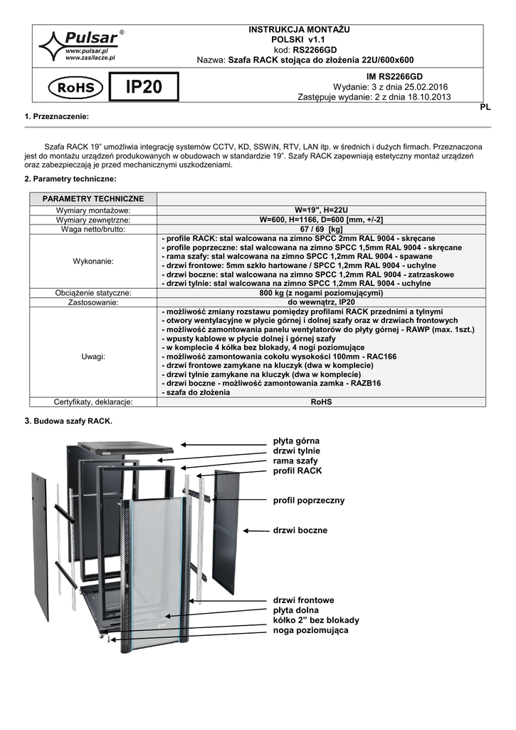 INSTRUKCJA MONTAŻU POLSKI v1.1 kod: RS2266GD Nazwa: Szafa RACK stojąca do złożenia 22U/600x600 IM RS2266GD Wydanie: 3 z dnia 25.02.2016 Zastępuje wydanie: 2 z dnia 18.10.2013 PL 1. Przeznaczenie: Szafa RACK 19” umożliwia integrację systemów CCTV, KD, SSWiN, RTV, LAN itp. w średnich i dużych firmach. Przeznaczona jest do montażu urządzeń produkowanych w obudowach w standardzie 19”. Szafy RACK zapewniają estetyczny montaż urządzeń oraz zabezpieczają je przed mechanicznymi uszkodzeniami. 2. Parametry techniczne: PARAMETRY TECHNICZNE Wymiary montażowe: Wymiary zewnętrzne: Waga netto/brutto: Wykonanie: Obciążenie statyczne: Zastosowanie: Uwagi: Certyfikaty, deklaracje: W=19", H=22U W=600, H=1166, D=600 [mm, +/-2] 67 / 69 [kg] - profile RACK: stal walcowana na zimno SPCC 2mm RAL 9004 - skręcane - profile poprzeczne: stal walcowana na zimno SPCC 1,5mm RAL 9004 - skręcane - rama szafy: stal walcowana na zimno SPCC 1,2mm RAL 9004 - spawane - drzwi frontowe: 5mm szkło hartowane / SPCC 1,2mm RAL 9004 - uchylne - drzwi boczne: stal walcowana na zimno SPCC 1,2mm RAL 9004 - zatrzaskowe - drzwi tylnie: stal walcowana na zimno SPCC 1,2mm RAL 9004 - uchylne 800 kg (z nogami poziomującymi) do wewnątrz, IP20 - możliwość zmiany rozstawu pomiędzy profilami RACK przednimi a tylnymi - otwory wentylacyjne w płycie górnej i dolnej szafy oraz w drzwiach frontowych - możliwość zamontowania panelu wentylatorów do płyty górnej - RAWP (max. 1szt.) - wpusty kablowe w płycie dolnej i górnej szafy - w komplecie 4 kółka bez blokady, 4 nogi poziomujące - możliwość zamontowania cokołu wysokości 100mm - RAC166 - drzwi frontowe zamykane na kluczyk (dwa w komplecie) - drzwi tylnie zamykane na kluczyk (dwa w komplecie) - drzwi boczne - możliwość zamontowania zamka - RAZB16 - szafa do złożenia RoHS 3. Budowa szafy RACK. płyta górna drzwi tylnie rama szafy profil RACK profil poprzeczny drzwi boczne drzwi frontowe płyta dolna kółko 2” bez blokady noga poziomująca 4. Instrukcja złożenia szafy RACK: Szafa RACK stojąca do złożenia dostarczana jest w 5 osobnych opakowaniach. 4.1) Położyć poziomo dwie ramy szafy RACK (paczka 2/5 i 3/5) Rys.1 4.2) Do ram szafy RACK dostawić z lewej strony płytę dolną szafy, z prawej płytę górną (paczka 1/5). Skręcić śrubami z nakrętkami (16szt - paczka 1/5). Wkręcić do płyty dolnej szafy kółka i nóżki (paczka 1/5). Rys.2 4.3) Postawić szafę RACK do pionu. Rys.3 4.4) W ramach szafy zamontować od wewnątrz (z przodu i tyłu) po dwa koszyki w 1/4 i 3/4 wysokości szafy, zgodnie z rysunkiem poniżej. Rys.4 4.5) W profilach poprzecznych (paczka 1/5) zamontować z przodu i tyłu, po dwa koszyki tak jak na rys.4. tył przód Rys.5 4.6) Zamontować od wnętrza profile poprzeczne, tak jak na rysunku 6. Rys.6. 4.7) Zamontować od wnętrza profile RACK wg. Rys.7 Rys.7 4.8) Zamontować do szafy RACK drzwiczki boczne, tylnie i przednie - Rys.8 Rys.8 PRODUCENT Pulsar Siedlec 150, 32-744 Łapczyca Tel. 14-610-19-40, Fax. 14-610-19-50 e-mail: [email protected], [email protected] http:// www.pulsar.pl, www.zasilacze.pl GWARANCJA: 12 miesięcy od daty sprzedaży GWARANCJA WAŻNA tylko po okazaniu faktury sprzedaży, której dotyczy reklamacja