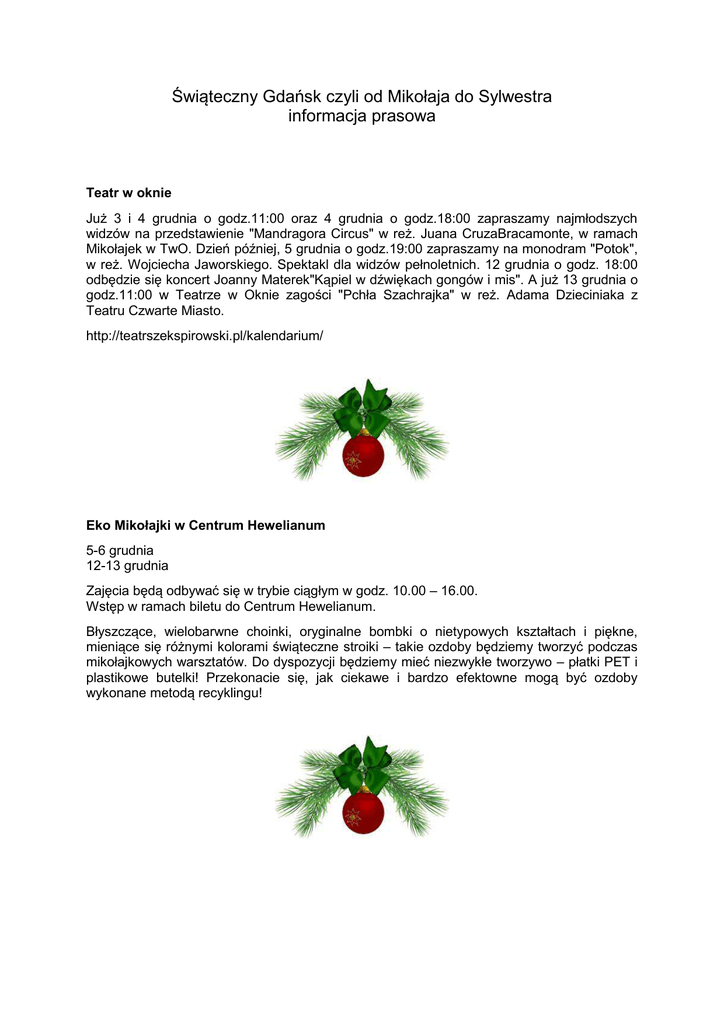 Świąteczny Gdańsk czyli od Mikołaja do Sylwestra informacja prasowa Teatr w oknie Już 3 i 4 grudnia o godz.11:00 oraz 4 grudnia o godz.18:00 zapraszamy najmłodszych widzów na przedstawienie "Mandragora Circus" w reż. Juana CruzaBracamonte, w ramach Mikołajek w TwO. Dzień później, 5 grudnia o godz.19:00 zapraszamy na monodram "Potok", w reż. Wojciecha Jaworskiego. Spektakl dla widzów pełnoletnich. 12 grudnia o godz. 18:00 odbędzie się koncert Joanny Materek"Kąpiel w dźwiękach gongów i mis". A już 13 grudnia o godz.11:00 w Teatrze w Oknie zagości "Pchła Szachrajka" w reż. Adama Dzieciniaka z Teatru Czwarte Miasto. http://teatrszekspirowski.pl/kalendarium/ Eko Mikołajki w Centrum Hewelianum 5-6 grudnia 12-13 grudnia Zajęcia będą odbywać się w trybie ciągłym w godz. 10.00 – 16.00. Wstęp w ramach biletu do Centrum Hewelianum. Błyszczące, wielobarwne choinki, oryginalne bombki o nietypowych kształtach i piękne, mieniące się różnymi kolorami świąteczne stroiki – takie ozdoby będziemy tworzyć podczas mikołajkowych warsztatów. Do dyspozycji będziemy mieć niezwykłe tworzywo – płatki PET i plastikowe butelki! Przekonacie się, jak ciekawe i bardzo efektowne mogą być ozdoby wykonane metodą recyklingu! „Smakuj Trójmiasto” Miejski Festiwal kulinarny 5 grudnia godz. 11.00 - 20.00 Garnizon Kultury W Festiwalu udział weźmie większość topowych restauracji z całego Trójmiasta, które przygotują dla odwiedzających swoje potrawy w dwóch odsłonach - degustacyjnej i normalnej - obiadowej w cenie 5, 10, 15 i 20 zł na miejscu i na wynos. Nie zabraknie też najlepszych cukierni i firm ze świątecznym designem. Będzie Mikołaj, słodkości, warsztaty, choinki - będzie świątecznie! W programie m.in.: Warsztaty: 11:00-12:00 oraz 12:00 -13:00 Warsztaty dekorowania pierników dla dzieci (T. Deker) 13:30 - 14:30 Warsztaty dekoracji świątecznych w słoikach i butelkach (Agu Leśniewska) 15:00 - 16:00 Warsztaty dekoracji świątecznych w naczyniach (Agu Leśniewska) 16:30 - 17:30 Warsztaty dekoracji świątecznych dla dzieci (Yashka) Zapisy na warsztaty: Miejsce: Stary Maneż [email protected] Koszt: 50 zł / osoba Pokazy: 13:15 Pokaz lepienia pierogów (Pierogi z drogi) 18:00 Pokaz dekorowania świątecznego stołu w stylu EKO (Agu Leśniewska) Wstęp wolny! https://www.facebook.com/SmakujTrojmiasto/?fref=ts Mikołajki na lodowisku Scena Muzyczna Gdańskiego Archipelagu Kultury we współpracy z Fundacją Obudź Nadzieję zaprasza na wyjątkowy dzień mikołajkowy na Lodowisku Miejskim w Gdańsku. Start 5 grudnia, ślizgawkami o godz. 16:00 i 17:30. W programie wspaniała zabawa, mikołajkowe konkursy z nagrodami oraz Święty Mikołaj i jego pomocnicy. Swoją obecność zapowiedział również towarzyszący biało-zielonym, wyjątkowo niegroźny i sympatyczny LEW, maskotka klubowa Lechii Gdańsk! W tym roku Mikołajki obchodzimy 5 grudnia, a w związku z tym, że ma być to dzień magiczny, pełen niespodzianek i spełnionych marzeń, w którym zgodnie z tradycją obdarowujemy się wzajemnie prezentami, zapraszamy wszystkich do wzięcia udziału w świątecznej zbiórce słodyczy i materiałów szkolnych dla podopiecznych Fundacji Obudź Nadzieję. Wszystkie osoby, które przyłączą się do akcji i przekażą na rzecz dzieciaków drobne upominki zostaną obdarowane bezpłatnym biletem wstępu na Lodowisko. Zapraszamy więc wszystkich przyjaciół św. Mikołaja - śnieżynki, elfy, krasnale, czarodzieje i dobre wróżki do wspólnej mikołajkowej zabawy na Lodowisku Miejskim! Mikołaje na motocyklach 6 grudnia Stadion Energa Gdańsk Start: godz. 11.00 Parada Mikołajów na Motocyklach. Wielki zryw pozytywnie zakręconych użytkowników motocykli i quadów już po raz XIII przejedzie ulicami Gdańska. Wszystko po to, aby pomóc dzieciom. Od początku akcji dzięki zebranym środkom udało się ufundować dziesiątki tysięcy ciepłych posiłków dla wychowanków ośrodków szkolno-wychowawczych na terenie woj. pomorskiego, Mikołaje z podarunkami dotarli również do tysięcy małych pacjentów przebywających na oddziałach trójmiejskich szpitali. W tym roku Mikołaje na Motocyklach pokonają łącznie trasę 26 km. Zbiórka od godz. 9.00 Stadion Energa Gdańsk. Meta w Gdyni. http://www.mikolaje.gd.pl/portal/ Zrób prezent – podziel się sobą Już po raz drugi gdański Zakład Komunikacji Miejskiej przyłącza się do mikołajkowej akcji „Zrób prezent – podziel się sobą”. 6 grudnia na tory wyjedzie specjalny tramwaj, w którym będzie można zrobić np. badania profilaktyczne, nauczyć się pierwszej pomocy, ale przede wszystkim będzie można się zarejestrować jako potencjalny dawca szpiku. W niedzielę 6 grudnia, tuż przed godziną 16:00, na przystanku Strzyża PKM będzie można wsiąść do specjalnego tramwaju mikołajkowego. Tramwaj będzie widoczny już z daleka, dzięki specjalnym dekoracjom. A w środku będzie można zrobić profilaktyczne badania, zarejestrować się jako potencjalny dawca szpiku, podpisać oświadczenie woli w sprawie oddania organów do transplantacji i nauczyć udzielania pierwszej pomocy. Dla wszystkich pasażerów drobne upominki. Tramwaj pojedzie przez Wrzeszcz, Centrum do przystanku Łostowice Świętokrzyska i z powrotem do Pętli Strzyża. Podzielić się sobą będzie można prawie do 21:00. Przejazdy są bezpłatne, tramwaj zatrzymuje się na wszystkich przystankach na trasie. Akcję organizują Fundacja z Pompą – Pomóż Dzieciom z Białaczką, Fundacja imienia Bartka Kruczkowskiego Organiści, Stowarzyszenie Na Rzecz Ratownictwa „Adiutare”, Koło Pediatrii przy Klinice Pediatrii, Hematologii i Onkologii GUMed oraz Zakład Komunikacji Miejskiej w Gdańsku. Mikołajki w zabytkowym tramwaju Tradycyjnie z okazji 6 grudnia gdański Zakład Komunikacji Miejskiej zaprasza na przejażdżki mikołajkowym tramwajem. Specjalnie udekorowany historyczny wagon będzie jeździł od 10: