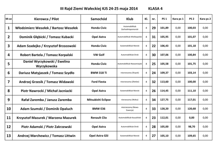 III Rajd Ziemi Wałeckiej KJS 24-25 maja 2014 KLASA 4 M-ce Kierowca / Pilot Samochód Klub Kl. nr. PS 1 Kara ps 1 PS 2 Kara ps 2 1 Włodzimierz Wesołek / Bartosz Wesołek Honda Civic Automobilklub Zachodniopomorski 4 29 101,89 0,00 100,03 0,00 2 Dominik Głębicki / Tomasz Kubacki Opel Astra Automobilklub Wielkopolski 4 31 105,95 0,00 101,07 0,00 3 Adam Szadejko / Krzysztof Brzozowski Honda Civic Automobilklub Morski 4 22 106,43 0,00 101,18 0,00 4 Robert Bartela / Tomasz Korpalski VW Golf Automobilklub Orski 4 30 107,06 0,00 100,84 0,00 5 Daniel Wyrzykowski / Ewelina Wyrzykowska Honda Civic Automobilklub Nowomiejski 4 25 105,58 0,00 101,75 0,00 6 Dariusz Matyjaszek / Tomasz Szydło BWM 318 Ti niezrzeszony (Słupsk) 4 24 109,37 0,00 103,14 0,00 7 Andrzej Grzesik / Tomasz Widawski Ford Fiesta niezrzeszony (Złotów) 4 32 113,60 0,00 100,00 0,00 8 Piotr Nawrocki / Michał Jacniacki Opel Astra Automobilklub Morski 4 26 114,45 0,00 111,10 0,00 9 Rafał Zaremba / Janusz Zaremba Mitsubishi Eclipse nierzeszony (Wałcz) 4 34 127,75 0,00 117,01 0,00 10 Adam Szumski / Dominik Opaluch BMW E36 niezrzeszony (Nowa Szwecja) 4 33 128,20 0,00 120,68 0,00 11 Krzysztof Mazurek / Marzena Mazurek Renault Clio Automobilklub Koszaliński 4 23 112,01 0,00 0,00 0,00 12 Piotr Adamski / Piotr Zakrzewski Opel Astra Automobilklub Orski 4 28 105,00 0,00 98,70 0,00 13 Andrzej Marchewicz / Tomasz Littwin Opel Astra GSI Automobilklub Morski 4 27 105,10 0,00 109,65 0,00 III Rajd Ziemi Wałeckiej KJS 24-25 maja 2014 PS 3 Kara ps 3 PS 4 Kara ps 4 PS 5 Kara ps 5 PS 6 Kara ps 6 PS 7 83,62 0,00 101,89 0,00 98,78 0,00 84,03 0,00 48,76 0,00 85,29 0,00 106,40 0,00 101,09 0,00 84,53 0,00 49,16 85,21 0,00 104,62 0,00 100,78 0,00 85,71 0,00 88,52 0,00 104,82 0,00 99,78 5,00 85,97 88,96 0,00 106,85 0,00 101,75 0,00 89,83 0,00 106,31 0,00 103,14 90,44 0,00 110,96 0,00 94,61 0,00 114,20 100,52 0,00 104,31 KLASA 4 Kara ps 7 Kary PKC Kary ZSS WYNIK 0,00 0,00 619,00 0,00 0,00 0,00 633,49 -14,49 56,02 0,00 0,00 0,00 639,95 -20,95 0,00 49,42 0,00 0,00 0,00 641,41 -22,41 88,12 0,00 51,82 0,00 0,00 0,00 644,83 -25,83 0,00 86,89 0,00 54,58 0,00 0,00 0,00 653,26 -34,26 105,25 0,00 88,48 0,00 52,67 0,00 0,00 0,00 661,40 -42,40 0,00 112,20 0,00 85,75 0,00 55,00 0,00 0,00 0,00 687,31 -68,31 120,89 0,00 119,90 5,00 97,01 0,00 57,39 0,00 0,00 0,00 745,47 -126,47 0,00 129,93 0,00 119,53 0,00 98,35 0,00 57,91 0,00 0,00 0,00 758,91 -139,91 0,00 0,00 nu 0,00 nu 0,00 nu 0,00 nu 0,00 10000,00 0,00 nu 82,34 0,00 0,00 0,00 0,00 0,00 0,00 0,00 0,00 0,00 10000,00 0,00 nu 94,23 0,00 0,00 0,00 0,00 0,00 0,00 0,00 0,00 0,00 10000,00 0,00 nu