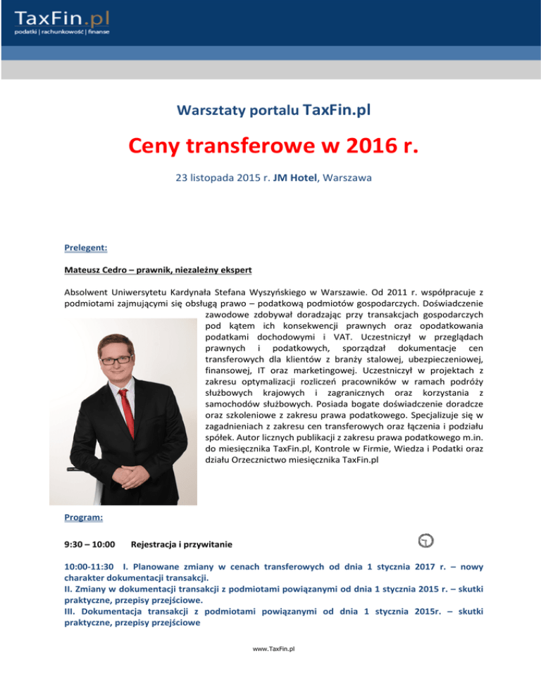 Warsztaty portalu TaxFin.pl Ceny transferowe w 2016 r. 23 listopada 2015 r. JM Hotel, Warszawa Prelegent: Mateusz Cedro – prawnik, niezależny ekspert Absolwent Uniwersytetu Kardynała Stefana Wyszyńskiego w Warszawie. Od 2011 r. współpracuje z podmiotami zajmującymi się obsługą prawo – podatkową podmiotów gospodarczych. Doświadczenie zawodowe zdobywał doradzając przy transakcjach gospodarczych pod kątem ich konsekwencji prawnych oraz opodatkowania podatkami dochodowymi i VAT. Uczestniczył w przeglądach prawnych i podatkowych, sporządzał dokumentacje cen transferowych dla klientów z branży stalowej, ubezpieczeniowej, finansowej, IT oraz marketingowej. Uczestniczył w projektach z zakresu optymalizacji rozliczeń pracowników w ramach podróży służbowych krajowych i zagranicznych oraz korzystania z samochodów służbowych. Posiada bogate doświadczenie doradcze oraz szkoleniowe z zakresu prawa podatkowego. Specjalizuje się w zagadnieniach z zakresu cen transferowych oraz łączenia i podziału spółek. Autor licznych publikacji z zakresu prawa podatkowego m.in. do miesięcznika TaxFin.pl, Kontrole w Firmie, Wiedza i Podatki oraz działu Orzecznictwo miesięcznika TaxFin.pl Program: 9:30 – 10:00 Rejestracja i przywitanie 10:00-11:30 I. Planowane zmiany w cenach transferowych od dnia 1 stycznia 2017 r. – nowy charakter dokumentacji transakcji. II. Zmiany w dokumentacji transakcji z podmiotami powiązanymi od dnia 1 stycznia 2015 r. – skutki praktyczne, przepisy przejściowe. III. Dokumentacja transakcji z podmiotami powiązanymi od dnia 1 stycznia 2015r. – skutki praktyczne, przepisy przejściowe www.TaxFin.pl a) Nowy rozszerzony katalog podmiotów objętych przepisami o stosowaniu cen rynkowych. b) Nowy poszerzony zakres przedmiotowy transakcji objętych obowiązkiem dokumentacyjnym – transakcje z zakładem zagranicznym c) Nowy zwiększony zakres podmiotowy transakcji objętych obowiązkiem sporządzania dokumentacji cen transferowych d) Nowy zakres określania korekty dochodu w razie doszacowania – praktyczne skutki zmiany działania organów. e) Inne zmiany. 11:30 – 11:45 Przerwa na kawę 11:45-13:15 IV. Zmiany w zakresie przepisów o stosowaniu cen rynkowych – skutki nowelizacji Rozporządzenia MF obowiązującej od dnia 18 lipca 2013 r.: a) Pierwszeństwo metod porównawczych przed transakcyjnymi - nowa hierarchia metod szacowania cen. b) Zmiana zasad przeprowadzania porównywalności transakcji, − zasady porównywalności transakcji na gruncie Wytycznych OECD, − zasady porównywalności transakcji na gruncie polskiego systemu prawnego – istota analizy funkcjonalnej, c) Restrukturyzacja działalności podmiotów powiązanych objęta obowiązkiem dokumentacyjnym – praktyczne skutki, d) Katalog usług o niskiej wartości dodanej: − co to jest usługa o niskiej wartości dodanej – aspekty praktyczne, − zasady sporządzania dokumentacji usług o niskiej wartości dodanej. e) Koszty udziałowca (akcjonariusza) – zasady opisywania. V. Podstawowe zasady sporządzania dokumentacji cen transferowych: a) Identyfikacja podmiotów zobowiązanych do sporządzenia dokumentacji cen transferowych. Obowiązujące progi dokumentacyjne, − Podmioty powiązane w sposób kapitałowy, − Podmioty powiązane w sposób pionowy, − Podmioty powiązane w sposób poziomy, − Podmioty powiązane w sposób bezpośredni, − Podmioty powiązane w sposób pośredni, − Podmioty powiązane w sposób personalny. − Podmioty powiązane w sposób rodzinny, b) Obowiązujące progi dokumentacyjne – problem „sumowania” c) Niezbędne elementy dokumentacji cen transferowych – ujęcie praktyczne. d) Analiza funkcjonalna i jej wpływ na wybór metody szacowania cen transakcyjnych: www.TaxFin.pl − analiza warunków transakcji – problemy porównawcze, − różnice istotnych cech transakcji i produktów, − analiza przebiegu transakcji, − wpływ warunków transakcji na wartość rynkową transakcji, − analiza różnic porównywalnych rynków, − strategia gospodarcza podmiotów powiązanych. e) Obowiązek dokumentacyjny – sankcje i odpowiedzialność karna skarbowa. f) Uprzednie porozumienie cenowe – czy warto je zawrzeć? g) Zasada swobody umów a cena rynkowa – problemy praktyczne. 13:15-14:00 Lunch 14.00 – 15.45 VI. Metody szacowania cen transferowych w transakcjach z podmiotami powiązanymi – istota wyboru adekwatnej metody szacowania cen.: a) Metody porównawcze: − porównywalnej ceny niekontrolowanej, − ceny odprzedaży, − rozsądnej marży ,,koszt plus”. b) Metody zysku transakcyjnego: − podziału zysku, − marży transakcyjnej netto. c) Inne metody nieopisane w Rozporządzeniu. VII. Sporządzanie dokumentacji cen transferowych – praktyczne wskazówki w aspekcie praktycznym: a) b) c) d) e) Transakcja sprzedaży towarów na rzecz podmiotu powiązanego. Transakcja nabycia towarów od podmiotu powiązanego. Transakcja sprzedaży usług na rzecz podmiotu powiązanego. Transakcja zakupu usług od podmiotu powiązanego. Transakcja finansowa z podmiotem powiązanym. VIII. Najnowsze orzecznictwo sądów administracyjnych oraz interpretacje organów podatkowych w zakresie cen transferowych. IX. Pytania i odpowiedzi – dyskusja na temat praktycznych problemów z zastosowaniem przepisów dotyczących cen transferowych. 15:45 Zakończenie – wręczenie certyfikatów Informacje organizacyjne: Koszt uczestnictwa: cena dla zarejestrowanych Użytkowników portalu: 620 zł + 23% VAT* cena regularna: 690 zł + 23% VAT www.TaxFin.pl dla klientów spółek biorących udział w szkoleniu: 20 % rabatu˟ *Poszczególne rabaty lub oferty specjalne nie sumują się. Prosimy o dokonanie płatności po otrzymaniu pisemnego potwierdzenia. Cena obejmuje: uczestnictwo w warsztatach, materiały szkoleniowe, przerwy kawowe, obiad, certyfikat. Szczegółowe informacje znajdą się na stronie internetowej: http://www.taxfin.pl/konfernecje Pytania 