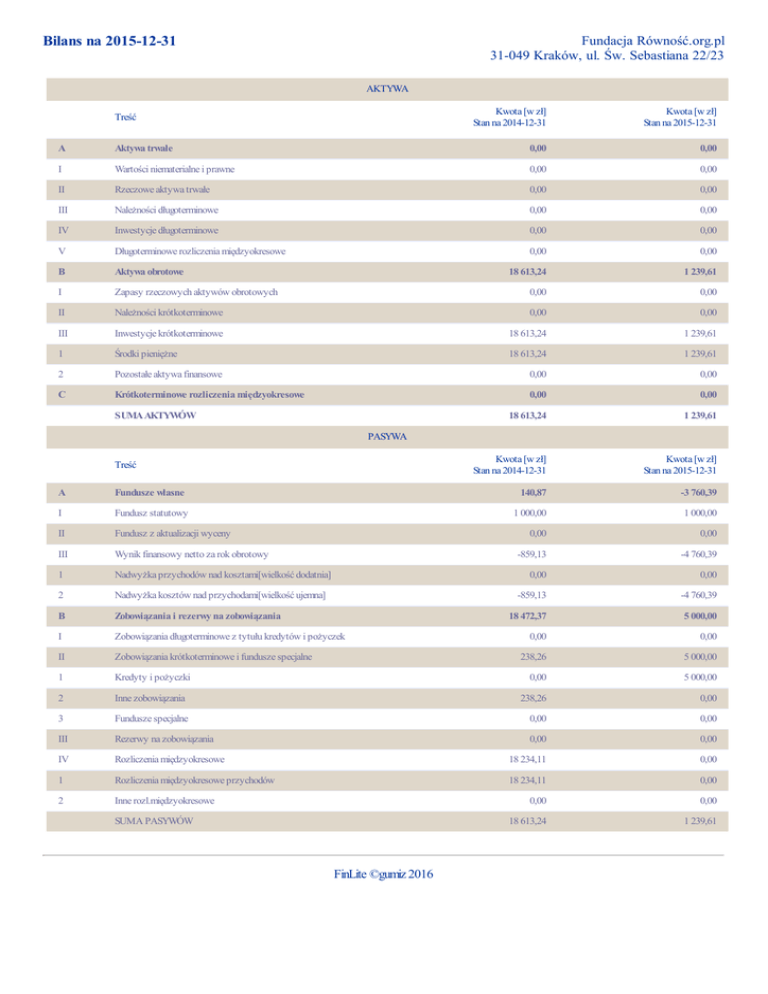 Fundacja Równość.org.pl 31-049 Kraków, ul. Św. Sebastiana 22/23 Bilans na 2015-12-31 AKTYWA Treść Kwota [w zł] Stan na 2014-12-31 Kwota [w zł] Stan na 2015-12-31 A Aktywa trwałe 0,00 0,00 I Wartości niematerialne i prawne 0,00 0,00 II Rzeczowe aktywa trwałe 0,00 0,00 III Należności długoterminowe 0,00 0,00 IV Inwestycje długoterminowe 0,00 0,00 V Długoterminowe rozliczenia międzyokresowe 0,00 0,00 B Aktywa obrotowe 18 613,24 1 239,61 I Zapasy rzeczowych aktywów obrotowych 0,00 0,00 II Należności krótkoterminowe 0,00 0,00 III Inwestycje krótkoterminowe 18 613,24 1 239,61 1 Środki pieniężne 18 613,24 1 239,61 2 Pozostałe aktywa finansowe 0,00 0,00 C Krótkoterminowe rozliczenia międzyokresowe 0,00 0,00 18 613,24 1 239,61 Kwota [w zł] Stan na 2014-12-31 Kwota [w zł] Stan na 2015-12-31 SUMA AKTYWÓW PASYWA Treść A Fundusze własne 140,87 -3 760,39 I Fundusz statutowy 1 000,00 1 000,00 II Fundusz z aktualizacji wyceny 0,00 0,00 III Wynik finansowy netto za rok obrotowy -859,13 -4 760,39 1 Nadwyżka przychodów nad kosztami[wielkość dodatnia] 0,00 0,00 2 Nadwyżka kosztów nad przychodami[wielkość ujemna] -859,13 -4 760,39 B Zobowiązania i rezerwy na zobowiązania 18 472,37 5 000,00 I Zobowiązania długoterminowe z tytułu kredytów i pożyczek 0,00 0,00 II Zobowiązania krótkoterminowe i fundusze specjalne 238,26 5 000,00 1 Kredyty i pożyczki 0,00 5 000,00 2 Inne zobowiązania 238,26 0,00 3 Fundusze specjalne 0,00 0,00 III Rezerwy na zobowiązania 0,00 0,00 IV Rozliczenia międzyokresowe 18 234,11 0,00 1 Rozliczenia międzyokresowe przychodów 18 234,11 0,00 2 Inne rozl.międzyokresowe 0,00 0,00 18 613,24 1 239,61 SUMA PASYWÓW FinLite ©gumiz 2016
