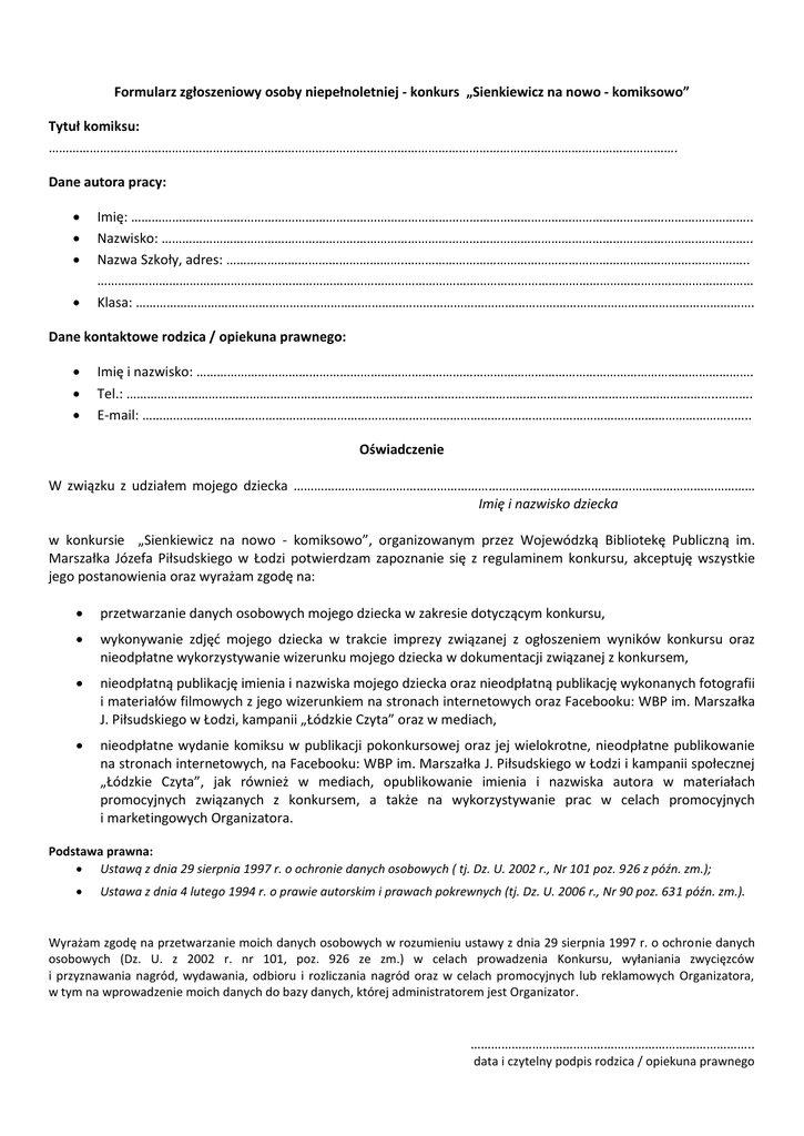 Formularz zgłoszeniowy osoby niepełnoletniej - konkurs „Sienkiewicz na nowo - komiksowo” Tytuł komiksu: …………………………………………………………………………………………………………………………………………………………………. Dane autora pracy:     Imię: ……………………………………………………………………………………………………………………………………………………………….. Nazwisko: ……………………………………………………………………………………………………………………………………………………….. Nazwa Szkoły, adres: …………………………………………….……………………………………………………………………………………….. ………………………………………………………………………………………………………………………………………………………………………… Klasa: ………………………………………………………………………………………………………………………………………………………………. Dane kontaktowe rodzica / opiekuna prawnego:    Imię i nazwisko: ………………………………………………………………………………………………………………………………………………. Tel.: ………………………………………………………………………………………………………………………………………………………..………. E-mail: ………………………………………………………………………………………………………………………………………………………..….. Oświadczenie W związku z udziałem mojego dziecka ……………………………………………………………………………………………………………………… Imię i nazwisko dziecka w konkursie „Sienkiewicz na nowo - komiksowo”, organizowanym przez Wojewódzką Bibliotekę Publiczną im. Marszałka Józefa Piłsudskiego w Łodzi potwierdzam zapoznanie się z regulaminem konkursu, akceptuję wszystkie jego postanowienia oraz wyrażam zgodę na:  przetwarzanie danych osobowych mojego dziecka w zakresie dotyczącym konkursu,  wykonywanie zdjęć mojego dziecka w trakcie imprezy związanej z ogłoszeniem wyników konkursu oraz nieodpłatne wykorzystywanie wizerunku mojego dziecka w dokumentacji związanej z konkursem,  nieodpłatną publikację imienia i nazwiska mojego dziecka oraz nieodpłatną publikację wykonanych fotografii i materiałów filmowych z jego wizerunkiem na stronach internetowych oraz Facebooku: WBP im. Marszałka J. Piłsudskiego w Łodzi, kampanii „Łódzkie Czyta” oraz w mediach,  nieodpłatne wydanie komiksu w publikacji pokonkursowej oraz jej wielokrotne, nieodpłatne publikowanie na stronach internetowych, na Facebooku: WBP im. Marszałka J. Piłsudskiego w Łodzi i kampanii społecznej „Łódzkie Czyta”, jak również w mediach, opublikowanie imienia i nazwiska autora w materiałach promocyjnych związanych z konkursem, a także na wykorzystywanie prac w celach promocyjnych i marketingowych Organizatora. Podstawa prawna:  Ustawą z dnia 29 sierpnia 1997 r. o ochronie danych osobowych ( tj. Dz. U. 2002 r., Nr 101 poz. 926 z późn. zm.);  Ustawa z dnia 4 lutego 1994 r. o prawie autorskim i prawach pokrewnych (tj. Dz. U. 2006 r., Nr 90 poz. 631 późn. zm.). Wyrażam zgodę na przetwarzanie moich danych osobowych w rozumieniu ustawy z dnia 29 sierpnia 1997 r. o ochronie danych osobowych (Dz. U. z 2002 r. nr 101, poz. 926 ze zm.) w celach prowadzenia Konkursu, wyłaniania zwycięzców i przyznawania nagród, wydawania, odbioru i rozliczania nagród oraz w celach promocyjnych lub reklamowych Organizatora, w tym na wprowadzenie moich danych do bazy danych, której administratorem jest Organizator. ……………………………………………………………………….. data i czytelny podpis rodzica / opiekuna prawnego