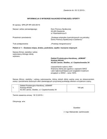 Zawiercie dn. 03.12.2015 r. INFORMACJA O WYBORZE NAJKORZYSTNIEJSZEJ OFERTY Nr sprawy DPS.ZP.RP-230-20/15 Nazwa i adres zamawiającego: Dom Pomocy Społecznej 42-400 Zawiercie ul. Rzemieślnicza 9 Przedmiot zamówienia: „Dostawa artykułów żywnościowych na potrzeby Domu Pomocy Społecznej w Zawierciu” Tryb postępowania: „Przetarg nieograniczony” Pakiet nr 1 – Dostawa mięsa, drobiu, podrobów, wędlin i konserw mięsnych Nazwa (firma), siedziba i adres wykonawcy którego ofertę wybrano: Zakład Produkcyjno-Handlowy „ADMAR” Andrzej Wiński 42-253 Janów, Siedlec, ul. Częstochowska 34 Uzasadnienie wyboru ofert: Wybrana oferta jest zgodna z zapisami SIWZ i jest najkorzystniejsza pod względem kryterium przyjętym w SIWZ – cena 100% Nazwa (firmy), siedziby i adresy wykonawców, którzy złożyli oferty ważne wraz ze streszczeniem oceny i porównania złożonych ofert zawierających przyznaną punktację ofertom w kryterium oceny. 1. Zakład Produkcyjno-Handlowy „ADMAR” Andrzej Wiński 42-253 Janów, Siedlec, ul. Częstochowska 34 100 pkt. Termin zawarcia umowy 18.12.2015 r. Otrzymują w/w. Dyrektor /-/ mgr Aleksander Jachimowski Zawiercie dn. 03.12.2015 r. INFORMACJA O WYBORZE NAJKORZYSTNIEJSZEJ OFERTY Nr sprawy DPS.ZP.RP-230-20/15 Nazwa i adres zamawiającego: Dom Pomocy Społecznej 42-400 Zawiercie ul. Rzemieślnicza 9 Przedmiot zamówienia: „Dostawa artykułów żywnościowych na potrzeby Domu Pomocy Społecznej w Zawierciu” Tryb postępowania: „Przetarg nieograniczony” Pakiet nr 2 – Dostawa mleka i wyrobów mleczarskich Nazwa (firma), siedziba i adres wykonawcy którego ofertę wybrano: Spółdzielnia Mleczarska „Mlekovita” 18-200 Wysokie Mazowieckie ul. Ludowa 122 Magazyn nr 21 z Pilicy 42-436 Pilica ul. Mickiewicza 6 Uzasadnienie wyboru ofert: Wybrana oferta jest zgodna z zapisami SIWZ i jest najkorzystniejsza pod względem kryterium przyjętym w SIWZ – cena 100% Nazwa (firmy), siedziby i adresy wykonawców, którzy złożyli oferty ważne wraz ze streszczeniem oceny i porównania złożonych ofert zawierających przyznaną punktację ofertom w kryterium oceny. 1. 2. Spółdzielnia Mleczarska „Mlekovita” 18-200 Wysokie Mazowieckie ul. Ludowa 122 Magazyn nr 21 z Pilicy 42-436 Pilica ul. Mickiewicza 6 Hurtownia Art. Spożywczych „MIŚ” Barbara Florjańska 42-400 Zawiercie, ul. Grunwaldzka 15 100 pkt. 95 pkt Termin zawarcia umowy 18.12.2015 r. Otrzymują w/w. Dyrektor /-/ mgr Aleksander Jachimowski Zawiercie dn. 03.12.2015 r. INFORMACJA O WYBORZE NAJKORZYSTNIEJSZEJ OFERTY Nr sprawy DPS.ZP.RP-230-20/15 Nazwa i adres zamawiającego: Dom Pomocy Społecznej 42-400 Zawiercie ul. Rzemieślnicza 9 Przedmiot zamówienia: „Dostawa artykułów żywnościowych na potrzeby Domu Pomocy Społecznej w Zawierciu” Tryb postępowania: „Przetarg nieograniczony” Pakiet nr 3 – Dostawa pieczywa i wyrobów ciastkarskich Nazwa (firma), siedziba i adres wykonawcy którego ofertę wybrano: Piekarnia Mechaniczna Marcin Wąs 32-300 Olkusz, Osiek 180 Uzasadnienie wyboru ofert: Wybrana oferta jest zgodna z zapisami SIWZ i jest najkorzystniejsza pod względem kryterium przyjętym w SIWZ – cena 100% Nazwa (firmy), siedziby i adresy wykonawców, którzy złożyli oferty ważne wraz ze streszczeniem oceny i porównania złożonych ofert zawierających przyznaną punktację ofertom w kryterium oceny. 1. 2. 3. Piekarnia Mechaniczna Marcin Wąs 32-300 Olkusz, Osiek 180 Piekarnia Domowa Masarnia „Severiana” Sp. z o.o. 42-470 Siewierz, ul. Rynek 6 Piekarnia Lipianin G.W. Lipianin 49-351 Przylesie 32 100 pkt. 98,85 pkt 71,69 pkt. Termin zawarcia umowy 18.12.2015 r. Otrzymują w/w. Dyrektor /-/ mgr Aleksander Jachimowski Zawiercie dn. 03.12.2015 r. INFORMACJA O WYBORZE NAJKORZYSTNIEJSZEJ OFERTY Nr sprawy DPS.ZP.RP-230-20/15 Nazwa i adres zamawiającego: Dom Pomocy Społecznej 42-400 Zawiercie ul. Rzemieślnicza 9 Przedmiot zamówienia: „Dostawa artykułów żywnościowych na potrzeby Domu Pomocy Społecznej w Zawierciu” Tryb postępowania: „Przetarg nieograniczony” Pakiet nr 4 – Dostawa ryb i konserw rybnych Nazwa (firma), siedziba i adres wykonawcy którego ofertę wybrano: Hurtownia Art. Spożywczych „MIŚ” Barbara Florjańska 42-400 Zawiercie, ul. Grunwaldzka 15 Uzasadnienie wyboru ofert: Wybrana oferta jest zgodna z zapisami SIWZ i jest najkorzystniejsza pod względem kryterium przyjętym w SIWZ – cena 100% Nazwa (firmy), siedziby i adresy wykonawców, którzy złożyli oferty ważne wraz ze streszczeniem oceny i porównania złożonych ofert zawierających przyznaną punktację ofertom w kryterium oceny. 1. Hurtownia Art. Spożywczych „MIŚ” Barbara Florjańska 42-400 Zawiercie, ul. Grunwaldzka 15 2. Firma Handlowa „Anna” Sieracka, Cygan i Wspólnicy Sp. j. 42-200 Częstochowa, ul. Złota 120 100 pkt 99,52 pkt Termin zawarcia umowy 18.12.2015 r. Otrzymują w/w. Dyrektor /-/ mgr Aleksander Jachimowski Zawiercie dn. 03.12.2015 r. INFORMACJA O WYBORZE NAJKORZYSTNIEJSZEJ OFERTY Nr sprawy DPS.ZP.RP-230-20/15 Nazwa i adres zamawiającego: Dom Pomocy Społecznej 42-400 Zawiercie ul. Rzemieślnicza 9 Przedmiot zamówienia: „Dostawa artykułów żywnościowych na potrzeby Domu Pomocy Społecznej w Zawierciu” Tryb postępowania: „Przetarg nieograniczony” Pakiet nr 5 – Dostawa jaj Nazwa (firma), siedziba i adres wykonawcy którego ofertę wybrano: Hurtownia Art. Spożywczych „MIŚ” Barbara Florjańska 42-400 Zawiercie, ul. Grunwaldzka 15 Uzasadnienie wyboru ofert: Wybrana oferta jest zgodna z zapisami SIWZ i jest najkorzystniejsza pod względem kryterium przyjętym w SIWZ – cena 100% Nazwa (firmy), siedziby i adresy wykonawców, którzy złożyli oferty ważne wraz ze streszczeniem oceny i porównania złożonych ofert zawierających przyznaną punktację ofertom w kryterium oceny. 1. Hurtownia Art. Spożywczych „MIŚ” Barbara Florjańska 42-400 Zawiercie, ul. Grunwaldzka 15 100 pkt. Termin zawarcia umowy 18.12.2015 r. Otrzymu