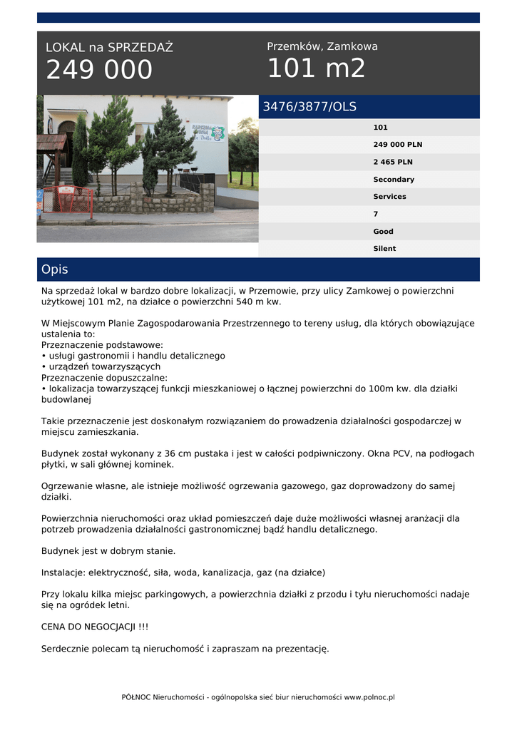 LOKAL na SPRZEDAŻ 249 000 Przemków, Zamkowa 101 m2 3476/3877/OLS 101 249 000 PLN 2 465 PLN Secondary Services 7 Good Silent Opis Na sprzedaż lokal w bardzo dobre lokalizacji, w Przemowie, przy ulicy Zamkowej o powierzchni użytkowej 101 m2, na działce o powierzchni 540 m kw. W Miejscowym Planie Zagospodarowania Przestrzennego to tereny usług, dla których obowiązujące ustalenia to: Przeznaczenie podstawowe: • usługi gastronomii i handlu detalicznego • urządzeń towarzyszących Przeznaczenie dopuszczalne: • lokalizacja towarzyszącej funkcji mieszkaniowej o łącznej powierzchni do 100m kw. dla działki budowlanej Takie przeznaczenie jest doskonałym rozwiązaniem do prowadzenia działalności gospodarczej w miejscu zamieszkania. Budynek został wykonany z 36 cm pustaka i jest w całości podpiwniczony. Okna PCV, na podłogach płytki, w sali głównej kominek. Ogrzewanie własne, ale istnieje możliwość ogrzewania gazowego, gaz doprowadzony do samej działki. Powierzchnia nieruchomości oraz układ pomieszczeń daje duże możliwości własnej aranżacji dla potrzeb prowadzenia działalności gastronomicznej bądź handlu detalicznego. Budynek jest w dobrym stanie. Instalacje: elektryczność, siła, woda, kanalizacja, gaz (na działce) Przy lokalu kilka miejsc parkingowych, a powierzchnia działki z przodu i tyłu nieruchomości nadaje się na ogródek letni. CENA DO NEGOCJACJI !!! Serdecznie polecam tą nieruchomość i zapraszam na prezentację. PÓŁNOC Nieruchomości - ogólnopolska sieć biur nieruchomości www.polnoc.pl Oferujemy kompleksową obsługę klienta - wszystko w jednym miejscu, począwszy od zidentyfikowania potrzeb, poprzez doradztwo, wybór oferty, finalizację zakupu a skończywszy na finansowaniu kredytem. DORADCY FINANSOWI Północ Nieruchomości – Głogów, wyspecjalizowani w kredytach hipotecznych, pomogą bezpłatnie w załatwieniu wszystkich formalności, niezbędnych do uzyskania kredytu. Kontakt: Horoszko Rafał PÓŁNOC Nieruchomości Głogów tel: 797 333 595 e-mail: [email protected] Nr licencji: 21235 Więcej ofert na www.polnoc.pl Więcej ofert znajdziesz na naszej stronie www.polnoc.pl * UWAGA! Zamieszczone na naszych stronach oferty nie stanowią oferty w rozumieniu Kodeksu Cywilnego, a dane w nich zawarte mają jedynie charakter informacyjny. Rafał Horoszko tel. 797-333-595 email: [email protected] PÓŁNOC Nieruchomości - ogólnopolska sieć biur nieruchomości www.polnoc.pl Powered by TCPDF (www.tcpdf.org)
