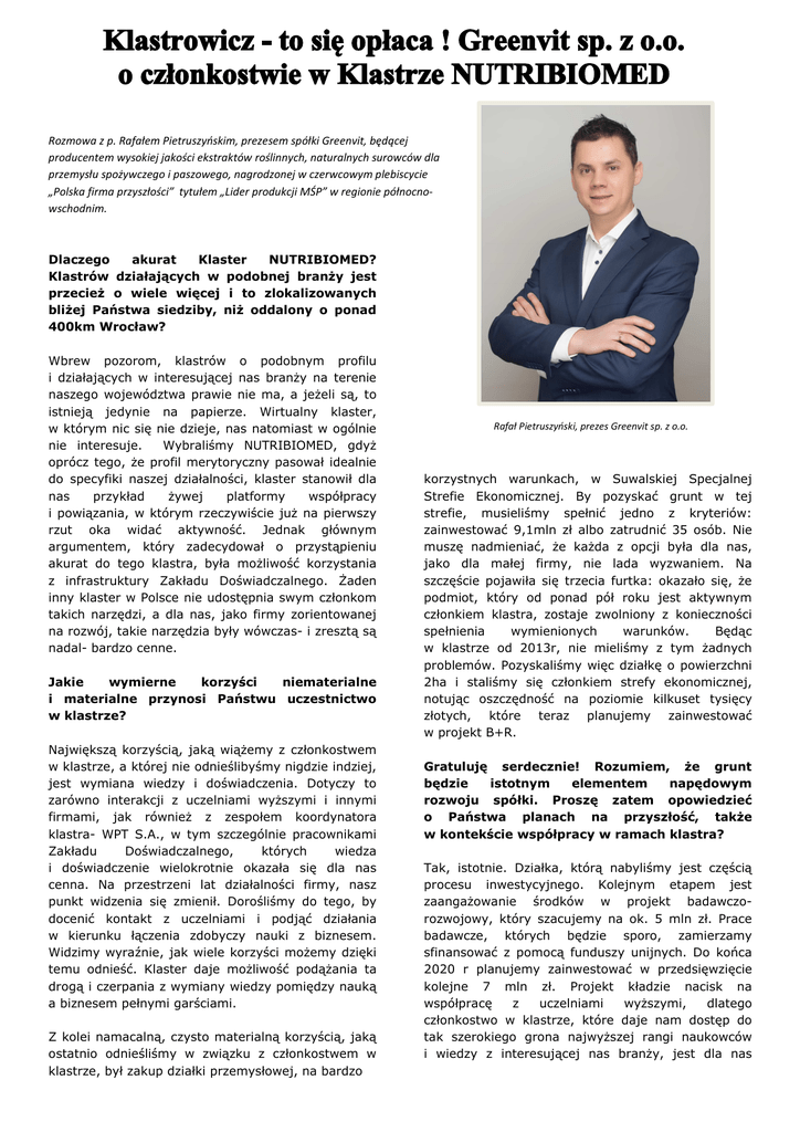 Rozmowa z p. Rafałem Pietruszyńskim, prezesem spółki Greenvit, będącej producentem wysokiej jakości ekstraktów roślinnych, naturalnych surowców dla przemysłu spożywczego i paszowego, nagrodzonej w czerwcowym plebiscycie „Polska firma przyszłości” tytułem „Lider produkcji MŚP” w regionie północnowschodnim. Dlaczego akurat Klaster NUTRIBIOMED? Klastrów działających w podobnej branży jest przecież o wiele więcej i to zlokalizowanych bliżej Państwa siedziby, niż oddalony o ponad 400km Wrocław? Wbrew pozorom, klastrów o podobnym profilu i działających w interesującej nas branży na terenie naszego województwa prawie nie ma, a jeżeli są, to istnieją jedynie na papierze. Wirtualny klaster, w którym nic się nie dzieje, nas natomiast w ogólnie nie interesuje. Wybraliśmy NUTRIBIOMED, gdyż oprócz tego, że profil merytoryczny pasował idealnie do specyfiki naszej działalności, klaster stanowił dla nas przykład żywej platformy współpracy i powiązania, w którym rzeczywiście już na pierwszy rzut oka widać aktywność. Jednak głównym argumentem, który zadecydował o przystąpieniu akurat do tego klastra, była możliwość korzystania z infrastruktury Zakładu Doświadczalnego. Żaden inny klaster w Polsce nie udostępnia swym członkom takich narzędzi, a dla nas, jako firmy zorientowanej na rozwój, takie narzędzia były wówczas- i zresztą są nadal- bardzo cenne. Jakie wymierne korzyści niematerialne i materialne przynosi Państwu uczestnictwo w klastrze? Największą korzyścią, jaką wiążemy z członkostwem w klastrze, a której nie odnieślibyśmy nigdzie indziej, jest wymiana wiedzy i doświadczenia. Dotyczy to zarówno interakcji z uczelniami wyższymi i innymi firmami, jak również z zespołem koordynatora klastra- WPT S.A., w tym szczególnie pracownikami Zakładu Doświadczalnego, których wiedza i doświadczenie wielokrotnie okazała się dla nas cenna. Na przestrzeni lat działalności firmy, nasz punkt widzenia się zmienił. Dorośliśmy do tego, by docenić kontakt z uczelniami i podjąć działania w kierunku łączenia zdobyczy nauki z biznesem. Widzimy wyraźnie, jak wiele korzyści możemy dzięki temu odnieść. Klaster daje możliwość podążania ta drogą i czerpania z wymiany wiedzy pomiędzy nauką a biznesem pełnymi garściami. Z kolei namacalną, czysto materialną korzyścią, jaką ostatnio odnieśliśmy w związku z członkostwem w klastrze, był zakup działki przemysłowej, na bardzo Rafał Pietruszyński, prezes Greenvit sp. z o.o. korzystnych warunkach, w Suwalskiej Specjalnej Strefie Ekonomicznej. By pozyskać grunt w tej strefie, musieliśmy spełnić jedno z kryteriów: zainwestować 9,1mln zł albo zatrudnić 35 osób. Nie muszę nadmieniać, że każda z opcji była dla nas, jako dla małej firmy, nie lada wyzwaniem. Na szczęście pojawiła się trzecia furtka: okazało się, że podmiot, który od ponad pół roku jest aktywnym członkiem klastra, zostaje zwolniony z konieczności spełnienia wymienionych warunków. Będąc w klastrze od 2013r, nie mieliśmy z tym żadnych problemów. Pozyskaliśmy więc działkę o powierzchni 2ha i staliśmy się członkiem strefy ekonomicznej, notując oszczędność na poziomie kilkuset tysięcy złotych, które teraz planujemy zainwestować w projekt B+R. Gratuluję serdecznie! Rozumiem, że grunt będzie istotnym elementem napędowym rozwoju spółki. Proszę zatem opowiedzieć o Państwa planach na przyszłość, także w kontekście współpracy w ramach klastra? Tak, istotnie. Działka, którą nabyliśmy jest częścią procesu inwestycyjnego. Kolejnym etapem jest zaangażowanie środków w projekt badawczorozwojowy, który szacujemy na ok. 5 mln zł. Prace badawcze, których będzie sporo, zamierzamy sfinansować z pomocą funduszy unijnych. Do końca 2020 r planujemy zainwestować w przedsięwzięcie kolejne 7 mln zł. Projekt kładzie nacisk na współpracę z uczelniami wyższymi, dlatego członkostwo w klastrze, które daje nam dostęp do tak szerokiego grona najwyższej rangi naukowców i wiedzy z interesującej nas branży, jest dla nas nieocenione. Mamy nadzieję wzmocnić posiadane już kontakty i rozwinąć współpracę. Planujemy także rozwijać działalność usługową związaną z prowadzeniem określonych technologii na zlecenie klientów. Tutaj, szczególnie na etapach początkowych, przydaje nam się możliwość korzystania z Zakładu Doświadczalnego, gdzie testujemy nasze rozwiązania w skali ćwierćtechnicznej zanim zwiększymy ich skalę na przemysłową. Kolejną gałęzią działalności, którą chcemy rozwinąć, jest eksport. Wiążemy nadzieję z dofinansowaniem w ramach Programu Operacyjnego Polska Wschodnia. Także klaster może nam pomóc w ekspansji na rynki międzynarodowe. Partnerzy biznesowi za granicą bardzo korzystnie postrzegają członkostwo w tego typu platformach współpracy, co znacznie ułatwia nawiązanie kontaktów. je pozyskać, cenna jest umiejętna selekcja, na którą sami nie mamy czasu. Działania prowadzone przez koordynatora są tutaj bardzo przydatne. Podobnie wszelkie pomysły wspólnej promocji, udział w targach, wyjazdy na misje zagraniczne i wszelkiego rodzaju networking międzynarodowy postrzegam jako bardzo trafione. Uważam także, że Rada Klastra jest ciekawym wydarzeniem, choć przyznam, że na początku przygody z klastrem nie doceniałem w pełni tych spotkań. Z czasem zdałem sobie sprawę, jak ważny i cenny jest czas poświęcony na networking. Prawdą jest, że bardzo często najlepsze pomysły rodzą się przy kawie. Rozmowy z członkami klastra, w trochę odmiennej atmosferze od typowych interesów biznesowych załatwianych przy stole, dają niesamowitą okazję do wymiany doświadczeń: w krótkim czasie, w jednym miejscu, z wieloma ludźmi o różnych pomysłach. I to z częstotliwością raz na kwartał. Niezaprzeczalnie, ta możliwość to jedna z największych k