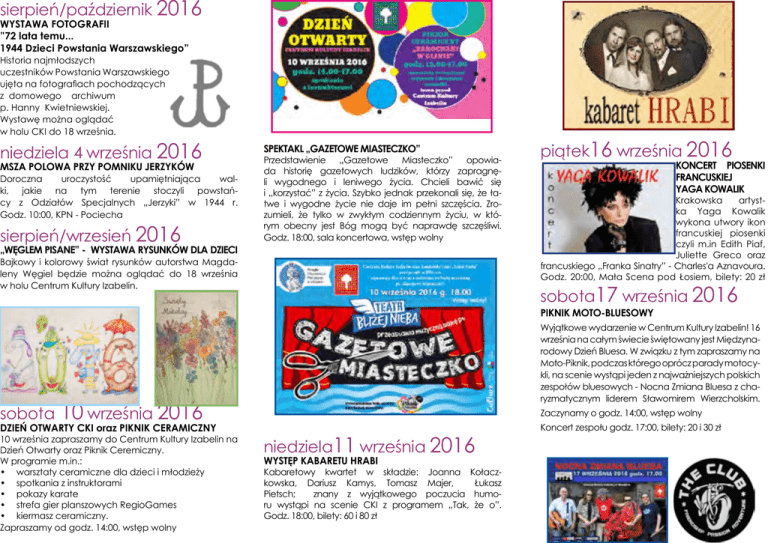 sierpień/październik 2016 WYSTAWA FOTOGRAFII ”72 lata temu... 1944 Dzieci Powstania Warszawskiego” Historia najmłodszych uczestników Powstania Warszawskiego ujęta na fotografiach pochodzących z domowego archiwum p. Hanny Kwietniewskiej. Wystawę można oglądać w holu CKI do 18 września. niedziela 4 września 2016 MSZA POLOWA PRZY POMNIKU JERZYKÓW Doroczna uroczystość upamiętniająca walki, jakie na tym terenie stoczyli powstańcy z Odziałów Specjalnych „Jerzyki” w 1944 r. Godz. 10:00, KPN - Pociecha sierpień/wrzesień 2016 „WĘGLEM PISANE” - WYSTAWA RYSUNKÓW DLA DZIECI SPEKTAKL „GAZETOWE MIASTECZKO” Przedstawienie „Gazetowe Miasteczko” opowiada historię gazetowych ludzików, którzy zapragnęli wygodnego i leniwego życia. Chcieli bawić się i „korzystać” z życia. Szybko jednak przekonali się, że łatwe i wygodne życie nie daje im pełni szczęścia. Zrozumieli, że tylko w zwykłym codziennym życiu, w którym obecny jest Bóg mogą być naprawdę szczęśliwi. Godz. 18:00, sala koncertowa, wstęp wolny Bajkowy i kolorowy świat rysunków autorstwa Magdaleny Węgiel będzie można oglądać do 18 września w holu Centrum Kultury Izabelin. sobota piątek16 września 2016 KONCERT PIOSENKI FRANCUSKIEJ YAGA KOWALIK Krakowska artystka Yaga Kowalik wykona utwory ikon francuskiej piosenki czyli m.in Edith Piaf, Juliette Greco oraz francuskiego „Franka Sinatry” - Charles'a Aznavoura. Godz. 20:00, Mała Scena pod Łosiem, bilety: 20 zł sobota17 września 2016 PIKNIK MOTO-BLUESOWY Wyjątkowe wydarzenie w Centrum Kultury Izabelin! 16 września na całym świecie świętowany jest Międzynarodowy Dzień Bluesa. W związku z tym zapraszamy na Moto-Piknik, podczas którego oprócz parady motocykli, na scenie wystąpi jeden z najważniejszych polskich zespołów bluesowych - Nocna Zmiana Bluesa z charyzmatycznym liderem Sławomirem Wierzcholskim. 10 września 2016 DZIEŃ OTWARTY CKI oraz PIKNIK CERAMICZNY 10 września zapraszamy do Centrum Kultury Izabelin na Dzień Otwarty oraz Piknik Ceremiczny. W programie m.in.: • warsztaty ceramiczne dla dzieci i młodzieży • spotkania z instruktorami • pokazy karate • strefa gier planszowych RegioGames • kiermasz ceramiczny. Zapraszamy od godz. 14:00, wstęp wolny Zaczynamy o godz. 14:00, wstęp wolny niedziela11 września 2016 WYSTĘP KABARETU HRABI Kabaretowy kwartet w składzie: Joanna Kołaczkowska, Dariusz Kamys, Tomasz Majer, Łukasz Pietsch; znany z wyjątkowego poczucia humoru wystąpi na scenie CKI z programem „Tak, że o”. Godz. 18:00, bilety: 60 i 80 zł Koncert zespołu godz. 17:00, bilety: 20 i 30 zł sobota 24 września 2016 WIECZÓR KULTURY BIAŁORUSKIEJ Zapraszamy w podróż za naszą wschodnią granicę do Białorusi. W programie: • koncert muzyki ludowej w wykonaniu zespołu Biała Ptak • wystawa fotograficzna; „Grodno - Nowogródek - Mir - Nieśwież” Reżyserem przedstawienia jest Laura Łącz. Godz. 17:00, sala koncertowa CKI, bilety: 20 zł KALENDARZ IMPREZ WRZESIEŃ 2016 Godz. 17:00, sala koncertowa CKI, wstęp wolny sobota 24 września 2016 PIKNIK SPORTOWY NA ZAKOŃCZENIE LATA W ostatnią sobotę września na boisku Orlik w Laskach odbędzie się piknik sportowy dla dzieci. Uczestnicy będą mogli sprawdzić się w wielu ciekawych konkurencjach sportowych czy wziąć udział w konkursach i zabawach. Zapraszamy od godz. 14:00, boisko Orlik w Laskach, wstęp wolny niedziela 25 września 2016 SPEKTAKL TEATRU KARTA pt. „DAMY I HUZARY” W REŻYSERII LAURY ŁĄCZ Akcja przedstawienia toczy się w wiejskiej posiadłości majora, u którego goszczą pułkowi koledzy: rotmistrz, porucznik pułku huzarów Edmund oraz kapelan. Wolny czas panowie spędzają na polowaniu i grze w szachy. Panom oficerom usługuje stary wiarus Grzegorz. Jednak kawalerską sielankę przerywa nagle najazd sióstr majora, które wraz ze świtą młodych panien postanawiają odwiedzić brata. Oficerski honor nakazuje godnie damy przyjąć, ale podjęte próby, szczególnie wystrzelenie z moździerza, dają zupełnie odmienny rezultat. Centrum Kultury Izabelin ul. Matejki 21 05-080 Izabelin 022 752 68 28 [email protected] www.centrum.izabelin.pl