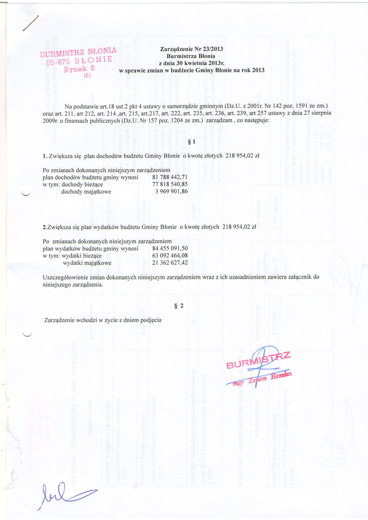 BI'ONIA DURMISTRZ "oido Zarz4dzenieNr 2312013 BurmistrzaBlonia z dnia 30 kwietnia 2013r. w sprawiezmianw budiecieGminy Bloniena rok 2013 BI-qNIE Rynex o to, gminnym(Dz.U. z200ll Nr 142poz. l59l ze zm) Na podstawieart.l8 ust.2pkt 4 ustawyo samorz4dzie urt.235,art.236,afi.239,art257ustawyz dnia27sierpnia orazart.2ll, art2l2, arl''.2l4,axt.2l5,art.2l7,au.t.222, 2009r.o finansachpublicznych(Dz.U.Nr 157poz.1204ze zm.) zarzqdzatn,co nastgpuje: sl l. Zwigksza sig plan dochod6w bud2etu Gminy Blonie o kwotg zlotych 218 954,02 zL Po zmianach dokonanych niniej szym zarz1dzeniem plan dochod6w budZetugminy wynosi 81 788 442,71 77 818540,85 w tym: dochody bieh1ce 3 969901.86 dochody maj4tkowe 2.Zwigksza sig plan wydatk6w bud'ZetuGminy Blonie o kwotg zlotych 218 954,02 zl Po zrnianach dokonanych niniej szym zarzqdzeniem plan wydatk6w budZetugminy wynosi 84 455 091,50 63 092 464,08 w tym: wydatki bieZ4ce 2t 362627,42 wydatki maj4tkowe zawierazal1cmk do z ich uzasadnieniem Uszczeg6lowienie zmiandokonanychniniejszymzarzqdzeniemwraz zarz4dzenia. niniejszego $ 2 Zarzqdzenie wchodzi w irycie z dniem podjgcia