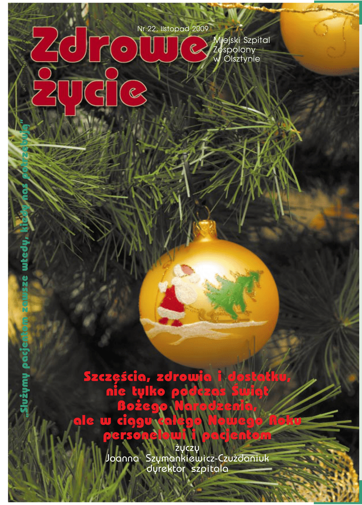 Nr 22, listopad 2009 „S³u¿ymy pacjentom zawsze wtedy, kiedy nas potrzebuj¹” ISSN 1731-9749 Miejski Szpital Zespolony w Olsztynie Szczêœcia, zdrowia i dostatku, nie tylko podczas Œwi¹t Bo¿ego Narodzenia, ale w ci¹gu ca³ego Nowego Roku personelowi i pacjentom ¿yczy Joanna Szymankiewicz-Czu¿daniuk dyrektor szpitala 1 Zdrowe ¿ycie POTWIERDZONA JAKOŒÆ Zdrowe ¿ycie 2 POTWIERDZONA JAKOŒÆ Z³ota Statuetka „Per³a Eskulapa” Miejski szpital Zespolony w Olsztynie ju¿ po raz drugi zdoby³ 1. miejsce i otrzyma³ z³ot¹ statuetkê Per³y Eskulapa w Ogólnopolskim Konkursie Medycznym Per³y Medycyn. Nagrodê odebra³a Pani dyrektor Joanna Szymankiewicz-Czuzdaniuk. 14 listopada 2009 roku rozstrzygniêta zosta³a III Edycja Ogólnopolskiego Konkursu Medycznego PER£Y MEDYCYNY. Ju¿ po raz trzeci Kapitu³a Konkursu nagrodzi³a najlepsze zak³ady opieki zdrowotnej i firmy dzia³aj¹ce na rynku medycznym. Uroczyste og³oszenie wyników odby³o siê ju¿ tradycyjnie w Hotelu Gromada w Warszawie, podczas Wielkiej Gali. W konkursowe szranki stanê³o ponad 60 Uczestników. Rywalizacja by³a bardzo zaciêta, bowiem wszyscy nominowani reprezentowali bardzo wysoki poziom. Zgodnie z celem konkursu – nagrodzeni zostali ci, którzy zakresem swojej dzia³alnoœci oraz przy udziale kompetentnego personelu wp³ywaj¹ na poziom oferowanych produktów i us³ug – ich dostêpnoœæ i jakoœæ, maj¹c przy tym na uwadze bezpieczeñstwo pacjentów oraz klientów. Wielka Gala, w której uczestniczy³o ponad 800 osób, by³a przedsiêwziêciem niezwykle uroczystym. Oprócz przedstawicieli tegorocznych Laureatów, swoj¹ obecnoœci¹ zaszczy- cili nas ludzie œwiata polityki, biznesu i oczywiœcie bran¿y medycznej. Czêœæ oficjaln¹ poprowadzili Joanna Koroniewska i Maciej Dowbor. Zwyciêzcom wrêczono z³ote, srebrne i br¹zowe statuetki w poszczególnych kategoriach, a tak¿e dyplomy dla wyró¿nionych uczestników. Patronat: Pan Konstanty Radziwi³³ - Prezes Naczelnej Rady Lekarskiej, Polskie Towarzystwo Lekarskie, Polskie Towarzystwo Farmaceutyczne, Polskie Towarzystwo Stomatologiczne, Zwi¹zek Pracodawców Ratownictwa Medycznego SP ZOZ, Ogólnopolskie Stowarzyszenie Niepublicznych Szpitali Samorz¹dowych, Ogólnopolska Izba Gospodarcza Wyrobów Medycznych POLMED Patronat i wspó³praca: Polski Zwi¹zek Producentów Leków Bez Recepty PASMI, Polska Agencja Informacji i Inwestycji Zagranicznych S.A., Polska Agencja Rozwoju Przedsiêbiorczoœci Organizatorzy: Mazowieckie Zrzeszenie Handlu Przemys³u i Us³ug, Europa 2000 Consulting Sp. z o.o. Fot. Archiwum Szpitala 3 Zdrowe ¿ycie Szpital przyjazny pacjentowi US£UGI Fot. Jacek Kowalski US£UGI W ODDZIA£ACH SZPITALA PRZY UL. NIEPODLEG£OŒCI 44: Oddzia³ ginekologiczny — tel. 089/532-62-09 Oddzia³ po³o¿niczy — tel. 089/532-62-08 Oddzia³ noworodków i wczeœniaków z pododdzia³em intensywnego nadzoru — tel. 089/532-62-40 Ordynator — lek. med. Gra¿yna Siwiec-Saternus Oddzia³ urologii — tel. 089/532-63-74 Ordynator — lek. med. Marek ¯abiñski Izba Przyjêæ Ogólna — tel. 089/527-50-11 Izba Przyjêæ Ginekologiczno-Po³o¿nicza — tel. 089/532-62-77 Oddzia³ wewnêtrzny I — tel. 089/532-62-33 Ordynator — lek. med. El¿bieta Domos³awska Oddzia³ kardiologiczno-internistyczny z pododdzia³em intensywnej opieki kardiologicznej i szybkiej diagnostyki — tel. 089/532-62-01 Ordynator — dr n. med. Ryszard Targoñski Oddzia³ anestezjologii i intens. terapii — tel. 089/532-63-59 Ordynator — lek. med. Janusz Stêpieñ Oddzia³ chirurgii klatki piersiowej — tel. 089/532-63-66 Ordynator — dr n. med. Aleksander Stankiewicz Oddzia³ chirurgii ogólnej — tel. 089/532-62-17 Ordynator — dr n. med. Tomasz Szewczyk Oddzia³ chirurgii urazowo-ortopedycznej — tel. 089/532-62-14 Ordynator — dr n. med. Krzysztof Bladowski Oddzia³ chirurgii szczêkowej — tel. 089/532-62-48 Ordynator — lek. med. Leszek Dudziñski Oddzia³ okulistyczny — tel. 089/532-62-26 Ordynator — dr n. med. S³awomir Zalewski Oddzia³ laryngologiczny — tel. 089/532-62-48 Ordynator — dr n. med. Lidia Zatorska Oddzia³ ginekologiczno-po³o¿niczy Ordynator — lek. med. Stanis³aw Mariak Zdrowe ¿ycie 4 US£UGI Fot. Jacek Kowalski US£UGI SZPITALA PRZY AL. WOJSKA POLSKIEGO: PORADNIA UROLOGICZNA Rejestracja osobista i telefoniczna — tel. 532-61-31 GABINET DERMATOLOGII ESTETYCZNEJ (KOMERCYJNY) — tel. 532-61-17 Oddzia³ reumatologii Ordynator — tel. 089/532-61-68 — lek. med. Jadwiga Œwikszcz-Gniadek Oddzia³ dermatologiczny — tel. 089/532-61-17 Ordynator — lek. med. Maria Welenc Oddzia³ leczenia oty³oœci (komercyjny) — tel. 532-61-61 US£UGI DIAGNOSTYCZNE PRACOWNIE DIAGNOSTYCZNE PRZY UL. NIEPODLEG£OŒCI 44: US£UGI PORADNI SPECJALISTYCZNYCH LABORATORIUM ANALITYCZNE Czynne ca³¹ dobê — tel. 532-62-50 PRACOWNIA RTG Czynna ca³¹ dobê — tel. 532-62-45 PRACOWNIE USG Wykonuj¹ badania po wczeœniejszym uzgodnieniu terminu. Badania ogólne — tel. 532-62-45, ginekologiczno-po³o¿nicze — tel. 532-63-43 PRACOWNIA NIEINWAZYJNYCH BADAÑ SERCA (Echo, Holter, badanie wysi³kowe) Wykonuje badania po wczeœniejszym uzgodnieniu terminu — tel. 532-63-45 PRACOWNIA ENDOSKOPOWA Wykonuje badania po wczeœniejszym uzgodnieniu terminu — tel. 532-63-10 lub 532-62-20 PRACOWNIA FIZJOTERAPII Wykonuje odp³atne zabiegi po uzgodnieniu terminu — tel. 532-62-43 PORADNIE PRZY UL. MARIAÑSKIEJ 4: PORADNIA OKULISTYCZNA KONSULTACYJNA, LECZENIA JASKRY I LASEROTERAPII Rejestracja osobista i telefoniczna — tel. 532-63-21 PORADNIA ENDOKRYNOLOGICZNA Rejestracja osobista i telefoniczna — tel. 532-62-97 PORADNIA NEUROLOGICZNA Rejestracja osobista i telefoniczna — tel. 532-62-97 PORADNIA KARDIOLOGICZNA Rejestracja osobista i telefoniczna — tel. 532-62-97 PORADNIA LECZENIA BÓLU Rejestracja osobista i telefoniczna — tel. 532-62 98 PORADNIA KONSULTACYJNA CHIRURGII KLATKI PIERSIOWEJ Rejestracja osobista i telefoniczna — tel. 532-62-97 PRA