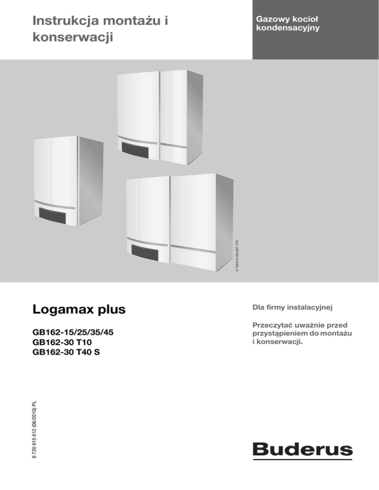 Instrukcja montażu i konserwacji 6 720 615 405-007.1TD Gazowy kocioł kondensacyjny Logamax plus 6 720 615 612 (06/2010) PL GB162-15/25/35/45 GB162-30 T10 GB162-30 T40 S Dla firmy instalacyjnej Przeczytać uważnie przed przystąpieniem do montażu i konserwacji. Spis treści Spis treści 5.5 1 2 3 Objaśnienie symboli i wskazówki dotyczące bezpieczeństwa . . . . . . . . . . . . . . . . . . . 4 1.1 Objaśnienie symboli . . . . . . . . . . . . . . . . . . . . . 4 1.2 Wskazówki dotyczące bezpieczeństwa . . . . . . 4 Dane kotła . . . . . . . . . . . . . . . . . . . . . . . . . . . . . . . . . 6 2.1 Zakres dostawy . . . . . . . . . . . . . . . . . . . . . . . . 6 2.1.1 Logamax plus GB162-15/25/35/45 . . . . . . . . . 6 2.1.2 Logamax plus GB162-30 T10 . . . . . . . . . . . . . 6 2.1.3 Logamax plus GB162-30 T40 S . . . . . . . . . . . . 6 2.2 Rysunek poglądowy produktu . . . . . . . . . . . . . 7 2.2.1 Logamax plus GB162-15/25/35/45 . . . . . . . . . 7 2.2.2 Logamax plus GB162-30 T10 . . . . . . . . . . . . . 9 2.2.3 Logamax plus GB162-30 T40 S . . . . . . . . . . . 11 2.3 Deklaracja zgodności CE . . . . . . . . . . . . . . . . 13 2.4 Nazwa gazowego kotła kondensacyjnego . . . 13 2.5 Użycie zgodnie z przeznaczeniem . . . . . . . . . 13 2.6 Informacje dotyczące niniejszej instrukcji . . . 13 2.7 Dane techniczne . . . . . . . . . . . . . . . . . . . . . . . 14 2.7.1 Specyfikacje techniczne . . . . . . . . . . . . . . . . . 14 2.7.2 Warunki użytkowania . . . . . . . . . . . . . . . . . . . 15 2.7.3 Paliwa i wyposażenie . . . . . . . . . . . . . . . . . . . 15 2.7.4 Schemat połączeń . . . . . . . . . . . . . . . . . . . . . 16 Przepisy . . . . . . . . . . . . . . . . . . . . . . . . . . . . . . . . . . 3.1 Obowiązywanie przepisów . . . . . . . . . . . . . . . 3.2 Wymagania . . . . . . . . . . . . . . . . . . . . . . . . . . . 3.3 Normy, przepisy i wytyczne . . . . . . . . . . . . . . 3.4 Obowiązek uzyskania pozwolenia i udzielenia informacji . . . . . . . . . . . . . . . . . . . 3.5 Pomieszczenie zainstalowania . . . . . . . . . . . . 3.6 Przyłącze instalacji powietrzno-spalinowej . . 3.7 Powietrze do spalania . . . . . . . . . . . . . . . . . . 3.8 Jakość wody . . . . . . . . . . . . . . . . . . . . . . . . . 3.8.1 Instalacja ogrzewcza (woda do napełniania i uzupełniania) . . . . . . . . . . . . . . 3.8.2 Woda zimna (doprowadzenie zaopatrzenia w ciepłą wodę) . . . . . . . . . . . . . 3.9 Jakość przewodów rurowych . . . . . . . . . . . . 3.10 Ochrona przed zamarzaniem . . . . . . . . . . . . . 3.10.1 Zintegrowana ochrona przed zamarzaniem . . 3.11 Materiał opakowaniowy . . . . . . . . . . . . . . . . . 18 18 18 18 Transport gazowego kotła kondensacyjnego . . . 4.1 Transport . . . . . . . . . . . . . . . . . . . . . . . . . . . . 4.2 Rozpakowanie . . . . . . . . . . . . . . . . . . . . . . . . 4.3 Podnoszenie i przenoszenie . . . . . . . . . . . . . . 21 21 21 21 Montaż . . . . . . . . . . . . . . . . . . . . . . . . . . . . . . . . . . . 5.1 Przykłady zastosowania . . . . . . . . . . . . . . . . . 5.2 Wymiary . . . . . . . . . . . . . . . . . . . . . . . . . . . . . 5.3 Zalecane odległości od ścian . . . . . . . . . . . . . 5.4 Narzędzia, materiały i środki pomocnicze . . . 22 22 23 24 24 18 18 19 19 19 5.6 5.7 5.7.1 5.7.2 5.7.3 5.7.4 5.7.5 5.7.6 5.7.7 5.7.8 5.7.9 5.8 5.8.1 5.8.2 5.8.3 5.9 5.9.1 5.9.2 5.9.3 5.9.4 5.9.5 5.9.6 19 5.9.7 19 20 20 20 20 5.9.8 5.9.9 5.9.10 5.9.11 4 5 2 5.9.12 5.9.13 5.9.14 5.9.15 5.9.16 Montaż gazowego kotła kondensacyjnego na ścianie . . . . . . . . . . . . . . . . . . . . . . . . . . . . 24 Montaż podgrzewaczu ładowanego warstwowo (tylko GB162-30 T40 S) . . . . . . . 25 Wykonanie przyłączy zasilających . . . . . . . . 25 Wykonanie przyłącza gazowego przez inwestora . . . . . . . . . . . . . . . . . . . . . . . . . . . . 25 Montaż zasilania ogrzewania i powrotu przez inwestora . . . . . . . . . . . . . . . . . . . . . . . 26 Cyrkulacja wody . . . . . . . . . . . . . . . . . . . . . . 26 Montaż rury zasilania i obiegu powrotu podgrzewacza ciepłej wody (tylko GB162-30 T40 S) . . . . . . . . . . . . . . . . . . . . . . 26 Zamontować przyłącze zasilania i powrotu zewnętrznego pojemnościowego podgrzewacza ciepłej wody . . . . . . . . . . . . . 27 Podłączenie naczynia wzbiorczego przez inwestora . . . . . . . . . . . . . . . . . . . . . . . 28 Zawór bezpieczeństwa . . . . . . . . . . . . . . . . . 28 Podłączenie przewodu ciepłej i wody zimnej (tylko kotły dwufunkcyjne) . . . . . . . . . 28 Podłączenie odprowadzenia kondensatu . . . 29 Wykonanie przyłącza instalacji powietrzno-spalinowej . . . . . . . . . . . . . . . . . . 29 Systemy odprowadzania spalinowe . . . . . . . 29 Tryb pracy zależny od powietrza w pomieszczeniu . . . . . . . . . . . . . . . . . . . . . . 29 Tryb pracy niezależny od powietrza w pomieszczeniu . . . . . . . . . . . . . . . . . . . . . . 30 Wykonanie podłączenia elektrycznego . . . . 30 Wskazówki ogólne . . . . . . . . . . . . . . . . . . . . 30 Podłączenie urządzeń za pomocą wtyczki sieciowej . . . . . . . . . . . . . . . . . . . . . . 30 Przyłącza na listwie zaciskowej . . . . . . . . . . 30 Możliwe do podłączenia sterowniki . . . . . . . 31 Podłączenie i montaż modułu obsługowego 31 Podłączenie do systemu regulacyjnego Logamatic 4000 . . . . . . . . . . . . . . . . . . . . . . . 32 Zintegrować i podłączyć moduły funkcyjne (osprzęt) . . . . . . . . . . . . . . . . . . . . . 32 Podłączenie kilku modułów . . . . . . . . . . . . . 33 Podłączenie czujnika temperatury zewnętrznej . . . . . . . . . . . . . . . . . . . . . . . . . . 34 Podłączenie regulatora temperatury Załącz/Wyłącz . . . . . . . . . . . . . . . . . . . . . . . . 34 Podłączenie zewnętrznego zestyku przełączającego . . . . . . . . . . . . . . . . . . . . . . . 34 Podłączenie czujnika temperatury zewnętrznej . . . . . . . . . . . . . . . . . . . . . . . . . . 34 Podłą