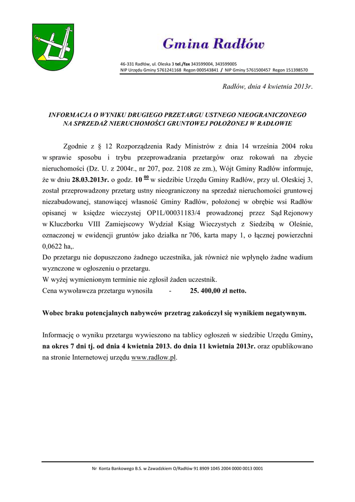 46-331 Radłów, ul. Oleska 3 tel./fax 343599004, 343599005 NIP Urzędu Gminy 5761241168 Regon 000543841 / NIP Gminy 5761500457 Regon 151398570 Radłów, dnia 4 kwietnia 2013r. INFORMACJA O WYNIKU DRUGIEGO PRZETARGU USTNEGO NIEOGRANICZONEGO NA SPRZEDAŻ NIERUCHOMOŚCI GRUNTOWEJ POŁOŻONEJ W RADŁOWIE Zgodnie z § 12 Rozporządzenia Rady Ministrów z dnia 14 września 2004 roku w sprawie sposobu i trybu przeprowadzania przetargów oraz rokowań na zbycie nieruchomości (Dz. U. z 2004r., nr 207, poz. 2108 ze zm.), Wójt Gminy Radłów informuje, że w dniu 28.03.2013r. o godz. 10 00 w siedzibie Urzędu Gminy Radłów, przy ul. Oleskiej 3, został przeprowadzony przetarg ustny nieograniczony na sprzedaż nieruchomości gruntowej niezabudowanej, stanowiącej własność Gminy Radłów, położonej w obrębie wsi Radłów opisanej w księdze wieczystej OP1L/00031183/4 prowadzonej przez Sąd Rejonowy w Kluczborku VIII Zamiejscowy Wydział Ksiąg Wieczystych z Siedzibą w Oleśnie, oznaczonej w ewidencji gruntów jako działka nr 706, karta mapy 1, o łącznej powierzchni 0,0622 ha,. Do przetargu nie dopuszczono żadnego uczestnika, jak również nie wpłynęło żadne wadium wyznczone w ogłoszeniu o przetargu. W wyżej wymienionym terminie nie zgłosił żaden uczestnik. Cena wywoławcza przetargu wynosiła - 25. 400,00 zł netto. Wobec braku potencjalnych nabywców przetrag zakończył się wynikiem negatywnym. Informację o wyniku przetargu wywieszono na tablicy ogłoszeń w siedzibie Urzędu Gminy, na okres 7 dni tj. od dnia 4 kwietnia 2013. do dnia 11 kwietnia 2013r. oraz opublikowano na stronie Internetowej urzędu www.radlow.pl. Nr Konta Bankowego B.S. w Zawadzkiem O/Radłów 91 8909 1045 2004 0000 0013 0001