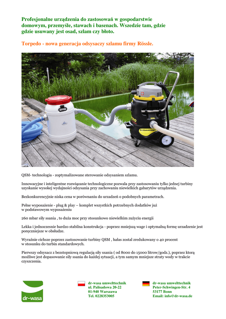 Profesjonalne urządzenia do zastosowań w gospodarstwie domowym, przemyśle, stawach i basenach. Wszedzie tam, gdzie gdzie usuwany jest osad, szlam czy błoto. Torpedo - nowa generacja odsysaczy szlamu firmy Rössle. QSM- technologia - zoptymalizowane sterowanie odsysaniem szlamu. Innowacyjne i inteligentne rozwiązanie technologiczne pozwala przy zastosowaniu tylko jednej turbiny uzyskanie wysokej wydajności odsysania przy zachowaniu niewielkich gabarytów urządzenia. Bezkonkurencyjnie niska cena w porównaniu do urzadzeń o podobnych parametrach. Pełne wyposażenie - plug & play – komplet wszystkich potrzebnych dodatków już w podstawowym wyposażeniu 260 mbar siły ssania , to duża moc przy stosunkowo niewielkim zużyciu energii Lekka i jednoczesnie bardzo stabilna konstrukcja - poprzez mniejszą wage i optymalną formę urzadzenie jest poręczniejsze w obsłudze. Wyraźnie cichsze poprzez zastosowanie turbiny QSM , hałas zostal zredukowany o 40 procent w stosunku do turbin standardowych. Pierwszy odsysacz z bezstopniową regulacją siły ssania ( od 8000 do 15000 litrow/godz.), poprzez ktorą możliwe jest dopasowanie siły ssania do każdej sytuacji, a tym samym mniejsze straty wody w trakcie czyszczenia. dr-wasa umwelttechnik ul. Palisadowa 20-22 01-940 Warszawa Tel. 0228353005 dr-wasa umwelttechnik Peter-Schwingen-Str. 4 53177 Bonn Email: [email protected] Profesjonalne urządzenia do zastosowań w gospodarstwie domowym, przemyśle, stawach i basenach. Wszedzie tam, gdzie gdzie usuwany jest osad, szlam czy błoto. Fango 2000 – kompaktowy odsysacz szlamu firmy Rössle. Bezkonkurencyjny stosunek ceny do wydajności w klasie kompaktowej. Pełne wyposażenie - włączyć i używać. Niezbedne dodatki w podstawowym wyposażeniu. 240 mbar siły ssania usatysfakcjonuje również zawodowca Szczotka obrotowa „Biber”- elektrycznie napędzana szczotka obrotowa, ułatwia oczyszczanie różnych powierzchni. „Edlrein” - rewolucja w oczyszczaniu scian. Wyłożone folią ściany czyszczone sa poprzez zastosowanie wysoko wydajnej tkaniny mikrofazowej.Poprzez podłączenie do odsysacza szlamu, oczyszczanie ścian nie wymaga wysiłku. Rössle – 15 lat doświadczeń w projektowaniu i budowie urzadzeń do oczyszczania stawów. 15 –letnie doswiadczenie w konstruowaniu, wplynelo na budowe coraz sprawniejszych urzadzeń, a nowe rozwiązania są natychmiast wdrażane do produkcji. Do każdego typu uszczelnienia czy materiału dobieramy pasujące szczotki i dysze. W ofercie posiadamy: filtry bebnowe, osadniki oraz roboty do stawów. Wykonujemy rownież jednostkowe, indywidualnie zaprojektowane urządzenia. Gwarantowany serwis –przez producenta jak rownież przez przeszkolonych techników. Naprawa albo dostawa nowego urzadzenia w ciagu trzech dni. dr-wasa umwelttechnik ul. Palisadowa 20-22 01-940 Warszawa Tel. 0228353005 dr-wasa umwelttechnik Peter-Schwingen-Str. 4 53177 Bonn Email: [email protected]