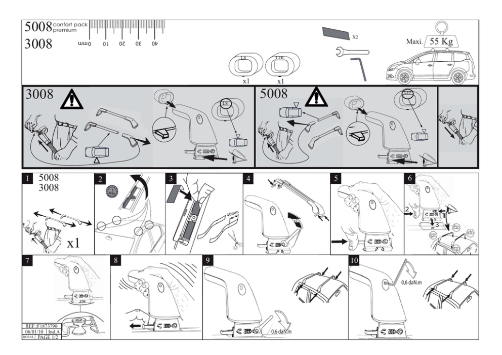 confort pack premium MM 290 291 608 108 VERTAVANT VERDEADELANTE ZIELONYPRZOD 288 BLEUARRI RE AZULATRAS NIEBIESKITYL 5008 3008 X2 289 !6!.4$2/)4 !.4%2)/2%$%342! 02:/$02!7!342/.! !6!.4'!5#(% !.4%2)/2%3).)342! 02:/$,%7!342/.! !22)%2%$2/)4 0/34%2)/2%$%342! 49,02!7!342/.! !22)%2%'!5#(% 0/34%2)/2%3).)342! 49,,%7!342/.! x1 t uveerrt Feu x1 5008 3008 1 55 Kg L10 L8 ert Feuv rt &%56%24 :)DELA0LAINEDELgAIN 3!).465,"!3 .²VERT Maxi. RT VE U &E L10 L8 5008 3008 3 2 6 5 4 Feuvert rt t er Feuv m 40m 2 vert Feu 1 x2 3 Feuvert Feuvert x1 ERT &EUV 10 9 8 7 0,6 daN.m Feuvert 0,6 daN.m rt vert Feuve Feuvert Feuvert REF.:F1873790 Réf.:F1883790 06/01/10ind.A Ind.A 06/01/10 1/21/2 BOSAL PAGE BOSAL PAGE 0,6 daN.m Français Sécurité - Prière de bien lire l’instruction de montage avant de commencer. - Veuillez vérifier que tous les articles sont inclus dans la boite. - Suivez l’ordre de numérotation 1,2,3 etc… - Ces barres de toit ne conviennent qu’au véhicule spécifié au recto de cette notice. - Fixer de façon sûre et correcte la charge. - Il est recommandé d’utiliser les accessoires adaptés au transport de la charge considérée (porte-vélo, porte-ski, etc…) - Faire attention à ne pas abîmer les barres de toit (chocs, etc…) et de veiller à un bon entretien des barres. - Nettoyer et sécher les surfaces en contact avec le véhicule avant montage. - Ces barres ont été conçues pour être placées à un endroit précis du véhicule. - La fixation sur le véhicule n’est plus garantie si le positionnement est différent de celui indiqué sur cette notice. - Les dispositifs de fixation doivent être serrés correctement et vérifiés régulièrement au cours des trajets. - L’arrimage des bagages avec des liens élastiques (sandow, tendeurs, etc...) est interdit; sangles conseillées. - Les pattes métalliques de fixation ont reçu un traitement spécial anti-agression de la peinture de votre véhicule ; ce traitement a fait l’objet de recherches approfondies. - N’intercaler aucune garniture supplémentaire (caoutchouc, plastique ou autre) entre la patte de fixation et la carrosserie, la bonne tenue des barres ne serait plus assurée. - Respecter la charge maximum admissible par le véhicule préconisée au recto. - La hauteur de la charge ne doit pas dépasser celle préconisée par le constructeur dans le manuel d’utilisation. - Planches à voile et charges longues: réduire la vitesse, 90 km/heure conseillé. - Pour économie d’énergie, les barres seront enlevées si elles ne sont pas utilisées. - Toute charge transportée sur le pavillon d’un véhicule affecte de manière sensible son comportement en particulier la sensibilité au vent latéral et le comportement en virage et au freinage. Il est conseillé de conduire avec plus de prudence (réduire la vitesse, tenir compte de l’augmentation des distances de freinage) - Important : Suivre correctement les instructions de montage et d’utilisation. Le non respect de cette notice d’utilisation dégage la responsabilité du constructeur. OK NO ESPAÑOL SEGURIDAD - Leer atentamente las instrucciones de montaje antes de comenzar. - Verificar que todos los artículos se encuentran en la caja. - Seguir el orden de numeración 1, 2, 3, etc. - Estas barras de techo sólo sirven para el vehículo especificado en el anverso de estas instrucciones. - Fijar la carga adecuadamente y de forma segura. - Se recomienda utilizar accesorios adaptados al transporte de la carga en cuestión (portabicicletas, portaesquís, etc.) - Prestar atención para no deteriorar las barras de techo (golpes, etc.) y realizar correctamente su mantenimiento. - Antes del montaje, limpiar y secar las superficies en contacto con el vehículo. - Estas barras han sido diseñadas para ser montadas en un lugar preciso del vehículo. - La fijación en el vehículo no está garantizada si la posición es diferente de la indicada en estas instrucciones. - Es imprescindible apretar correctamente los dispositivos de fijación y comprobarlos periódicamente durante el trayecto. - Se prohíbe sujetar el equipaje con elásticos (pulpos, tensores, etc.); se aconseja utilizar correas. - Las patillas metálicas de fijación han recibido un tratamiento especial antiagresión de la pintura de su vehículo; este tratamiento ha sido objeto de minuciosas investigaciones. - No intercalar ninguna guarnición suplementaria (caucho, plástico u otros) entre la patilla de fijación y la carrocería ya que, de lo contrario, no se garantizaría la correcta sujeción de las barras. - Respecte la carga máxima admitida por el vehículo que se indica en el anverso. - La altura de la carga no debe sobrepasar la recomendada por el fabricante en el manual de utilización. - Tablas de vela y cargas largas: reducir la velocidad; se recomienda circular a 90 km/h. - Para ahorrar energía, desmontar las barras si no se utilizan. - Todas las cargas que se transporten en el techo de un vehículo afectan de manera importante en su comportamiento, en especial en la sensibilidad al viento lateral y en el comportamiento en los giros y en la frenada. Se aconseja conducir con mayor prudencia (reducir la velocidad y tener en cuenta el aumento de la distancia para frenar) - Importante: Seguir correctamente las instrucciones de montaje y utilización. El incumplimiento de estas instrucciones de utilización exime de responsabilidad al Fabricante. POLSKI BEZPIECZEŃSTWO - Przed przystąpieniem do pracy należy dokładnie przeczytać instrukcję montażu. - Prosimy o sprawdzenie, czy wszystkie elementy znajdują się w opakowaniu. - Należy sprawdzić je zgodnie z kolejnymi numerami 1, 2, 3 itd. - Listwy dachowe przeznaczone są jedynie do samochodów wymienionych na odwrocie niniejszej instrukcji. - Należy zawsze zamocować ładunek w sposób prawidłowy i pewny. - Zalecane jest korzystanie z akcesoriów odpowiednich dla przewożonego ładunku (bagażnik na rowery, bagażnik na narty itd.). - Nale
