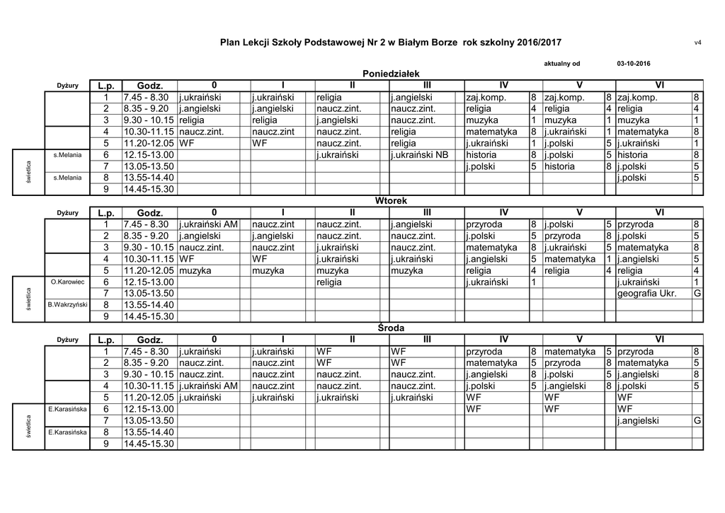 Plan Lekcji Szkoły Podstawowej Nr 2 w Białym Borze rok szkolny 2016/2017 v4 aktualny od 03-10-2016 V zaj.komp. religia muzyka j.ukraiński j.polski j.polski historia VI zaj.komp. religia muzyka matematyka j.ukraiński historia j.polski j.polski Poniedziałek Dyżury świetlica s.Melania s.Melania L.p. 1 2 3 4 5 6 7 8 9 Godz. 7.45 - 8.30 8.35 - 9.20 9.30 - 10.15 10.30-11.15 11.20-12.05 12.15-13.00 13.05-13.50 13.55-14.40 14.45-15.30 0 j.ukraiński j.angielski religia naucz.zint. WF I j.ukraiński j.angielski religia naucz.zint WF L.p. 1 2 3 4 5 6 7 8 9 Godz. 7.45 - 8.30 8.35 - 9.20 9.30 - 10.15 10.30-11.15 11.20-12.05 12.15-13.00 13.05-13.50 13.55-14.40 14.45-15.30 0 j.ukraiński AM j.angielski naucz.zint. WF muzyka I naucz.zint j.angielski naucz.zint WF muzyka L.p. 1 2 3 4 5 6 7 8 9 Godz. 7.45 - 8.30 8.35 - 9.20 9.30 - 10.15 10.30-11.15 11.20-12.05 12.15-13.00 13.05-13.50 13.55-14.40 14.45-15.30 0 j.ukraiński naucz.zint. naucz.zint. j.ukraiński AM j.ukraiński I j.ukraiński naucz.zint naucz.zint naucz.zint j.ukraiński II religia naucz.zint. j.angielski naucz.zint. naucz.zint. j.ukraiński III j.angielski naucz.zint. naucz.zint. religia religia j.ukraiński NB IV zaj.komp. religia muzyka matematyka j.ukraiński historia j.polski 8 4 1 8 1 8 5 8 4 1 1 5 5 8 8 4 1 8 1 8 5 5 Wtorek Dyżury świetlica O.Karowiec B.Wakrzyński II naucz.zint. naucz.zint. j.ukraiński j.ukraiński muzyka religia III j.angielski naucz.zint. naucz.zint. j.ukraiński muzyka IV przyroda j.polski matematyka j.angielski religia j.ukraiński V 8 5 8 5 4 1 j.polski przyroda j.ukraiński matematyka religia VI 5 8 5 1 4 przyroda j.polski matematyka j.angielski religia j.ukraiński geografia Ukr. 8 5 8 5 4 1 G Środa Dyżury świetlica E.Karasińska E.Karasińska II WF WF naucz.zint. naucz.zint. j.ukraiński III WF WF naucz.zint. naucz.zint. j.ukraiński IV przyroda matematyka j.angielski j.polski WF WF 8 5 8 5 V matematyka przyroda j.polski j.angielski WF WF VI 5 8 5 8 przyroda matematyka j.angielski j.polski WF WF j.angielski 8 5 8 5 G Czwartek Dyżury świetlica A.Mazur A.Czapiewska L.p. 1 2 3 4 5 6 7 8 9 Godz. 7.45 - 8.30 8.35 - 9.20 9.30 - 10.15 10.30-11.15 11.20-12.05 12.15-13.00 13.05-13.50 13.55-14.40 14.45-15.30 0 zaj.komp. naucz.zint. naucz.zint. j.ukraiński AM j.ukraiński AM I zaj.komp. naucz.zint. naucz.zint. naucz.zint. naucz.zint. L.p. 1 2 3 4 5 6 7 8 9 Godz. 7.45 - 8.30 8.35 - 9.20 9.30 - 10.15 10.30-11.15 11.20-12.05 12.15-13.00 13.05-13.50 13.55-14.40 14.45-15.30 0 j.ukraiński AM j.ukraiński naucz.zint. WF plastyka I naucz.zint. j.ukraiński naucz.zint. WF plastyka II zaj.komp. naucz.zint. naucz.zint. naucz.zint. naucz.zint. III naucz.zint. naucz.zint. j.ukraiński NB naucz.zint. naucz.zint. naucz.zint. IV j.ukraiński zaj.techn. j.polski plastyka matematyka V 1 7 5 7 5 j.polski j.ukraiński plastyka matematyka zaj.techn. j.angielski matematyka 5 1 7 5 7 8 5 VI j.ukraiński zaj.techn. j.polski plastyka matematyka matematyka WDŻWR 1 7 5 7 5 5 1 Piątek Dyżury świetlica B.Wakrzyński E.Karasińska II WF j.angielski naucz.zint. j.ukraiński plastyka III WF naucz.zint. zaj.komp. j.ukraiński NB plastyka IV WF j.polski j.ukraiński przyroda j.angielski GW jp dla Ukr. Uwaga: Sala G oznacza salę gimnastyczną/pomieszczenie w budynku Gimnazjum i Liceum (na górze) V 5 1 8 5 8 8 WF j.ukraiński j.polski j.angielski przyroda GW VI 1 5 5 8 8 WF j.polski j.ukraiński przyroda historia GW jp dla Ukr. 5 1 8 1 8 8