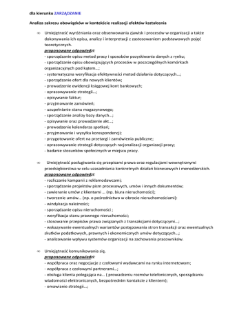dla kierunku ZARZĄDZANIE Analiza zakresu obowiązków w kontekście realizacji efektów kształcenia • Umiejętność wyróżniania oraz obserwowania zjawisk i procesów w organizacji a także dokonywania ich opisu, analizy i interpretacji z zastosowaniem podstawowych pojęć teoretycznych. proponowane odpowiedzi: - sporządzanie opisu metod pracy i sposobów pozyskiwania danych z rynku; - sporządzanie opisu obowiązujących procesów w poszczególnych komórkach organizacyjnych pod kątem…; - systematyczna weryfikacja efektywności metod działania dotyczących…; - sporządzanie ofert dla nowych klientów; - prowadzenie ewidencji księgowej kont bankowych; - opracowywanie strategii…; - opisywanie faktur; - przyjmowanie zamówień; - uzupełnianie stanu magazynowego; - sporządzanie analizy bazy danych…; - opisywanie oraz prowadzenie akt…; - prowadzenie kalendarza spotkań; - przyjmowanie i wysyłka korespondencji; - przygotowanie ofert na przetargi i zamówienia publiczne; - opracowywanie strategii dotyczących racjonalizacji organizacji pracy; - badanie stosunków społecznych w miejscu pracy. • Umiejętność posługiwania się przepisami prawa oraz regulacjami wewnętrznymi przedsiębiorstwa w celu uzasadniania konkretnych działań biznesowych i menedżerskich. proponowane odpowiedzi: - rozliczanie kampanii z reklamodawcami; - sporządzanie projektów pism procesowych, umów i innych dokumentów; - zawieranie umów z klientami … (np. biura nieruchomości); - tworzenie umów… (np. o pośrednictwo w obrocie nieruchomościami): - windykacja należności; - sporządzanie opisu nieruchomości ; - weryfikacja stanu prawnego nieruchomości; - stosowanie przepisów prawa związanych z transakcjami dotyczącymi...; - wskazywanie ewentualnych wariantów postępowania stron transakcji oraz ewentualnych skutków podatkowych, prawnych i ekonomicznych umów dotyczących…; - analizowanie wpływu systemów organizacji na zachowania pracowników. • Umiejętność komunikowania się. proponowane odpowiedzi: - współpraca oraz negocjacje z czołowymi wydawcami na rynku internetowym; - współpraca z czołowymi partnerami…; - obsługa klienta polegająca na… ( prowadzeniu rozmów telefonicznych, sporządzaniu wiadomości elektronicznych, bezpośrednim kontakcie z klientem); - omawianie strategii…; - przygotowywanie kompleksowych ofert rynku … (np. nieruchomości i ich prezentacja dla klientów biura); - omawianie z klientami sytuacji prawnych dotyczącej transakcji… . • Umiejętność współdziałania i pracy w grupie. proponowane odpowiedzi: - aktywne współdziałanie przy opracowywaniu obszaru…; - współtworzenie i realizacja strategii… ( np. stałej poprawy wyników sprzedaży); - koordynacja prac zespołu…; - budowanie trwałych relacji z reklamodawcami, wydawcami, klientami; - współrealizowanie zadań w ramach grupy…; - negocjacje z klientami podczas zawierania ofert … (np. kupna-sprzedaży nieruchomości); - asystowanie i pomoc w tworzeniu i sprzedaży oferty dotyczącej… .
