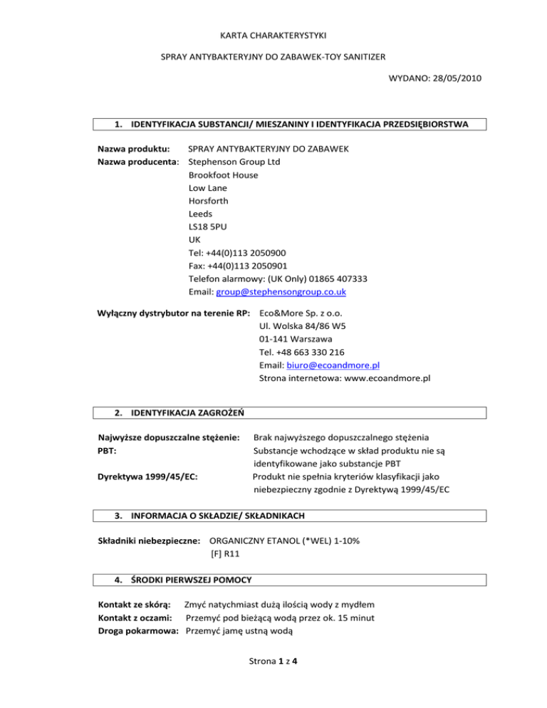 KARTA CHARAKTERYSTYKI SPRAY ANTYBAKTERYJNY DO ZABAWEK-TOY SANITIZER WYDANO: 28/05/2010 1. IDENTYFIKACJA SUBSTANCJI/ MIESZANINY I IDENTYFIKACJA PRZEDSIĘBIORSTWA Nazwa produktu: SPRAY ANTYBAKTERYJNY DO ZABAWEK Nazwa producenta: Stephenson Group Ltd Brookfoot House Low Lane Horsforth Leeds LS18 5PU UK Tel: +44(0)113 2050900 Fax: +44(0)113 2050901 Telefon alarmowy: (UK Only) 01865 407333 Email: [email protected] Wyłączny dystrybutor na terenie RP: Eco&More Sp. z o.o. Ul. Wolska 84/86 W5 01-141 Warszawa Tel. +48 663 330 216 Email: [email protected] Strona internetowa: www.ecoandmore.pl 2. IDENTYFIKACJA ZAGROŻEŃ Najwyższe dopuszczalne stężenie: PBT: Brak najwyższego dopuszczalnego stężenia Substancje wchodzące w skład produktu nie są identyfikowane jako substancje PBT Produkt nie spełnia kryteriów klasyfikacji jako niebezpieczny zgodnie z Dyrektywą 1999/45/EC Dyrektywa 1999/45/EC: 3. INFORMACJA O SKŁADZIE/ SKŁADNIKACH Składniki niebezpieczne: ORGANICZNY ETANOL (*WEL) 1-10% [F] R11 4. ŚRODKI PIERWSZEJ POMOCY Kontakt ze skórą: Zmyć natychmiast dużą ilością wody z mydłem Kontakt z oczami: Przemyć pod bieżącą wodą przez ok. 15 minut Droga pokarmowa: Przemyć jamę ustną wodą Strona 1 z 4 KARTA CHARAKTERYSTYKI SPRAY ANTYBAKTERYJNY DO ZABAWEK-TOY SANITIZER WYDANO: 28/05/2010 Droga oddechowa: Skonsultować się z lekarzem 5. POSTĘPOWANIE W PRZYPADKU POŻARU Środki gaśnicze: Należy zastosować odpowiednie środki gaśnicze do pożaru. Pojemniki można chłodzić mgłą wodną. Niebezpieczne produkty spalania: Toksyczne dymy Środki ochrony dla straży pożarnej: Aparat oddechowy, ubranie zabezpieczające przed kontaktem z oczami i skórą 6. POSTĘPOWANIE W PRZYPADKU NIEZAMIERZONEGO UWOLNIENIA DO ŚRODOWISKA Indywidualne środki ostrożności: Znajdują się w rozdziale 8 SDS o ochronie indywidualnej Środki ostrożności w zakresie ochrony środowiska: Nie wylewać do kanalizacji lub do rzeki. Ograniczyć wyciek za pomocą obwałowania . Procedura oczyszczania: Zebrać w suchej ziemi lub piasku . Przenieść do zamykanego , oznakowanego pojemnika awaryjnego w celu pozbycia się produktu w odpowiedni sposób 7. POSTĘPOWANIE Z SUBSTANCJAMI I MIESZANINAMI ORAZ ICH MAGAZYNOWANIE Zasady magazynowania: Przechowywać w chłodnym pomieszczeniu z dobrą wentylacją. Pojemniki z substancją powinny być szczelnie zamknięte 8. KONTROLA NARAŻENIA/ ŚRODKI OCHRONY NDYWIDUALNEJ Niebezpieczne składniki: Ochrona dróg oddechowych: Ochrona dłoni: Ochrona oczu: Ochrona skóry: ORGANICZNY ETANOL UK - 8 godzin TWA: 1000 ppm Nie jest wymagana Rękawice ochronne Okulary ochronne Odzież ochronna 9. WŁAŚCIWOŚCI FIZYCZNE I CHEMICZNE Stan skupienia: Kolor: Płyn Bezbarwny Strona 2 z 4 KARTA CHARAKTERYSTYKI SPRAY ANTYBAKTERYJNY DO ZABAWEK-TOY SANITIZER WYDANO: 28/05/2010 Zapach: Rozpuszczalność w wodzie: pH: Charakterystyczny Rozpuszczalny 2-3 10. STABILNOŚĆ I REAKTYWNOŚĆ Stabilność: W normalnych warunkach produkt jest stabilny Warunki, których należy unikać: Wysoka temperatura Silne utleniacze, mocne kwasy Podczas spalania wydziela toksyczne dymy Niezgodne materiały: Niebezpieczne produkty rozkładu: 11. INFORMACJE TOKSYKOLOGICZNE OBJAWY Kontakt ze skórą: Kontakt z oczami: Droga pokarmowa: Droga oddechowa: Może wystąpić łagodne podrażnienie w miejscu kontaktu Może wystąpić podrażnienie i zaczerwienienie Może wystąpić podrażnienie gardła Brak objawów 12. INFORMACJE EKOLOGICZNE Mobilność: Trwałość i zdolność do rozkładu: Zdolność do bioakumulacji: Inne szkodliwe skutki działania: Identyfikacja PBT: Łatwo wsiąka w glebę Biodegradowalny Nie ma zdolności bioakumulacji Nieznaczna ekotoksyczność Produkt nie został zdefiniowany jako substancja PBT 13. POSTĘPOWANIE Z ODPADAMI NB: Należy zwrócić uwagę na regionalne i/lub krajowe regulacje dotyczące postępowania z odpadami 14. INFORMACJE DOTYCZĄCE TRANSPORTU ADR/ RID IMDG/ IMO IATA/ ICAO 15. INFORMACJE DOTYCZĄCE PRZEPISÓW PRAWNYCH Symbole zagrożenia: Nie stwierdzono istotnego zagrożenia Strona 3 z 4 KARTA CHARAKTERYSTYKI SPRAY ANTYBAKTERYJNY DO ZABAWEK-TOY SANITIZER WYDANO: 28/05/2010 Uwagi: Podane powyżej informacje prawne, wskazują jedynie podstawowe przepisy specyfikacji produktu opisanego w karcie charakterystyki. Instrukcja zwraca uwagę na możliwość istnienia dodatkowych postanowień stanowiących uzupełnienie tych regulacji. Odnoszą się do wszystkich obowiązujących przepisów krajowych , międzynarodowych i lokalnych lub postanowień. 16. POZOSTAŁE INFORMACJE Pozostałe informacje: Niniejsza karta charakterystyki została sporządzona zgodnie z rozporządzeniem (WE ) nr 1907/2006 . * Oznacza fragment karty charakterystyki , która zmieniła się od ostatniego przeglądu Zwroty R wykorzystywane w s.3: R11: Produkt wysoce łatwopalny Zastrzeżenie prawne: Powyższe informacje uważa się za prawidłowe , lecz nie oznacza to że są kompletne i powinny być używane tylko jako wytyczne . Firma nie ponosi odpowiedzialności za jakiekolwiek szkody wynikające z pracy lub kontaktu z powyższym produktem Strona 4 z 4