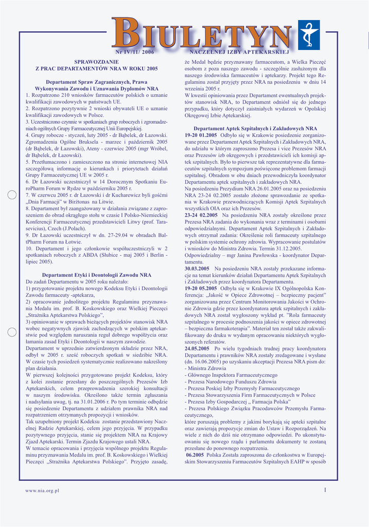 B IULETYN Nr IV/11/ 2006 SPRAWOZDANIE Z PRAC DEPARTAMENTÓW NRA W ROKU 2005 Departament Spraw Zagranicznych, Prawa Wykonywania Zawodu i Uznawania Dyplomów NRA 1. Rozpatrzono 210 wniosków farmaceutów polskich o uznanie kwalifikacji zawodowych w państwach UE. 2. Rozpatrzono pozytywnie 2 wnioski obywateli UE o uznanie kwalifikacji zawodowych w Polsce. 3. Uczestniczono czynnie w spotkaniach grup roboczych i zgromadzeniach ogólnych Grupy Farmaceutycznej Unii Europejskiej. 4. Grupy robocze - styczeń, luty 2005 - dr Bąbelek, dr Łazowski. Zgromadzenia Ogólne Bruksela - marzec i październik 2005 (dr Bąbelek, dr Łazowski), Ateny - czerwiec 2005 (mgr Wróbel, dr Bąbelek, dr Łazowski). 5. Przetłumaczono i zamieszczono na stronie internetowej NIA szczegółową informację o kierunkach i priorytetach działań Grupy Farmaceutycznej UE w 2005 r. 6. Dr Łazowski uczestniczył w 14 Dorocznym Spotkaniu EuroPharm Forum w Rydze w październiku 2005 r. 7. W czerwcu 2005 r. dr Łazowski i dr Kucharewicz byli gośćmi „Dnia Farmacji” w Birźtonas na Litwie. 8. Departament był zaangażowany w działania związane z zaproszeniem do obrad okrągłego stołu w czasie I Polsko-Niemieckiej Konferencji Farmaceutycznej przedstawicieli Litwy (prof. Tarasevicius), Czech (J.Polach). 9. Dr Łazowski uczestniczył w dn. 27-29.04 w obradach BaltPharm Forum na Łotwie. 10. Departament i jego członkowie współuczestniczyli w 2 spotkaniach roboczych z ABDA (Słubice - maj 2005 i Berlin lipiec 2005). Departament Etyki i Deontologii Zawodu NRA Do zadań Departamentu w 2005 roku należało: 1) przygotowanie projektu nowego Kodeksu Etyki i Deontologii Zawodu farmaceuty -aptekarza, 2) opracowanie jednolitego projektu Regulaminu przyznawania Medalu im. prof. B. Koskowskiego oraz Wielkiej Pieczęci „Strażnika Aptekarstwa Polskiego”, 3) opiniowanie w sprawach bieżących projektów stanowisk NRA wobec negatywnych zjawisk zachodzących w polskim aptekarstwie pod względem naruszania reguł dobrego współżycia oraz łamania zasad Etyki i Deontologii w naszym zawodzie. Departament w uprzednio zatwierdzonym składzie przez NRA, odbył w 2005 r. sześć roboczych spotkań w siedzibie NRA. W czasie tych posiedzeń systematycznie realizowano nakreślony plan działania. W pierwszej kolejności przygotowano projekt Kodeksu, który z kolei zostanie przesłany do poszczególnych Prezesów Izb Aptekarskich, celem przeprowadzenia szerokiej konsultacji w naszym środowisku. Określono także termin zgłaszania i nadsyłania uwag, tj. na 31.01.2006 r. Po tym terminie odbędzie się posiedzenie Departamentu z udziałem prawnika NRA nad rozpatrzeniem otrzymanych propozycji i wniosków. Tak uzupełniony projekt Kodeksu zostanie przedstawiony Naczelnej Radzie Aptekarskiej, celem jego przyjęcia. W przypadku pozytywnego przyjęcia, stanie się projektem NRA na Krajowy Zjazd Aptekarski. Termin Zjazdu Krajowego ustali NRA. W temacie opracowania i przyjęcia wspólnego projektu Regulaminu przyznawania Medalu im. prof. B. Koskowskiego i Wielkiej Pieczęci „Strażnika Aptekarstwa Polskiego”. Przyjęto zasadę, NACZELNEJ IZBY APTEKARSKIEJ że Medal będzie przyznawany farmaceutom, a Wielka Pieczęć osobom z poza naszego zawodu - szczególnie zasłużonym dla naszego środowiska farmaceutów i aptekarzy. Projekt tego Regulaminu został przyjęty przez NRA na posiedzeniu w dniu 14 września 2005 r. W kwestii opiniowania przez Departament ewentualnych projektów stanowisk NRA, to Departament odniósł się do jednego przypadku, który dotyczył zaistniałych wydarzeń w Opolskiej Okręgowej Izbie Aptekarskiej. Departament Aptek Szpitalnych i Zakładowych NRA 19-20 01.2005 Odbyło się w Krakowie posiedzenie zorganizowane przez Departament Aptek Szpitalnych i Zakładowych NRA, do udziału w którym zaproszono Prezesa i vice Prezesów NRA oraz Prezesów izb okręgowych i przedstawicieli ich komisji aptek szpitalnych. Było to pierwsze tak reprezentatywne dla farmaceutów szpitalnych sympozjum poświęcone problemom farmacji szpitalnej. Obradom w obu dniach przewodniczyła koordynator Departamentu aptek szpitalnych i zakładowych NRA. Na posiedzeniu Prezydium NRA 26.01.2005 oraz na posiedzeniu NRA 23-24 02.2005 zostało złożone sprawozdanie ze spotkania w Krakowie przewodniczących Komisji Aptek Szpitalnych wszystkich OIA oraz ich Prezesów. 23-24 02.2005 Na posiedzeniu NRA zostały określone przez Prezesa NRA zadania do wykonania wraz z terminami i osobami odpowiedzialnymi. Departament Aptek Szpitalnych i Zakładowych otrzymał zadania: Określenie roli farmaceuty szpitalnego w polskim systemie ochrony zdrowia. Wypracowanie postulatów i wniosków do Ministra Zdrowia. Termin 31.12.2005. Odpowiedzialny – mgr Janina Pawłowska - koordynator Departamentu. 30.03.2005 Na posiedzeniu NRA zostały przekazane informacje na temat kierunków działań Departamentu Aptek Szpitalnych i Zakładowych przez koordynatora Departamentu. 19-20 05.2005 Odbyła się w Krakowie IX Ogólnopolska Konferencja: „Jakość w Opiece Zdrowotnej – bezpieczny pacjent” zorganizowana przez Centrum Monitorowania Jakości w Ochronie Zdrowia gdzie przez koordynatora aptek szpitalnych i zakładowych NRA został wygłoszony wykład pt. ”Rola farmaceuty szpitalnego w procesie podnoszenia jakości w opiece zdrowotnej – bezpieczna farmakoterapia”. Materiał ten został także zakwalifikowany do druku w wydanym opracowaniu niektórych wygłoszonych referatów. 24.05.2005 Po wielu tygodniach trudnej pracy koordynatora Departamentu i prawników NRA zostały zredagowane i wysłane (dn. 16.06.2005) po uzyskaniu akceptacji Prezesa NRA pism do: - Ministra Zdrowia - Głównego Inspektora Farmaceutycznego - Prezesa Narodowego Funduszu Zdrowia - Prezesa Poskiej Izby Przemysły Farmaceutycznego - Prezesa Stowarzyszenia Firm Farmaceutycznych w Polsce - Prezesa Izby Gospodarczej „ Farmacja Polska” - Prezesa Polskiego Związku Pracodawców Przemysłu Farmaceutyczn