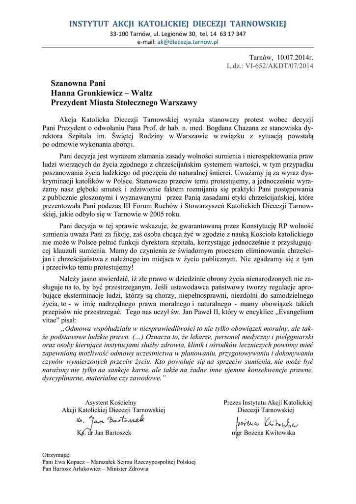 INSTYTUT AKCJI KATOLICKIEJ DIECEZJI TARNOWSKIEJ 33-100 Tarnów, ul. Legionów 30, tel. 14 63 17 347 e-mail: [email protected] Tarnów, 10.07.2014r. L.dz.: VI-652/AKDT/07/2014 Szanowna Pani Hanna Gronkiewicz – Waltz Prezydent Miasta Stołecznego Warszawy Akcja Katolicka Diecezji Tarnowskiej wyraża stanowczy protest wobec decyzji Pani Prezydent o odwołaniu Pana Prof. dr hab. n. med. Bogdana Chazana ze stanowiska dyrektora Szpitala im. Świętej Rodziny w Warszawie w związku z sytuacją powstałą po odmowie wykonania aborcji. Pani decyzja jest wyrazem złamania zasady wolności sumienia i nierespektowania praw ludzi wierzących do życia zgodnego z chrześcijańskim systemem wartości, w tym przypadku poszanowania życia ludzkiego od poczęcia do naturalnej śmierci. Uważamy ją za wyraz dyskryminacji katolików w Polsce. Stanowczo przeciw temu protestujemy, a jednocześnie wyrażamy nasz głęboki smutek i zdziwienie faktem rozmijania się praktyki Pani postępowania z publicznie głoszonymi i wyznawanymi przez Panią zasadami etyki chrześcijańskiej, które prezentowała Pani podczas III Forum Ruchów i Stowarzyszeń Katolickich Diecezji Tarnowskiej, jakie odbyło się w Tarnowie w 2005 roku. Pani decyzja w tej sprawie wskazuje, że gwarantowaną przez Konstytucję RP wolność sumienia uważa Pani za fikcję, zaś osoba chcąca żyć w zgodzie z nauką Kościoła katolickiego nie może w Polsce pełnić funkcji dyrektora szpitala, korzystając jednocześnie z przysługującej klauzuli sumienia. Mamy do czynienia ze świadomym procesem eliminowania chrześcijan i chrześcijaństwa z należnego im miejsca w życiu publicznym. Nie zgadzamy się z tym i przeciwko temu protestujemy! Należy jasno stwierdzić, iż złe prawo w dziedzinie obrony życia nienarodzonych nie zasługuje na to, by być przestrzeganym. Jeśli ustawodawca państwowy tworzy regulacje aprobujące eksterminację ludzi, którzy są chorzy, niepełnosprawni, niezdolni do samodzielnego życia, to - w imię nadrzędnego prawa moralnego i naturalnego - mamy obowiązek takich przepisów nie przestrzegać. Tego nas uczył św. Jan Paweł II, który w encyklice „Evangelium vitae” pisał: „Odmowa współudziału w niesprawiedliwości to nie tylko obowiązek moralny, ale także podstawowe ludzkie prawo. (…) Oznacza to, że lekarze, personel medyczny i pielęgniarski oraz osoby kierujące instytucjami służby zdrowia, klinik i ośrodków leczniczych powinny mieć zapewnioną możliwość odmowy uczestnictwa w planowaniu, przygotowywaniu i dokonywaniu czynów wymierzonych przeciw życiu. Kto powołuje się na sprzeciw sumienia, nie może być narażony nie tylko na sankcje karne, ale także na żadne inne ujemne konsekwencje prawne, dyscyplinarne, materialne czy zawodowe.” Asystent Kościelny Akcji Katolickiej Diecezji Tarnowskiej Ks. dr Jan Bartoszek Otrzymują: Pani Ewa Kopacz – Marszałek Sejmu Rzeczypospolitej Polskiej Pan Bartosz Arłukowicz – Minister Zdrowia Prezes Instytutu Akcji Katolickiej Diecezji Tarnowskiej mgr Bożena Kwitowska