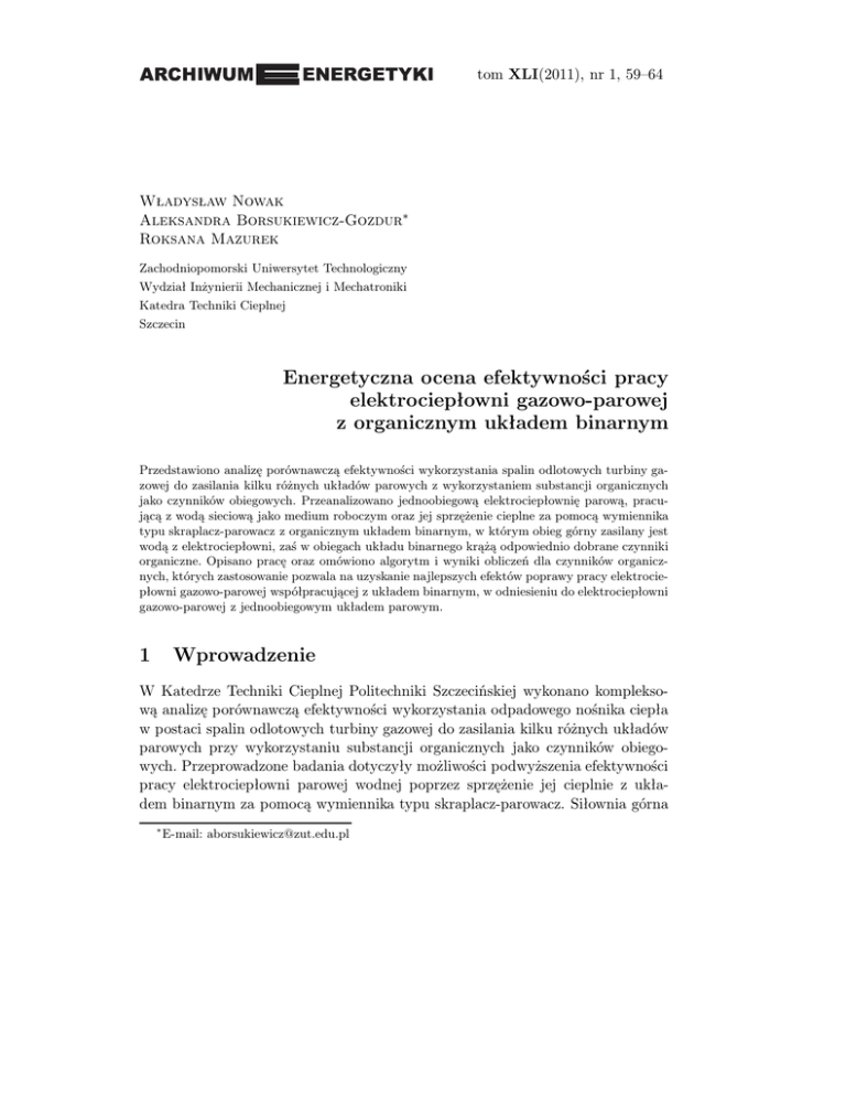 tom XLI(2011), nr 1, 59–64 Władysław Nowak Aleksandra Borsukiewicz-Gozdur∗ Roksana Mazurek Zachodniopomorski Uniwersytet Technologiczny Wydział Inżynierii Mechanicznej i Mechatroniki Katedra Techniki Cieplnej Szczecin Energetyczna ocena efektywności pracy elektrociepłowni gazowo-parowej z organicznym układem binarnym Przedstawiono analizę porównawczą efektywności wykorzystania spalin odlotowych turbiny gazowej do zasilania kilku różnych układów parowych z wykorzystaniem substancji organicznych jako czynników obiegowych. Przeanalizowano jednoobiegową elektrociepłownię parową, pracującą z wodą sieciową jako medium roboczym oraz jej sprzężenie cieplne za pomocą wymiennika typu skraplacz-parowacz z organicznym układem binarnym, w którym obieg górny zasilany jest wodą z elektrociepłowni, zaś w obiegach układu binarnego krążą odpowiednio dobrane czynniki organiczne. Opisano pracę oraz omówiono algorytm i wyniki obliczeń dla czynników organicznych, których zastosowanie pozwala na uzyskanie najlepszych efektów poprawy pracy elektrociepłowni gazowo-parowej współpracującej z układem binarnym, w odniesieniu do elektrociepłowni gazowo-parowej z jednoobiegowym układem parowym. 1 Wprowadzenie W Katedrze Techniki Cieplnej Politechniki Szczecińskiej wykonano kompleksową analizę porównawczą efektywności wykorzystania odpadowego nośnika ciepła w postaci spalin odlotowych turbiny gazowej do zasilania kilku różnych układów parowych przy wykorzystaniu substancji organicznych jako czynników obiegowych. Przeprowadzone badania dotyczyły możliwości podwyższenia efektywności pracy elektrociepłowni parowej wodnej poprzez sprzężenie jej cieplnie z układem binarnym za pomocą wymiennika typu skraplacz-parowacz. Siłownia górna ∗ E-mail: [email protected] 60 W. Nowak, A. Borsukiewicz-Gozdur i R. Mazurek układu binarnego zasilana jest wodą z elektrociepłowni natomiast czynnikami obiegowymi, w obydwu obiegach siłowni binarnej są substancje organiczne. Zastosowanie organicznego układy binarnego, w którym obieg dolny sprzężono cieplnie z obiegiem środkowym, pozwala na zwiększenie wykorzystania odpadowego nośnika ciepła w odniesieniu do jednoczynnikowej siłowni parowej, pod kątem zmniejszenia strumienia ciepła odprowadzanego do dolnego źródła ciepła, co korzystnie wpływa na poprawę sprawności pracy, powstałej w wyniku tego sprzężenia instalacji trinarnej. Uzyskanie tego rodzaju efektów energetycznych jest możliwe dzięki zmniejszeniu strumienia czynnika organicznego obiegu dolnego. Korzystne efekty uzyskane w wyniku połączenia organicznej siłowni binarnej z siłownią parową w elektrociepłowniach lub elektrowniach zachęciły do przeprowadzenia badań dotyczących możliwości wykorzystania tego typu rozwiązań w istniejących elektrociepłowniach z zainstalowanym blokiem gazowo-parowym i regeneracją ciepła w celu zwiększenia efektywności ich pracy. Podstawę badań stanowiła instalacja elektrociepłowni z zainstalowanym blokiem gazowo-parowym z jednoobiegową siłownią parową. 2 Elektrociepłownia gazowo-parowa pracująca z organiczną siłownią binarną W celu wykonania analizy porównawczej efektywności pracy trinarnej siłowni gazowo-parowej, będącej wynikiem zastąpienia jednoobiegowej instalacji parowej organiczną siłownią binarną, przeprowadzono obliczenia cieplno-przepływowe dla obu typów rozwiązań siłowni, pozwalających na uzyskanie kalorycznych i termicznych parametrów ich pracy, umożliwiających porównanie obu rodzajów instalacji. Obliczenia wykonano przy założeniach, ze siłownie pracują według obiegu Clausiusa-Rankine’a oraz przy porównywalnych wielkościach doprowadzanego strumienia ciepła i w porównywalnych warunkach odprowadzania ciepła. Analizie poddano kilka rodzajów instalacji odbioru energii, z zainstalowanym blokiem gazowo-parowym, złożonym z turbiny gazowej, kotła odzysknicowego i turbin parowych, w których jako czynniki robocze zastosowano wodę lub odpowiednio dobrane substancje organiczne. Przykładowy schemat elektrociepłowni gazowoparowej współpracującej z organiczną siłownią binarną zilustrowano na rys.1 We wszystkich rozwiązaniach elektrociepłowni gazowo-parowej sprzężonej z organiczną siłownią binarną (wariant A, B, C) zastosowano dziewięć połączeń odpowiednio dobranych substancji organicznych, jak: Energetyczna ocena efektywności pracy elektrociepłowni gazowo-parowej. . . 1. toluen+benzen, 4. cisbuten+metanol, 7. cis-buten+toluen, 2. R141b+izobutan, 5. R245ca+heksan, 8. R245ca+benzen, 61 3. heksan+benzen, 6. cykloheksan+metanol, 9. R141b+metanol. Wszystkie warianty siłowni trinarnej, zilustrowanej na rys.1, oparto na jednym rozwiązaniu układu trójczynnikowego, w którym siłownię górną, pracującą z wodą jako czynnikiem obiegowym, sprzężono cieplnie z siłownią środkową, pracującą z czynnikiem organicznym, za pomocą wymiennika typu skraplacz-parowacz (S-P1), w którym para wypływająca z turbiny o temperaturze T2sg i strumieniu g-s ṁg skraplając się, przekazuje strumień ciepła (Q̇S-P1 ) do odparowania czynnika środkowego obiegu, a następnie jest kierowana do kotła odzysknicowego. Rysunek 1. Schemat elektrociepłowni gazowo-parowej pracującej z organiczną siłownią binarną (siłownia trinarna) Po odparowaniu w wymienniku typu (S-P1) i rozprężeniu w turbinie parowej do stanu T2ss , czynnik środkowego obiegu o strumieniu ṁs , płynie do drugiego wymiennika typu skraplacz-parowacz (S-P2), będącego sprzężeniem cieplnym środ- 62 W. Nowak, A. Borsukiewicz-Gozdur i R. Mazurek kowego i dolnego obiegu C-R. Ulegający skraplaniu w tym wymienniku czynnik s-d środkowego obiegu oddaje odpowiedni strumień ciepła (Q̇S-P2 ) do odparowania czynnika (ṁd ) dolnego obiegu. Po skropleniu czynnik siłowni środkowej jest kierowany do przeciwprądowego wymiennika ciepła (WP1) – gdzie pobieraj