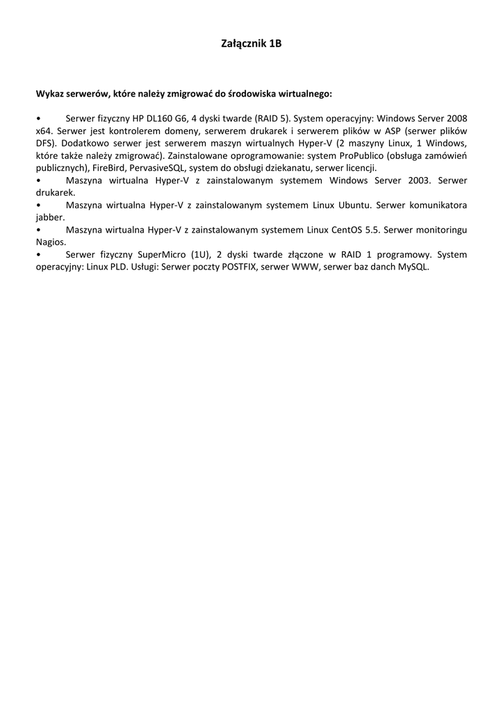 Załącznik 1B Wykaz serwerów, które należy zmigrować do środowiska wirtualnego: • Serwer fizyczny HP DL160 G6, 4 dyski twarde (RAID 5). System operacyjny: Windows Server 2008 x64. Serwer jest kontrolerem domeny, serwerem drukarek i serwerem plików w ASP (serwer plików DFS). Dodatkowo serwer jest serwerem maszyn wirtualnych Hyper-V (2 maszyny Linux, 1 Windows, które także należy zmigrować). Zainstalowane oprogramowanie: system ProPublico (obsługa zamówień publicznych), FireBird, PervasiveSQL, system do obsługi dziekanatu, serwer licencji. • Maszyna wirtualna Hyper-V z zainstalowanym systemem Windows Server 2003. Serwer drukarek. • Maszyna wirtualna Hyper-V z zainstalowanym systemem Linux Ubuntu. Serwer komunikatora jabber. • Maszyna wirtualna Hyper-V z zainstalowanym systemem Linux CentOS 5.5. Serwer monitoringu Nagios. • Serwer fizyczny SuperMicro (1U), 2 dyski twarde złączone w RAID 1 programowy. System operacyjny: Linux PLD. Usługi: Serwer poczty POSTFIX, serwer WWW, serwer baz danch MySQL.