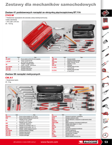 Zestawy dla mechaników samochodowych Zestaw 41 podstawowych narzędzi ze skrzynką pięcioczęściową BT.11A 2143.M • Podstawowe wyposażenie dla warsztatu szkoły średniej technicznej i szkoły zawodowej. • 470 x 220 x 215 mm. D : 10,5 kg. F 44.JE8T Ilość 8 J.431AP 19 AR 3 181.25CPE 192.16G 187.16G 1 1 1 Opis Klucze płaskie od 8 do 24 mm w saszetce Zestaw nasadek L 3/8" od 7 do 24 mm i akcesoria Wkrętaki z okrągłym grotem 3,5x75 - 5,5x100 - 6,5x150 mm Szczypce nastawne Szczypce tnące boczne Szczypce uniwersalne F 188.16G 501 200.F30 249 263.18 Ilość 1 1 1 2 1 B.J16A1 1 B.J21A1 1 Szczypce płaskie Szczypce zaciskowe długie Młotek "francuski" 30 mm Wybijaki 2 i 4 mm Przecinak Nasadka krótka do świec 16 mm L 3/8" Nasadka krótka do świec 21 mm L 3/8" Opis Zestaw 69 narzędzi metrycznych CM.A1 • Dostarczane luzem. D : 9 kg. F 440.JE11 440 Ilość 11 2 AN 2 ANF 2 ANP AND AV.BT1 181.25CPE 192.16G 187.18G 185.20G 2 2 1 1 1 1 1 Opis Klucze oczkowo-płaskie od 7 do 19 mm Klucze oczkowo-płaskie od 22 do 24 mm Wkrętaki do śrub z rowkiem od 3,5x100 - 5,5x100 mm Wkrętaki do śrub z rowkiem od 6,5x1500 - 8x200 mm Wkrętaki do śrub PhillipsJ PH 1 i 2 Wkrętaki do śrub PozidrivJ PZ 1 i 2 Wkrętak - próbnik napięcia 6 do 24 V Szczypce nastawne z blokadą Szczypce tnące boczne Szczypce uniwersalne Szczypce półokrągłe plik pobrano z www.imbth.com.pl F 475A.20 507A 840.1 205H.50 208A.32AB 248 256.6 263.18 449I 827.1 U.46CL 804 270.A J.430AP www.facom.com Ilość 1 1 1 1 1 3 1 1 1 1 1 1 1 1 Opis Szczypce do pierścieni, przekładalne Szczypce zaciskowe zwarte Nóż dla elektryków z nacięciami do zdejmowania izolacji Młotek Młotek montażowy z końcówkami plastikowymi Wybijaki ekstra długie 2 - 4 - 6 mm Punktak precyzyjny Przecinak Szczypce do zaciskania konektorów Chwytak magnetyczny Klucz nastawny do filtra oleju Szczelinomierz 19 listków Szczotka do świec Zestaw nasadek od 8 do 22 mm 53