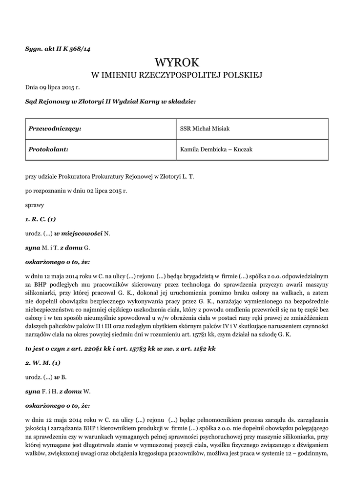 Sygn. akt II K 568/14 WYROK W IMIENIU RZECZYPOSPOLITEJ POLSKIEJ Dnia 09 lipca 2015 r. Sąd Rejonowy w Złotoryi II Wydział Karny w składzie: Przewodniczący: SSR Michał Misiak Protokolant: Kamila Dembicka – Kuczak przy udziale Prokuratora Prokuratury Rejonowej w Złotoryi L. T. po rozpoznaniu w dniu 02 lipca 2015 r. sprawy 1. R. C. (1) urodz. (...) w miejscowości N. syna M. i T. z domu G. oskarżonego o to, że: w dniu 12 maja 2014 roku w C. na ulicy (...) rejonu (...) będąc brygadzistą w firmie (...) spółka z o.o. odpowiedzialnym za BHP podległych mu pracowników skierowany przez technologa do sprawdzenia przyczyn awarii maszyny silikoniarki, przy której pracował G. K., dokonał jej uruchomienia pomimo braku osłony na wałkach, a zatem nie dopełnił obowiązku bezpiecznego wykonywania pracy przez G. K., narażając wymienionego na bezpośrednie niebezpieczeństwa co najmniej ciężkiego uszkodzenia ciała, który z powodu omdlenia przewrócił się na tę część bez osłony i w ten sposób nieumyślnie spowodował u w/w obrażenia ciała w postaci rany ręki prawej ze zmiażdżeniem dalszych paliczków palców II i III oraz rozległym ubytkiem skórnym palców IV i V skutkujące naruszeniem czynności narządów ciała na okres powyżej siedmiu dni w rozumieniu art. 157§1 kk, czym działał na szkodę G. K. to jest o czyn z art. 220§1 kk i art. 157§3 kk w zw. z art. 11§2 kk 2. W. M. (1) urodz. (...) w B. syna F. i H. z domu W. oskarżonego o to, że: w dniu 12 maja 2014 roku w C. na ulicy (...) rejonu (...) będąc pełnomocnikiem prezesa zarządu ds. zarządzania jakością i zarządzania BHP i kierownikiem produkcji w firmie (...) spółka z o.o. nie dopełnił obowiązku polegającego na sprawdzeniu czy w warunkach wymaganych pełnej sprawności psychoruchowej przy maszynie silikoniarka, przy której wymagane jest długotrwałe stanie w wymuszonej pozycji ciała, wysiłku fizycznego związanego z dźwiganiem wałków, zwiększonej uwagi oraz obciążenia kręgosłupa pracowników, możliwa jest praca w systemie 12 – godzinnym, po czym z systemu 8 – godzinnego dnia pracy wprowadził ustnie wbrew regulaminowi pracy i umowy o pracę z G. K., 12 godzinny system pracy nie gwarantujący bezpiecznego wykonywania pracy, narażając w ten sposób G. K. pracującego przy silikoniarce na bezpośrednie niebezpieczeństwo co najmniej ciężkiego uszkodzenia ciała i w ten sposób doprowadził wymienionego w dniu 12 maja 2014 roku do omdlenia i upadku na maszynę silikoniarkę w miejscu wałków bez osłony nieumyślnie powodując u G. K. obrażenia ciała w postaci rany ręki prawej ze zmiażdżeniem dalszych paliczków palców II i III oraz rozległym ubytkiem palców IV i V skutkujące naruszeniem czynności narządów ciała na okres powyżej siedmiu dni w rozumieniu art. 157§1 kk, czym działał na szkodę G. K. to jest o czyn z art. 220§1 kk i art. 157§3 kk w zw. z art. 11§2 kk I uniewinnia oskarżonych R. C. (1) i W. M. (1) od popełnienia zarzucanych im czynów; II na podstawie art. 632 pkt 2 kpk koszty procesu zalicza na rachunek Skarbu Państwa. Sygn. akt IIK 568/14 UZASADNIENIE Sąd ustalił następujący stan faktyczny sprawy: G. K. pracuje w firmie Zakład Produkcji (...) spółka z o.o. w C. od 2013 r. Od kwietnia 2014 r. pracuje przy obsłudze maszyny prototypowej, silikonującej papier, tzw. nowej silikoniarce. Gdy rozpoczął pracę przy tej maszynie, w zakładzie pracy na mocy decyzji prezesa zarządu spółki G. C., wprowadzono w miejsce ośmiogodzinnego systemu pracy dwunastogodzinny system pracy. Zmiana ta nie została przeprowadzona w sposób zgodny z przepisami prawa pracy. Pracownicy produkcji pracowali po dwanaście godzin przez trzy dni w tygodniu (kolejnego tygodnia przez cztery dni, choć czasem w czwarty dzień praca trwała osiem godzin) a pozostałe dni tygodni mieli wolne. Za sprawność maszyn jest odpowiedzialny kierownik utrzymania ruchu Z. K. (1). Zasadniczo przy obsłudze nowej silikoniarki pracują dwie osoby. Praca ta jest w większości zautomatyzowana, tj. polega na obsłudze maszyny, nadzorowaniu, po uprzednim wprowadzeniu zadań, procesu produkcji. Pracownicy muszą przygotować odpowiednią mieszankę silikonu, umieścić ją w odpowiednim pojemniku, załadować odpowiedni papier (wykonuje się to za pomocą suwnicy, a zatem bez użycia siły fizycznej), pracownicy ręcznie zakładają jedynie wał (tzw. sztangę) w belę papieru, sztanga waży 44 kg, zakładana jest przez dwóch pracowników (wykonywane jest to w pozycji pochylonej). Czynności te wykonywane są w czasie zmiany kilka razy (bela papieru silikonuje się nie mniej niż godzinę), a częściej gdy silikonowane są próbki papieru. W czasie silikonowania pracownicy kontrolują ten proces, przemieszczając się przy maszynie i obserwując jej pracę. Mogą na chwilę usiąść przy znajdujących się przy maszynie krzesełkach. Z uwagi na prototypowy charakter maszyny, pracownicy w praktyce uczyli się jej obsługi, dobierania odpowiednich mieszanek silikonowych do określonego rodzaju papieru, co powodowało, iż czasami dochodziło do rwania się papieru. W takich przypadkach często pomagał, na co dzień pracujący przy innej maszynie, brygadzista R. C. (1). Na koniec pracy pracownicy czyścili wałki z silikonu, co odbywało się przy maszynie wyłączonej z produkcji, gdy poruszające się wałki były od siebie oddalone i trwało półgodziny do godziny, a czasami piętnaście minut. Czyszczenie wałków rozpoczynało się od przednich wałków, a kończyło na tylnych (przy których znajdował się przed zdarzeniem G. K.). Użycia siły i pochylonej pozycji ciała wymagało wyczyszczenie pojemnika na silikon, co także miało miejsce kilka razy na zmianę, ale trwało jednorazowo do 15 minut. Temperatura powietrza przy tej maszynie kształtowała się w granicach do 25º C. Taki rodzaj pracy może wpływać na stan organizmu ludzkiego w ten sposób, że w